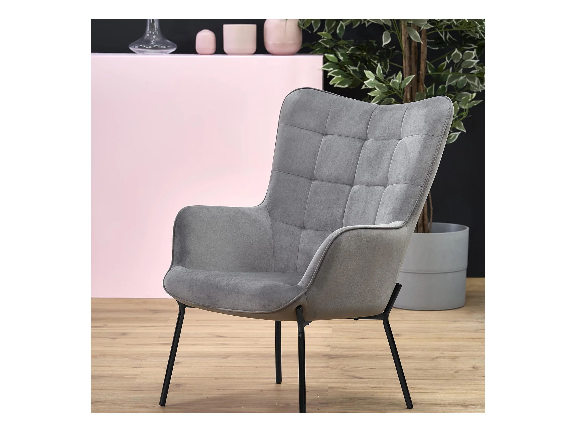 Sillón de terciopelo gris con respaldo acolchado y patas de acero negro GIPSY