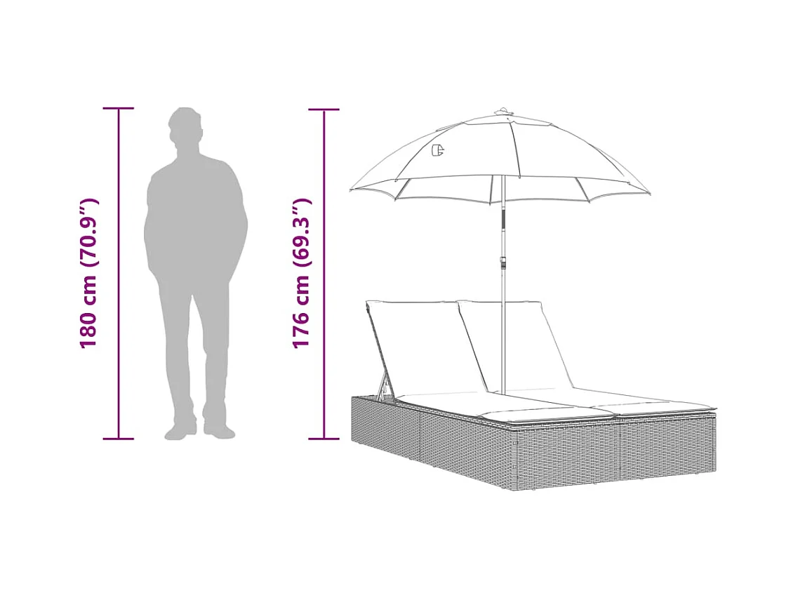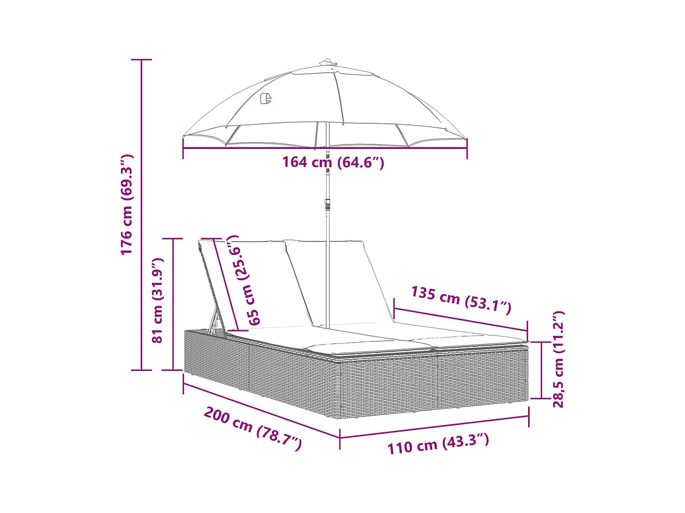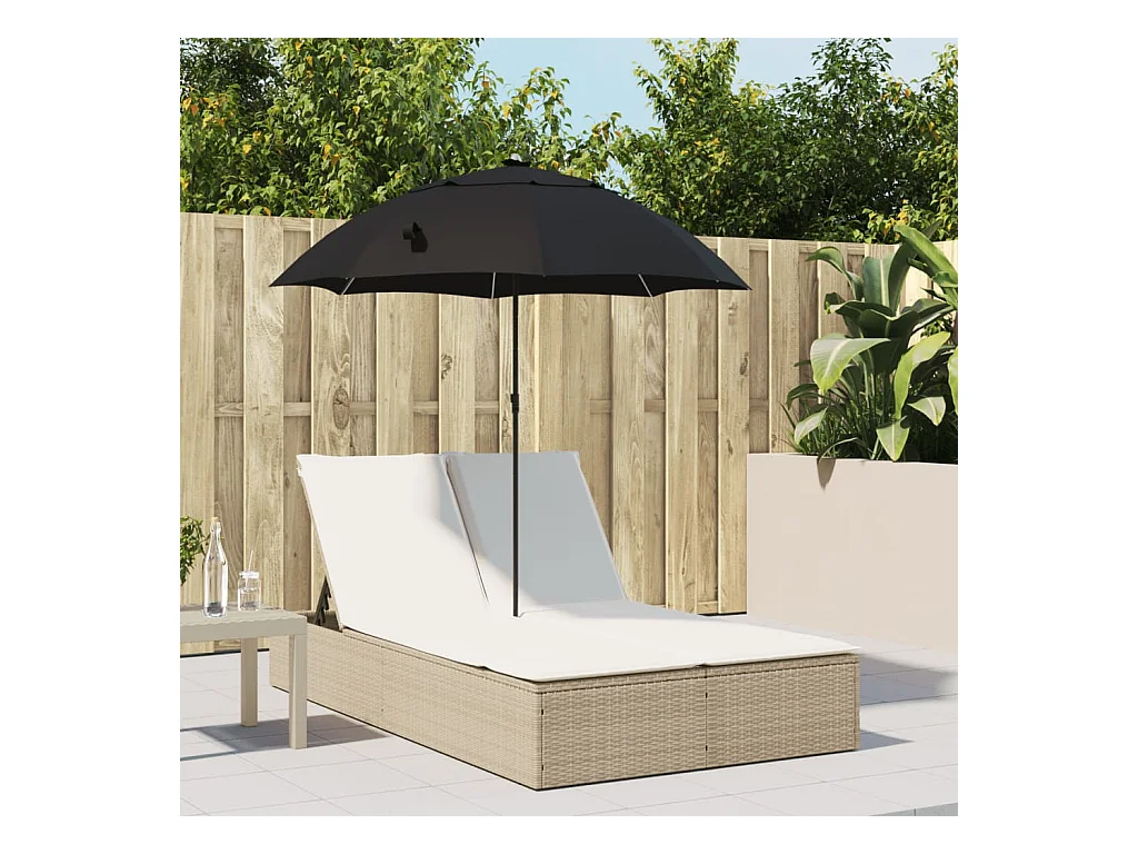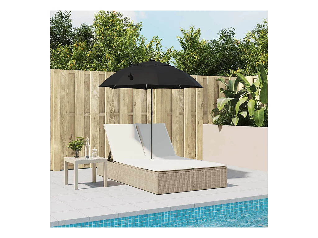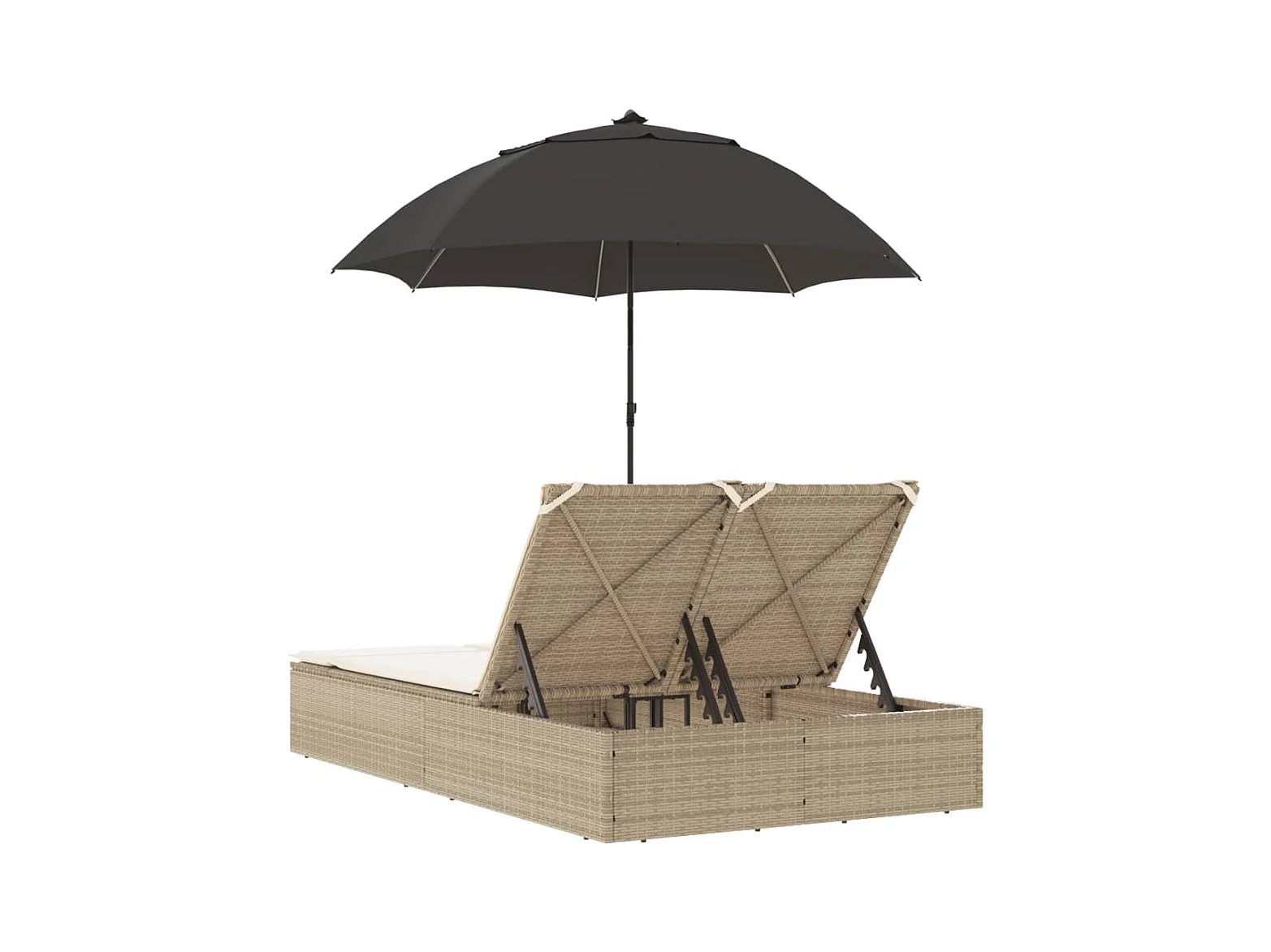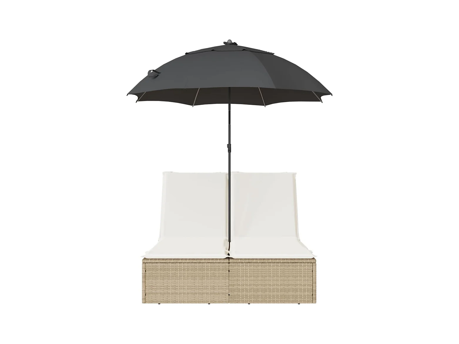 Sillón doble con cojines y sombrilla de polirratán beige.
