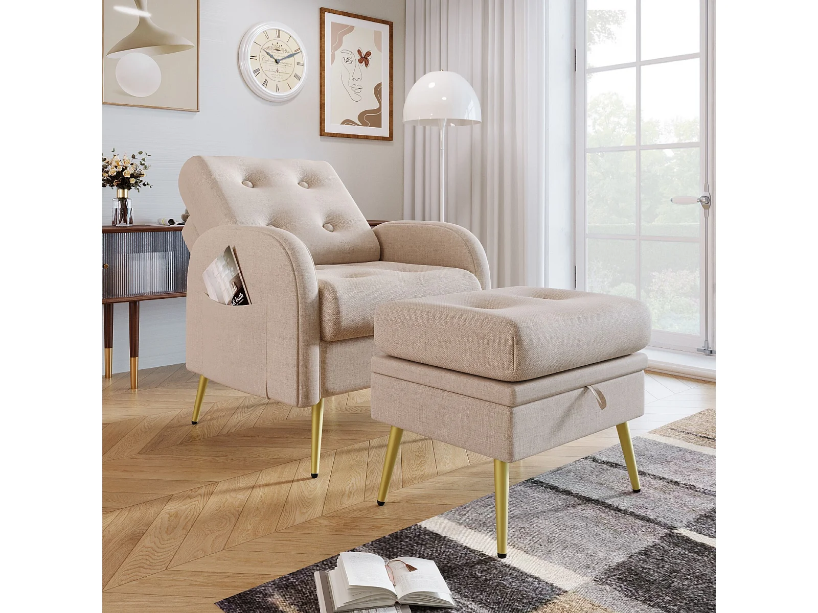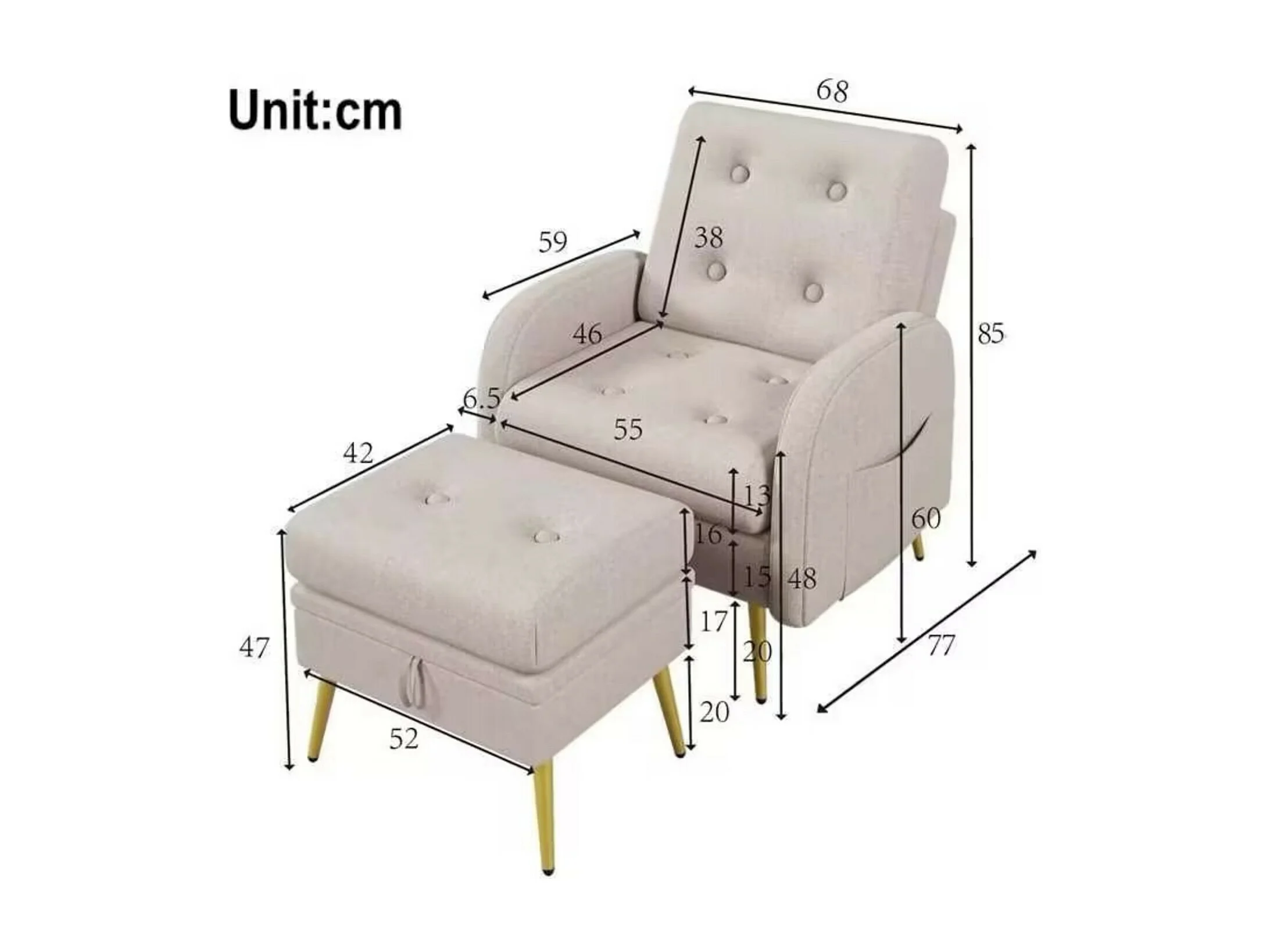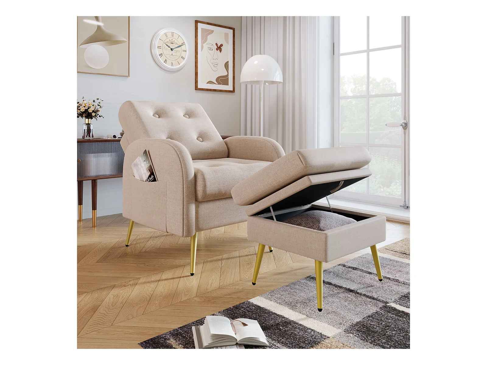 Sillón en tela de polipropileno, con pouffe de almacenamiento, ajustable en 3 niveles, 68x77x85cm, beige