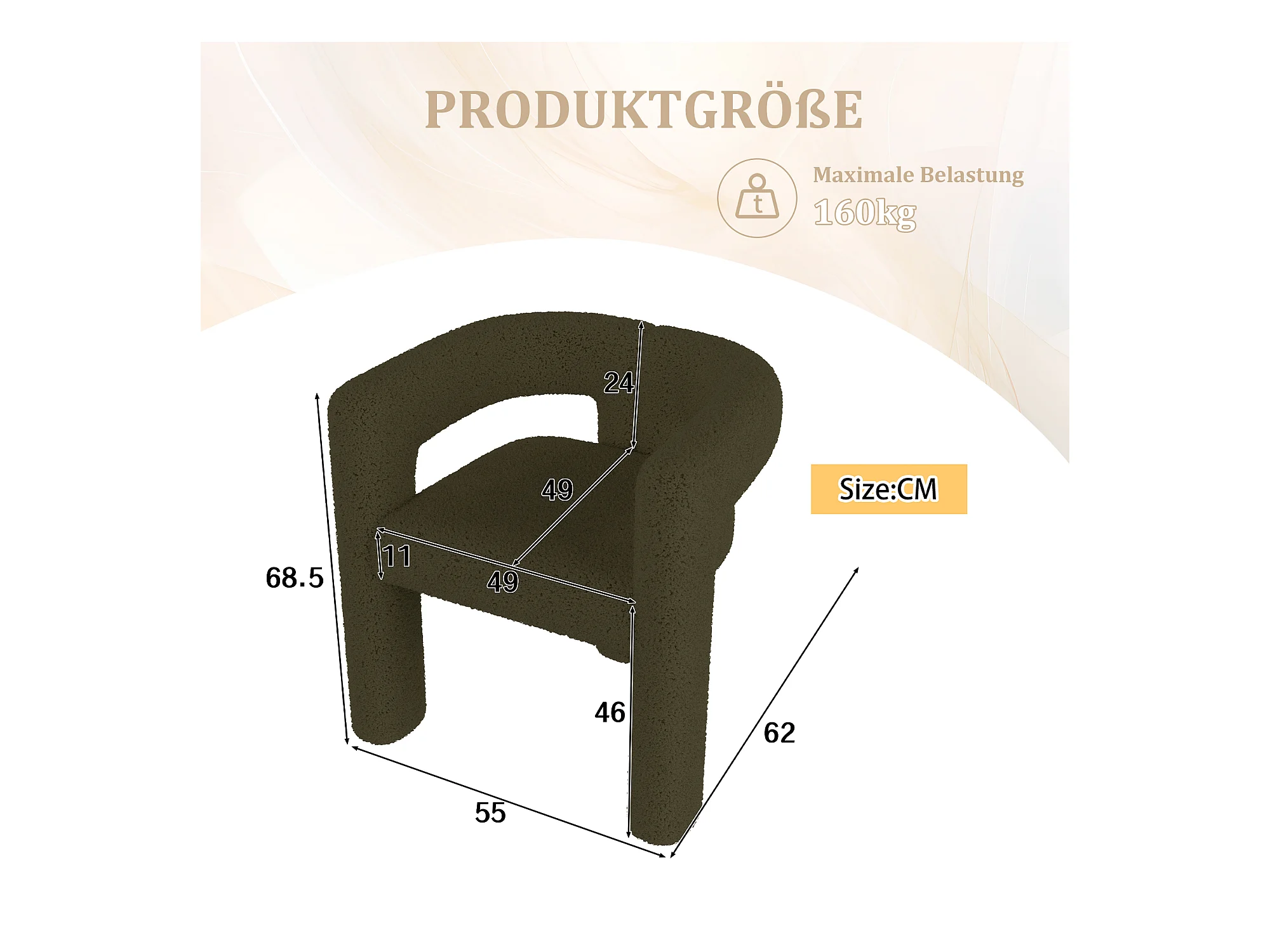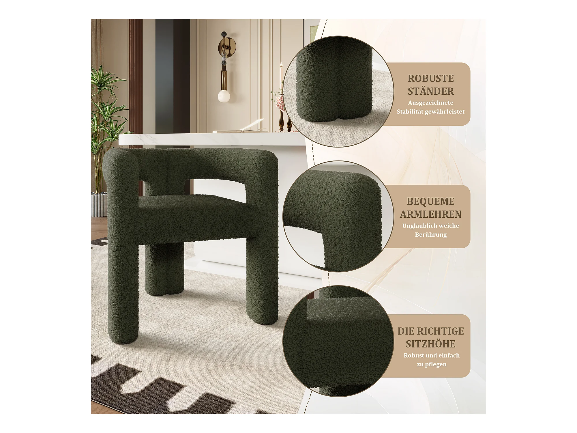 Sillón de tela con respaldo curvo y patas de metal verde kaki