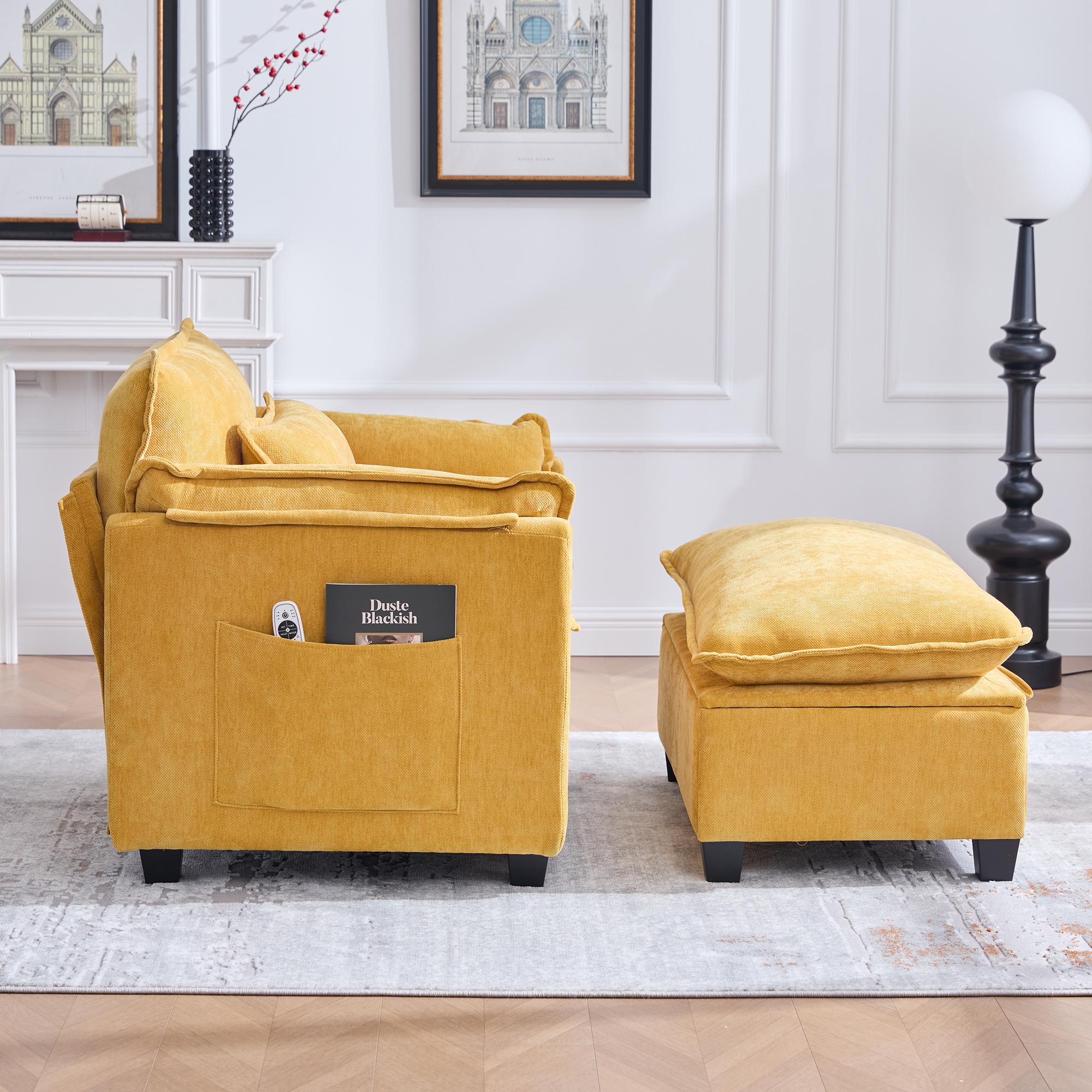 Sillón con puf giratorio de terciopelo amarillo para salón, 72x80x101 cm