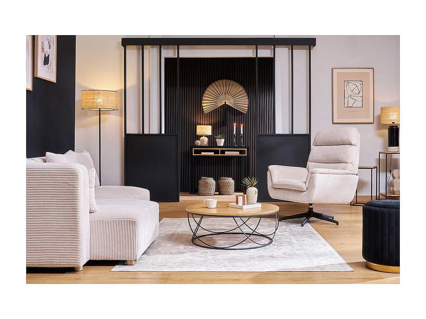 Sillón giratorio de tela chenilla beige y metal negro JONAH
