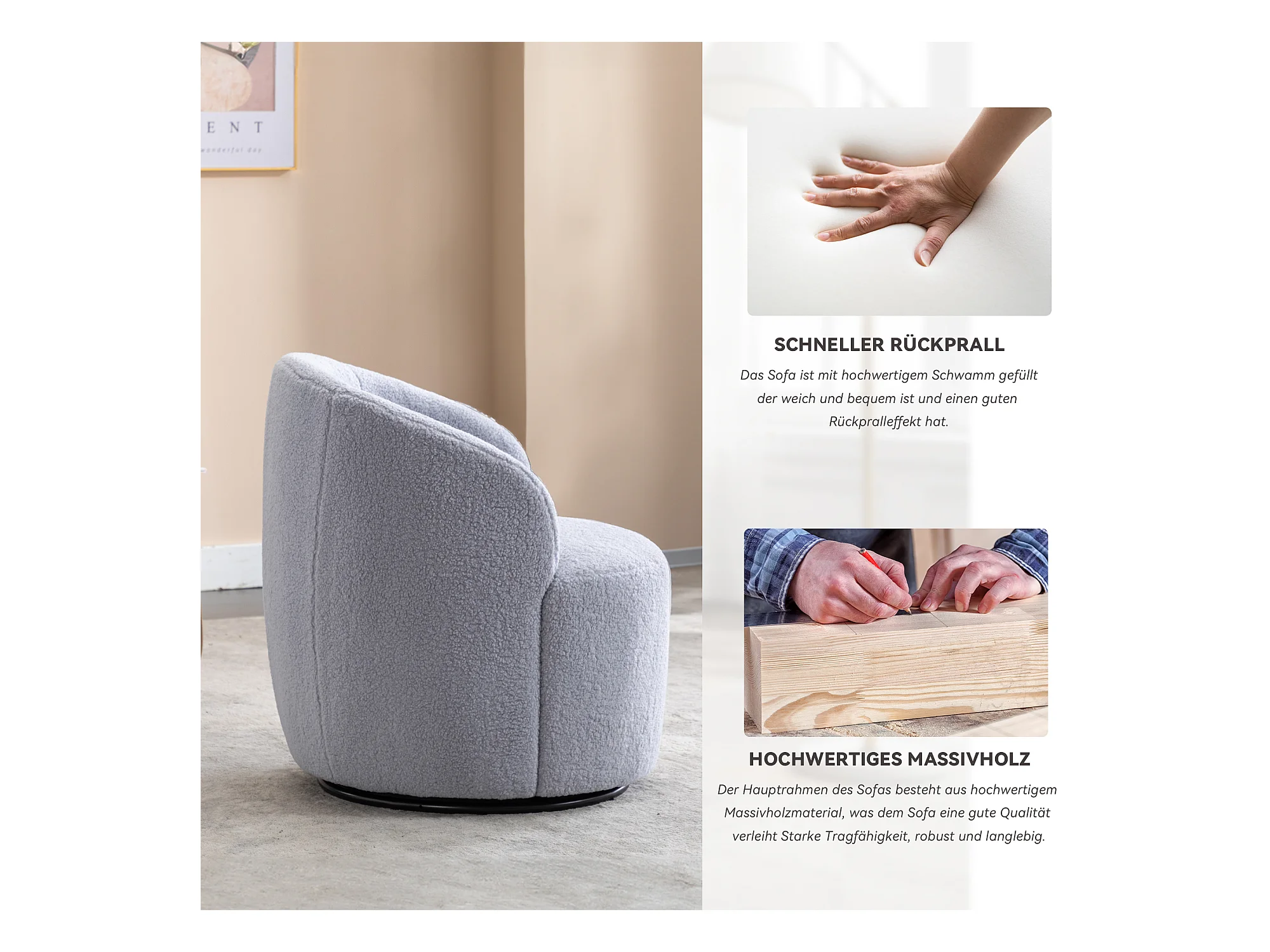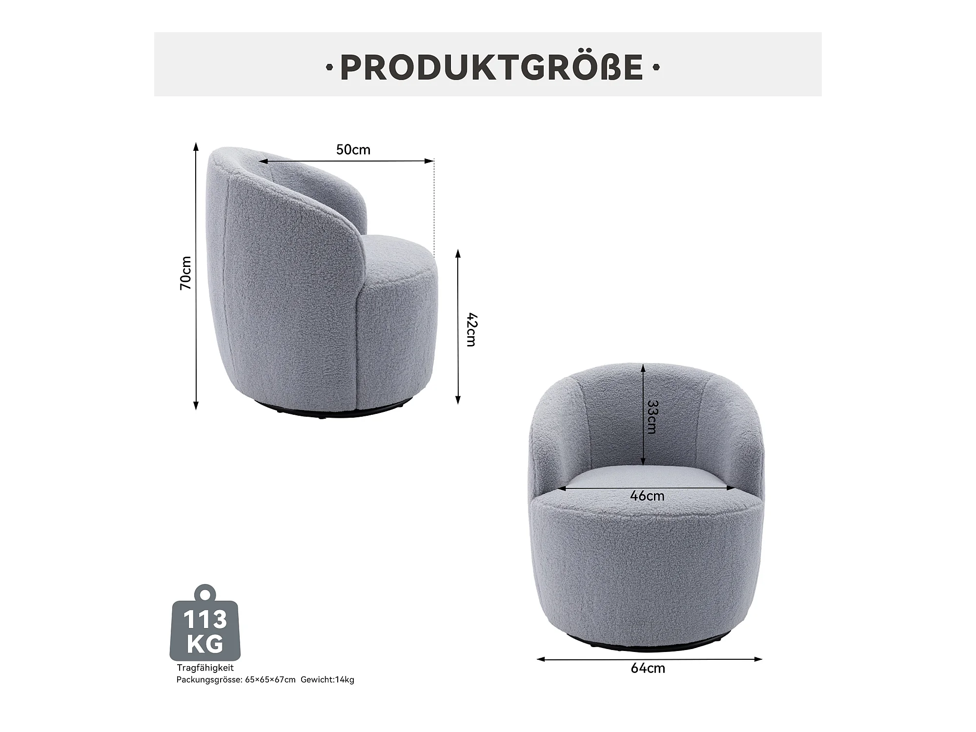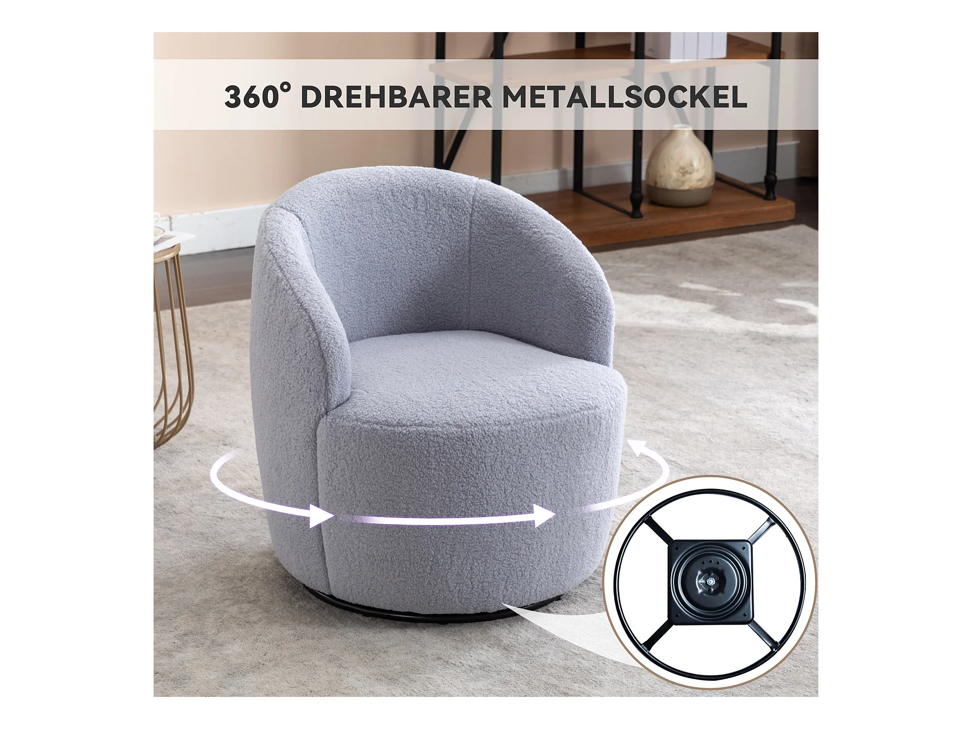 Sillón giratorio de tela Tejido de felpa, diseño de huevo, con base de metal negro, gris claro (62x63x69,5 cm)