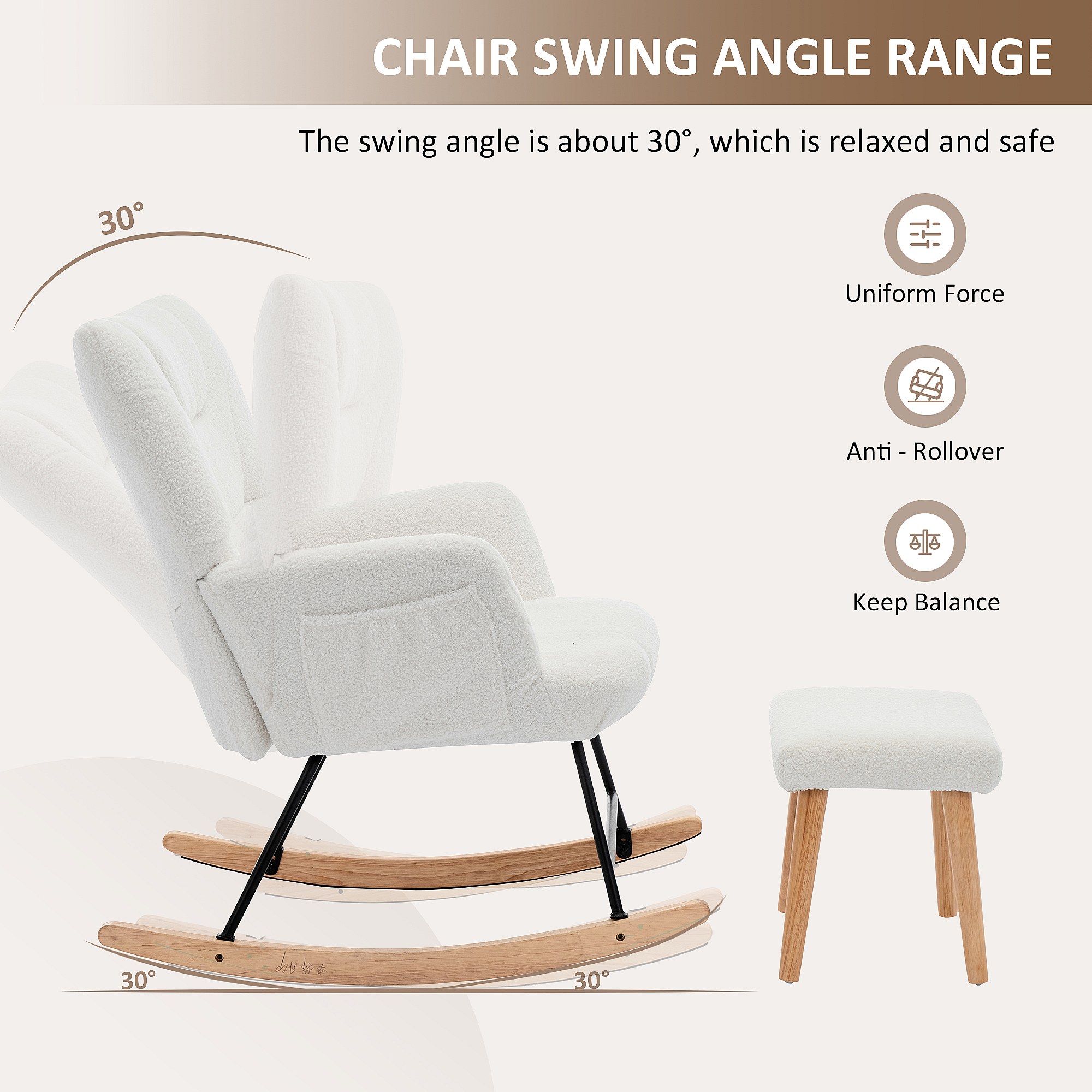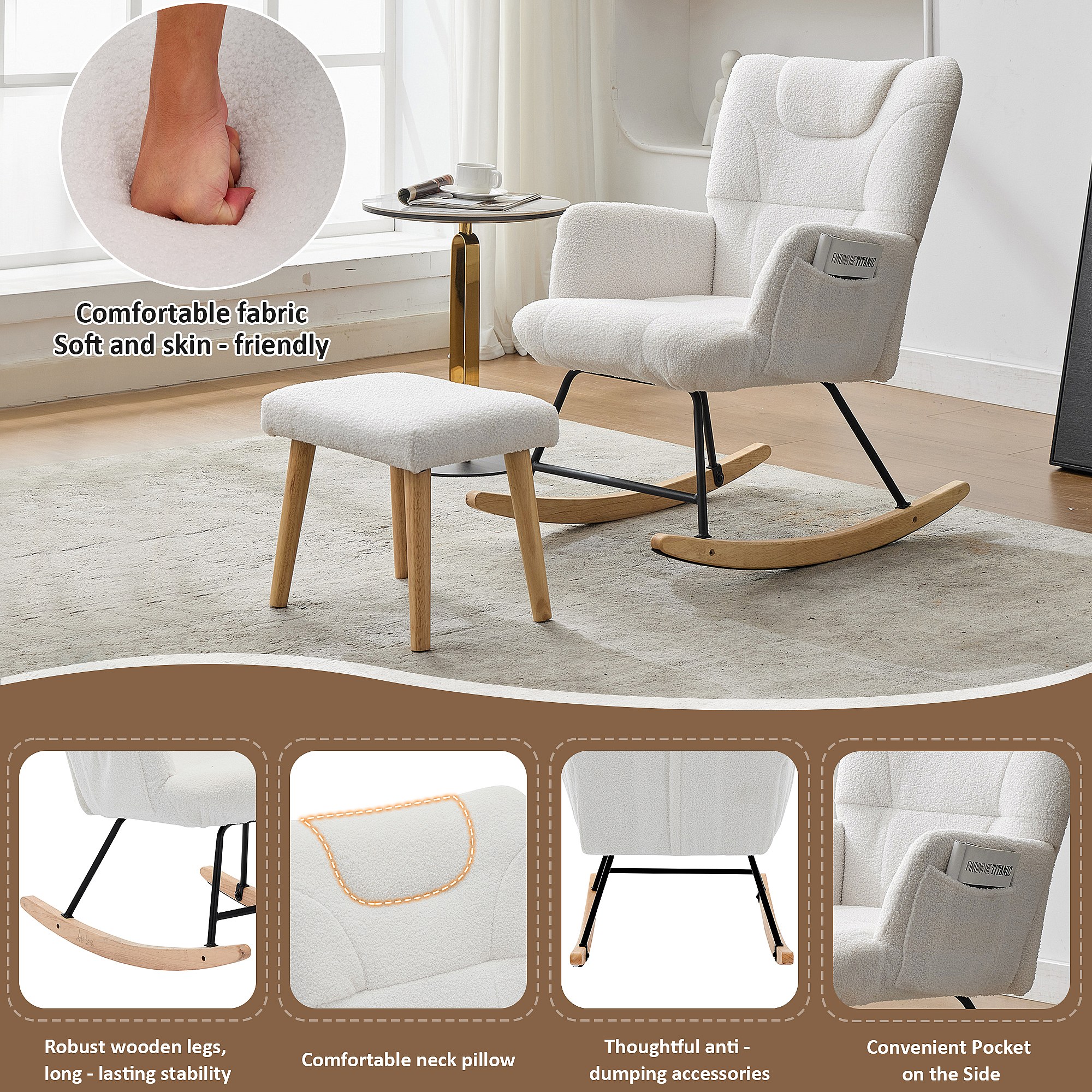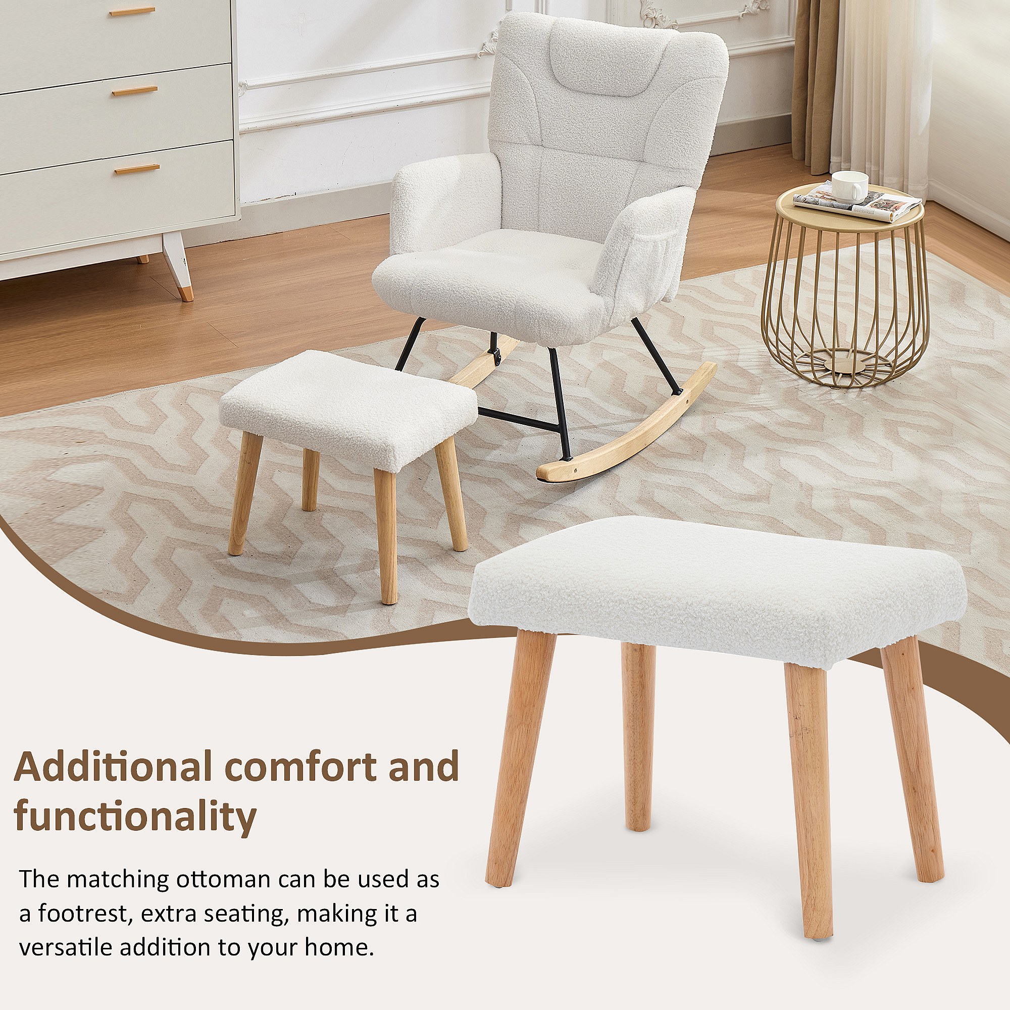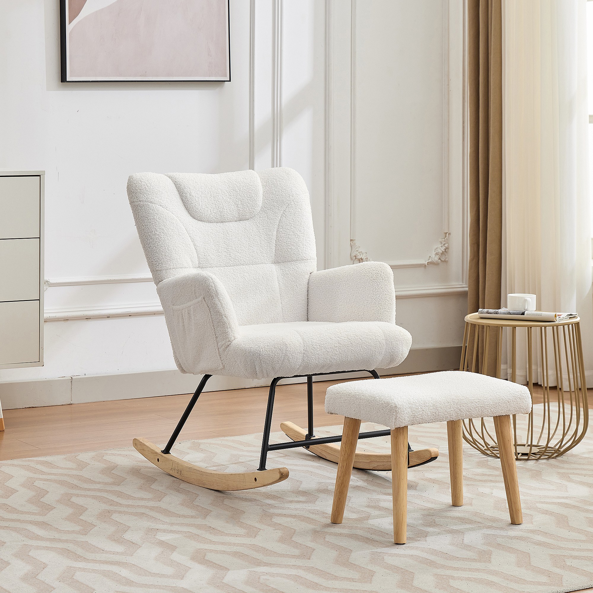 Sillón mecedor 65x88x87 cm - con reposapiés y respaldo alto - Balanceo de 30° - con bolsillos - Blanco