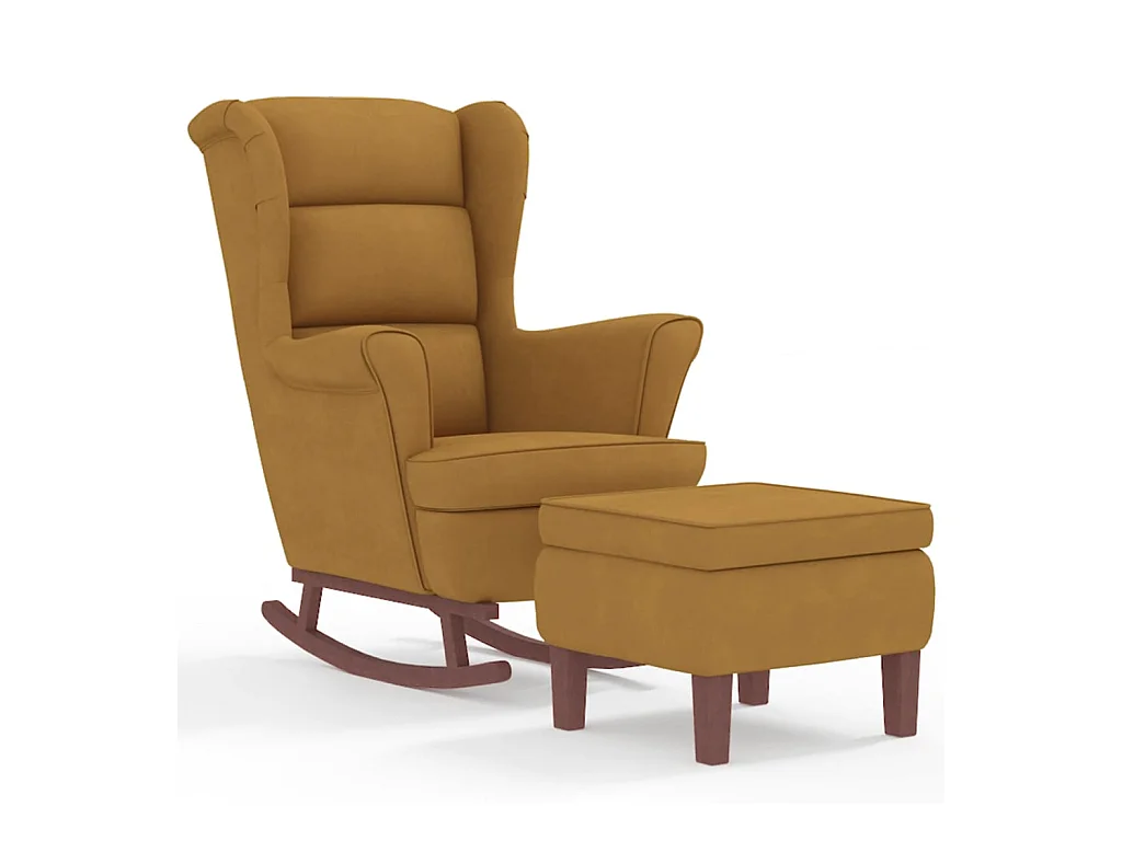 Sillón mecedora patas madera y taburete terciopelo marrón