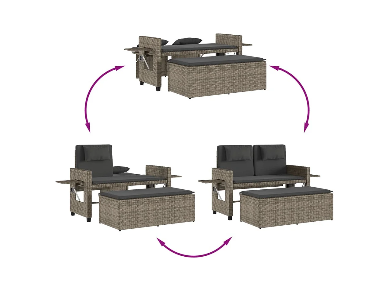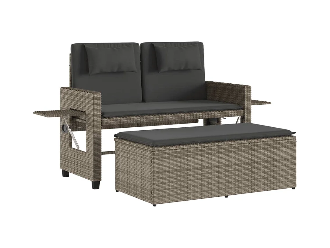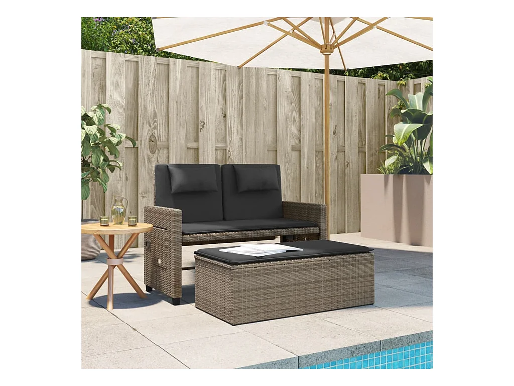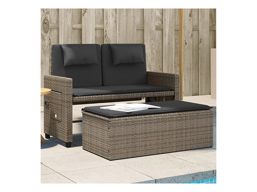Banco de jardín con cojines y reposapiés ratán sintético gris