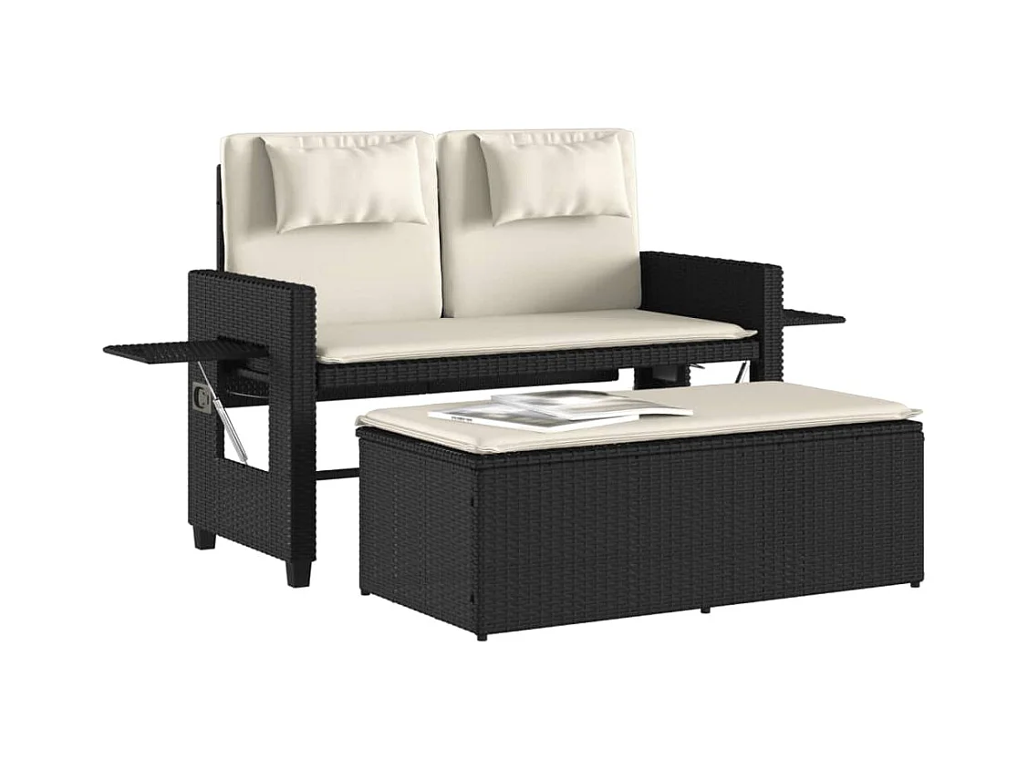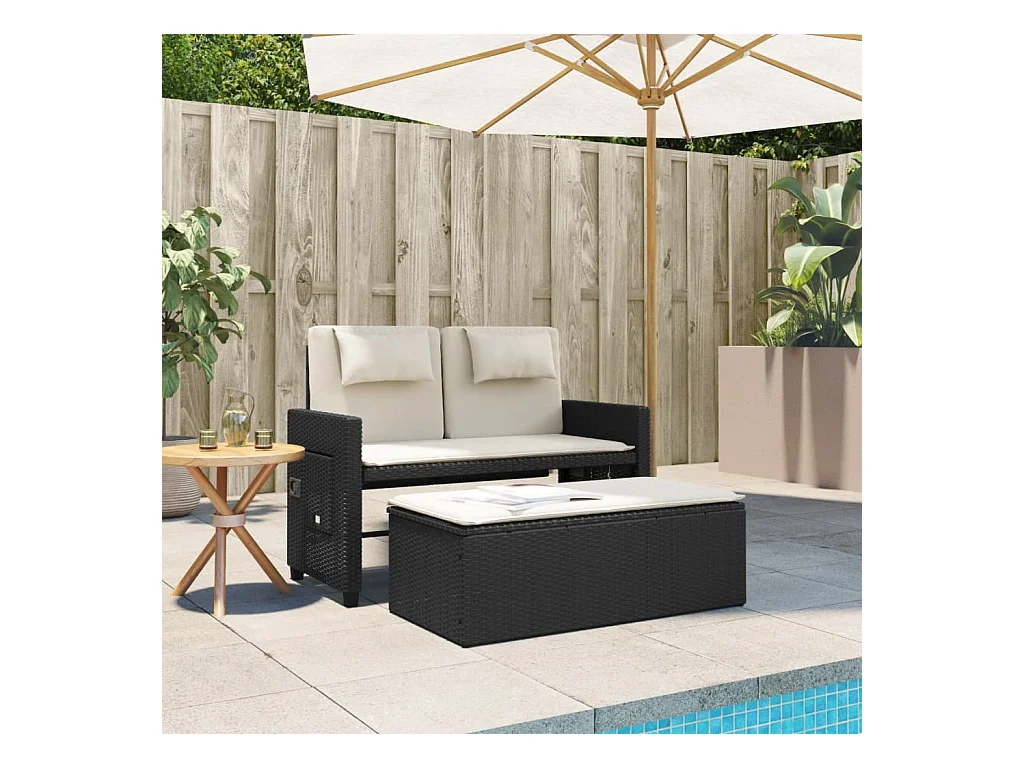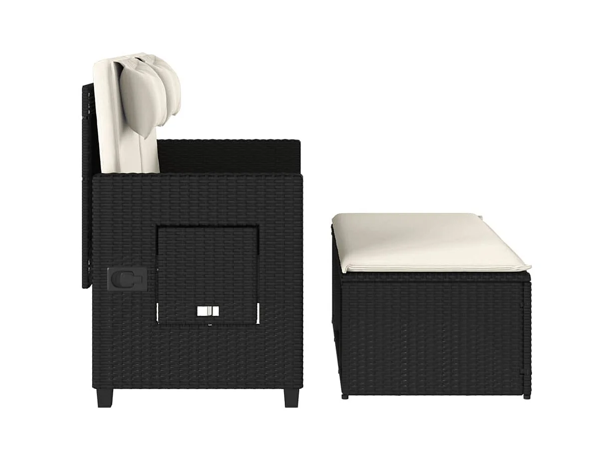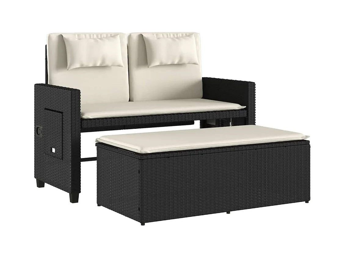Banco de jardín con cojines y reposapiés ratán sintético negro