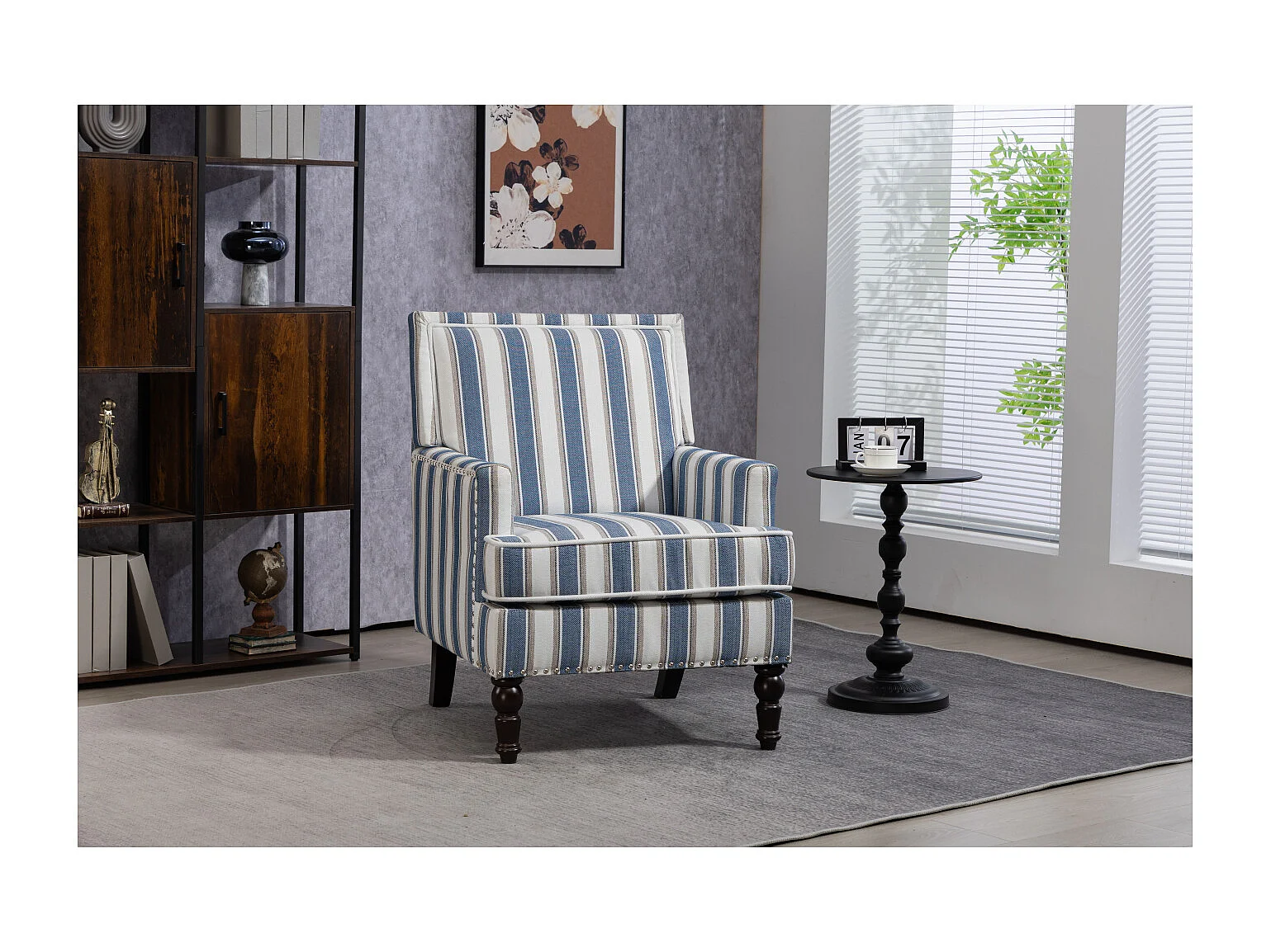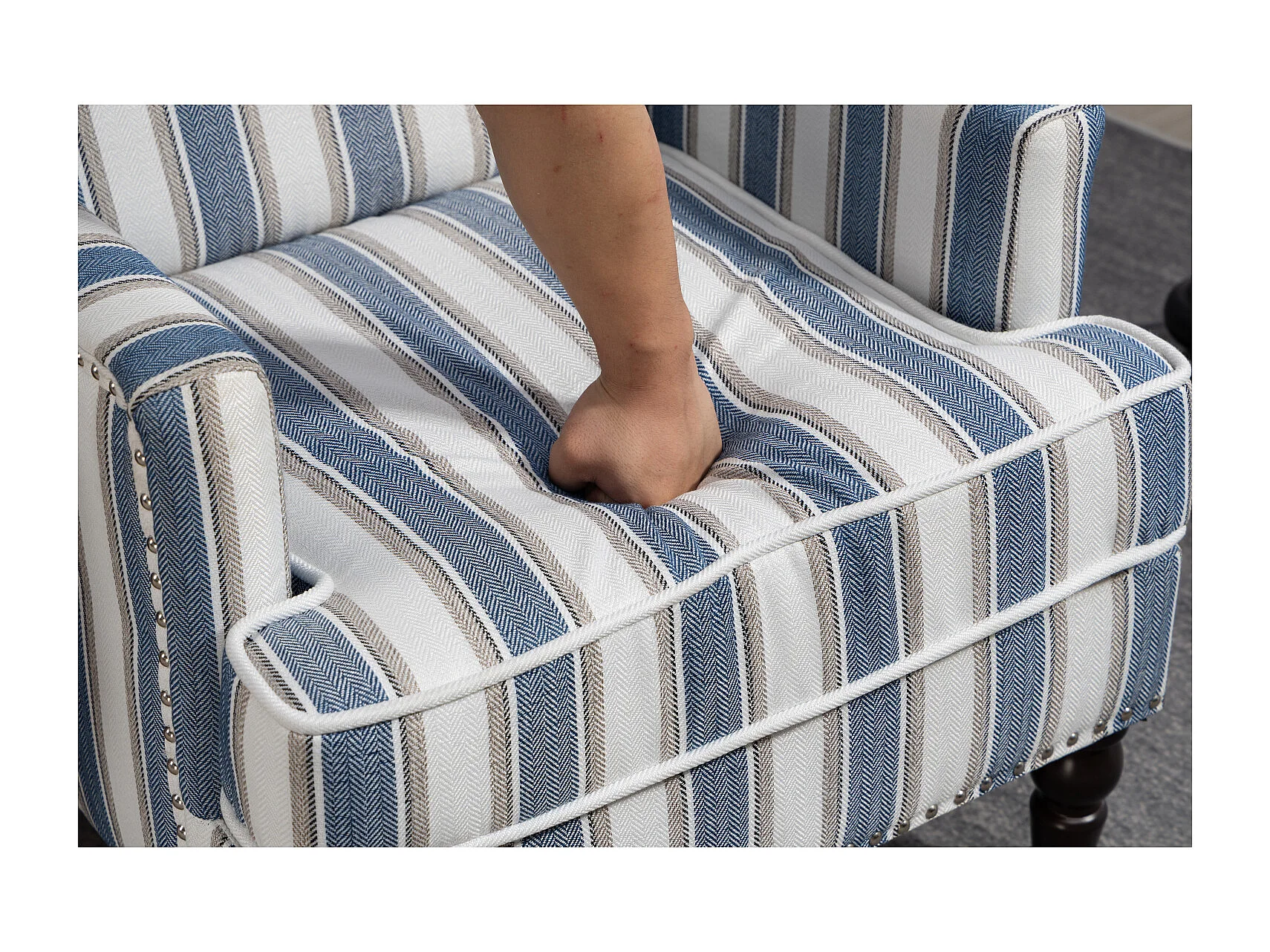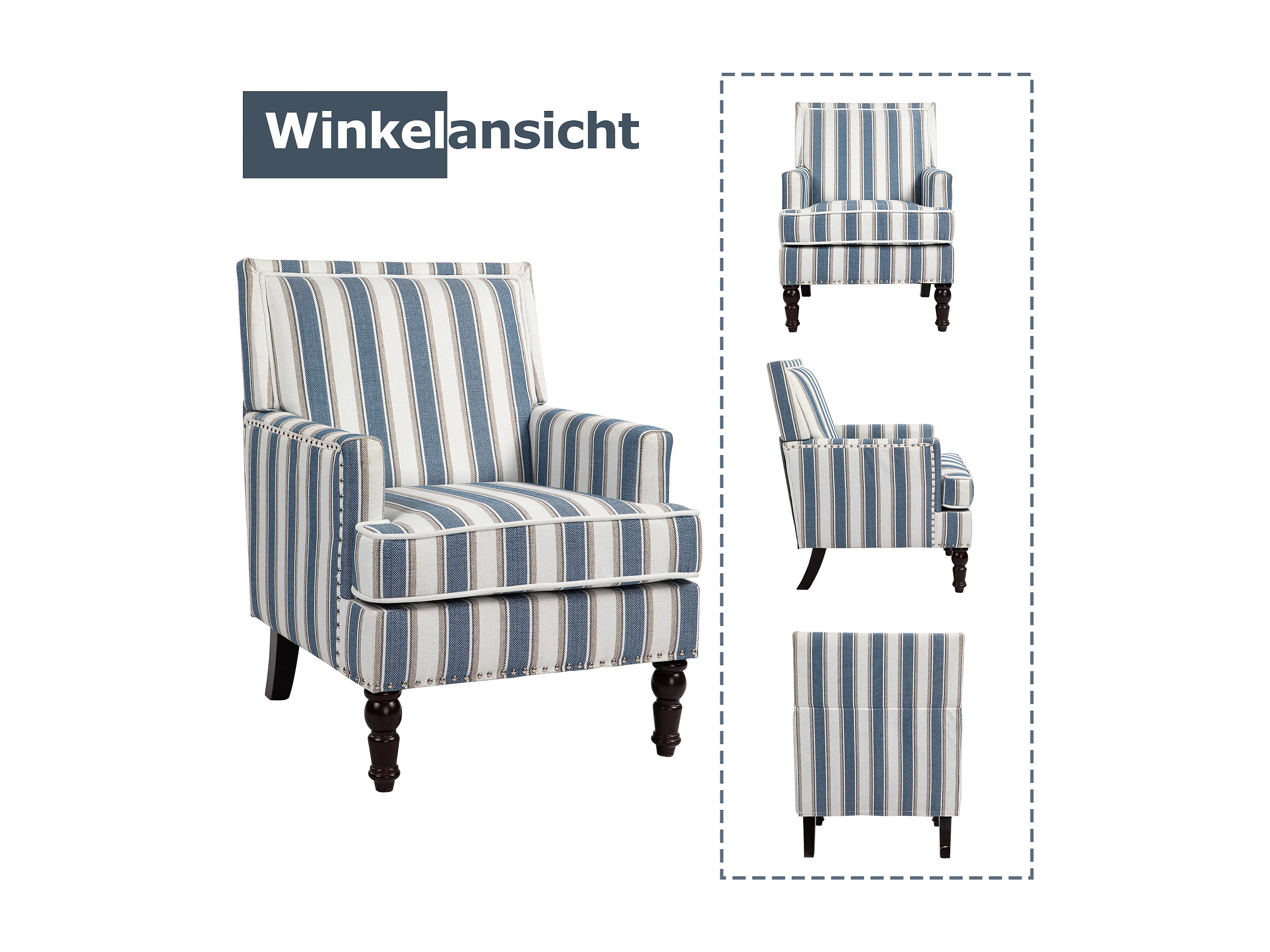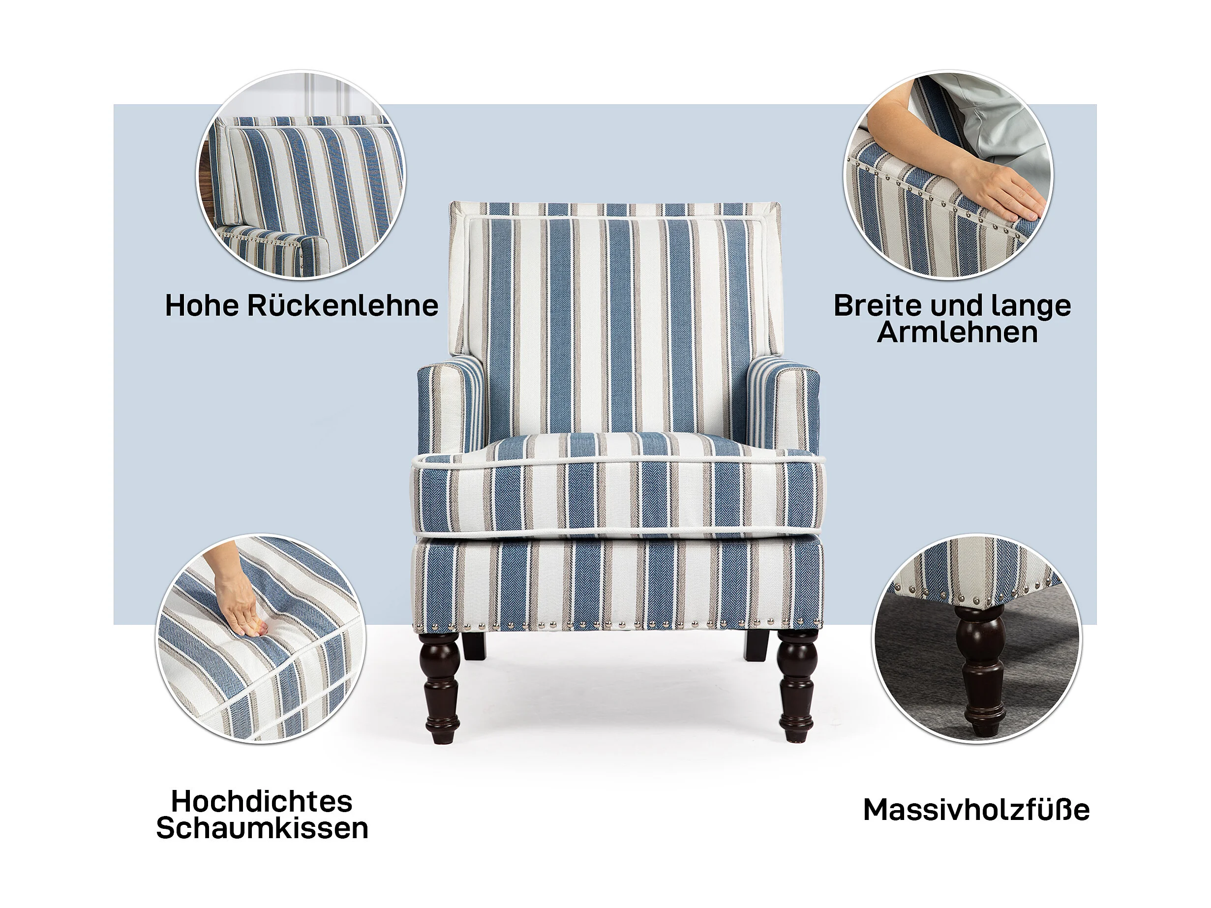 Sillón sencillo de algodón y lino a rayas azules y blancas, patas de madera.