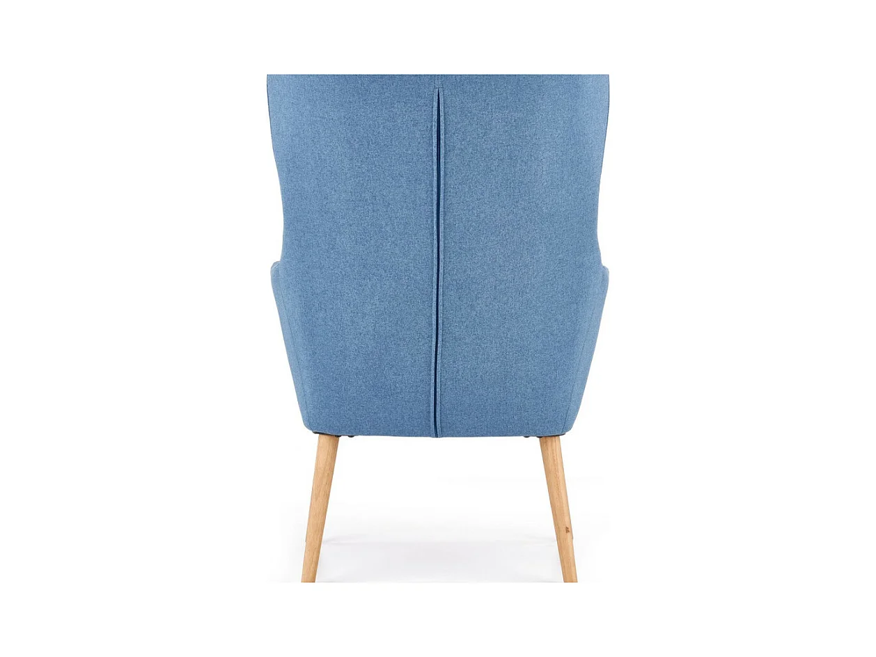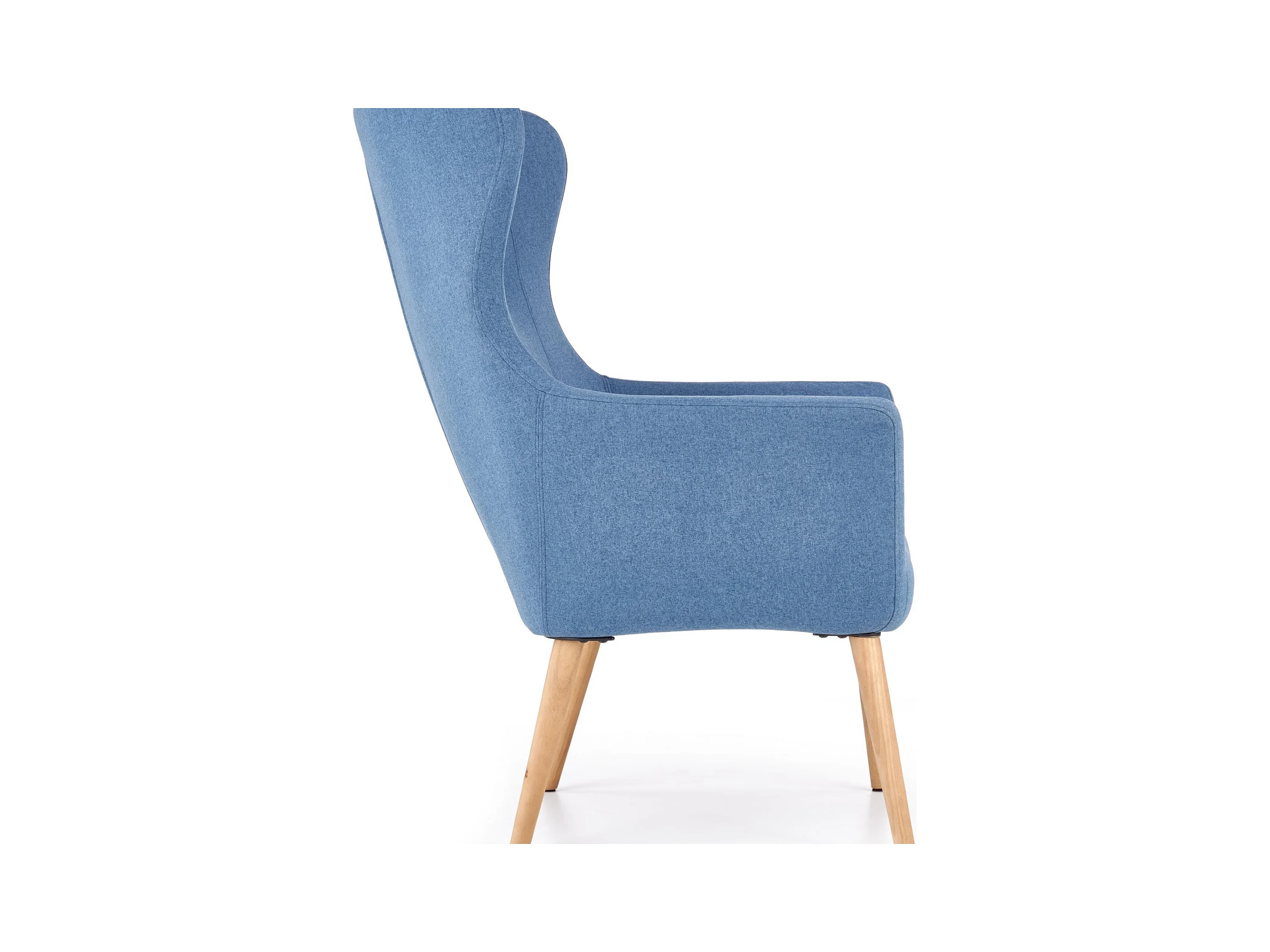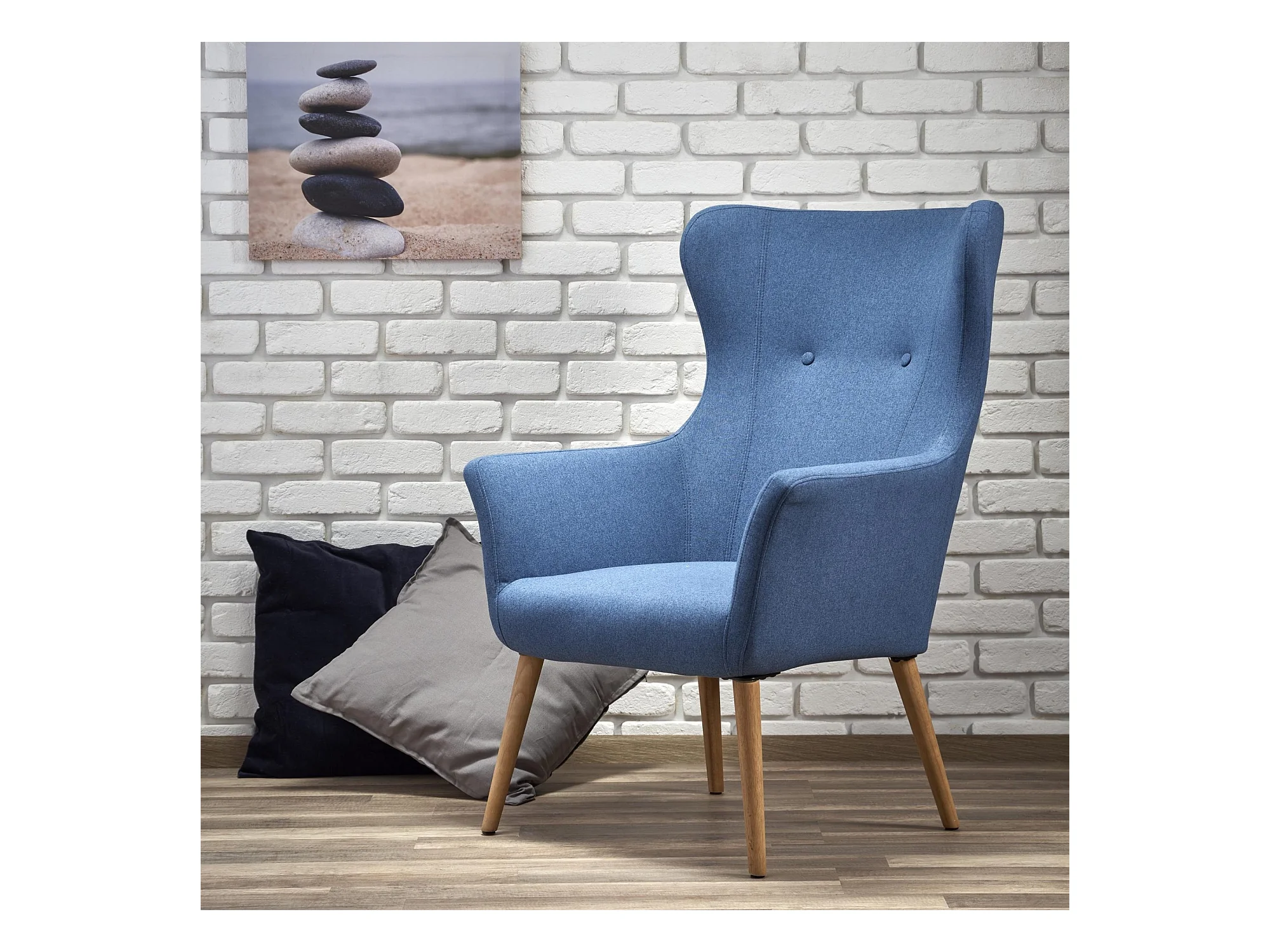 Sillón tapizado en tela azul con respaldo alto y patas de madera de caucho WISH
