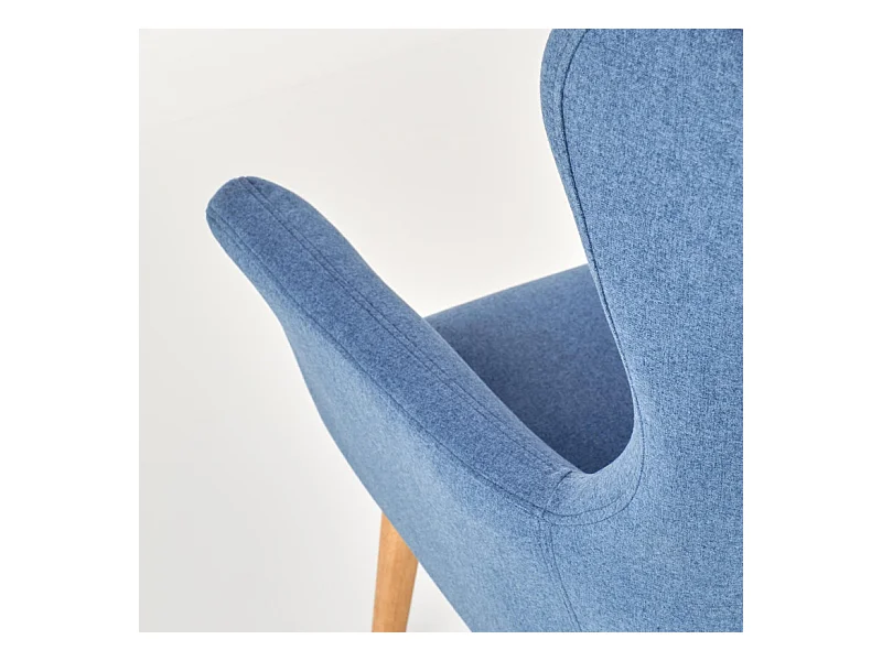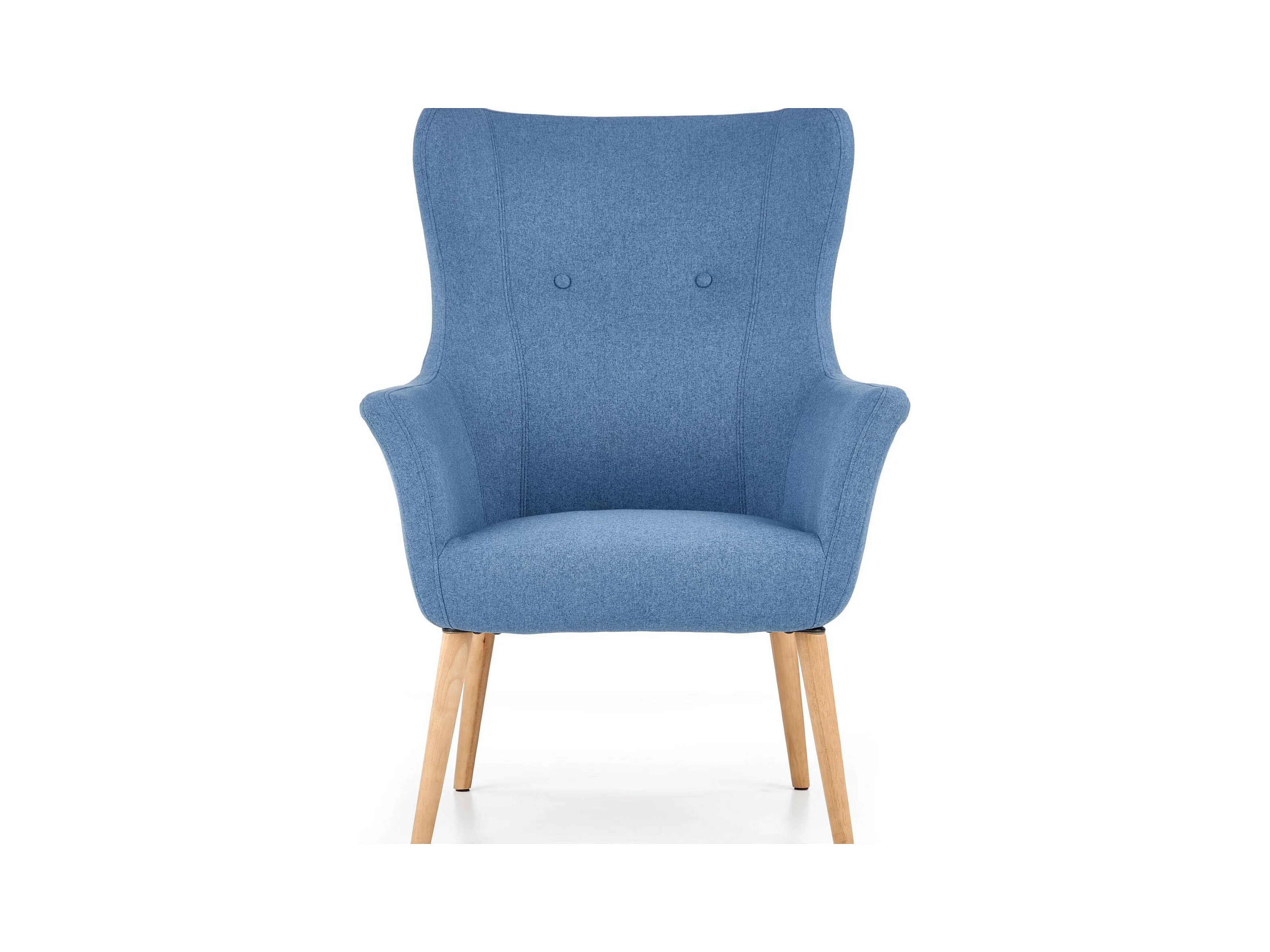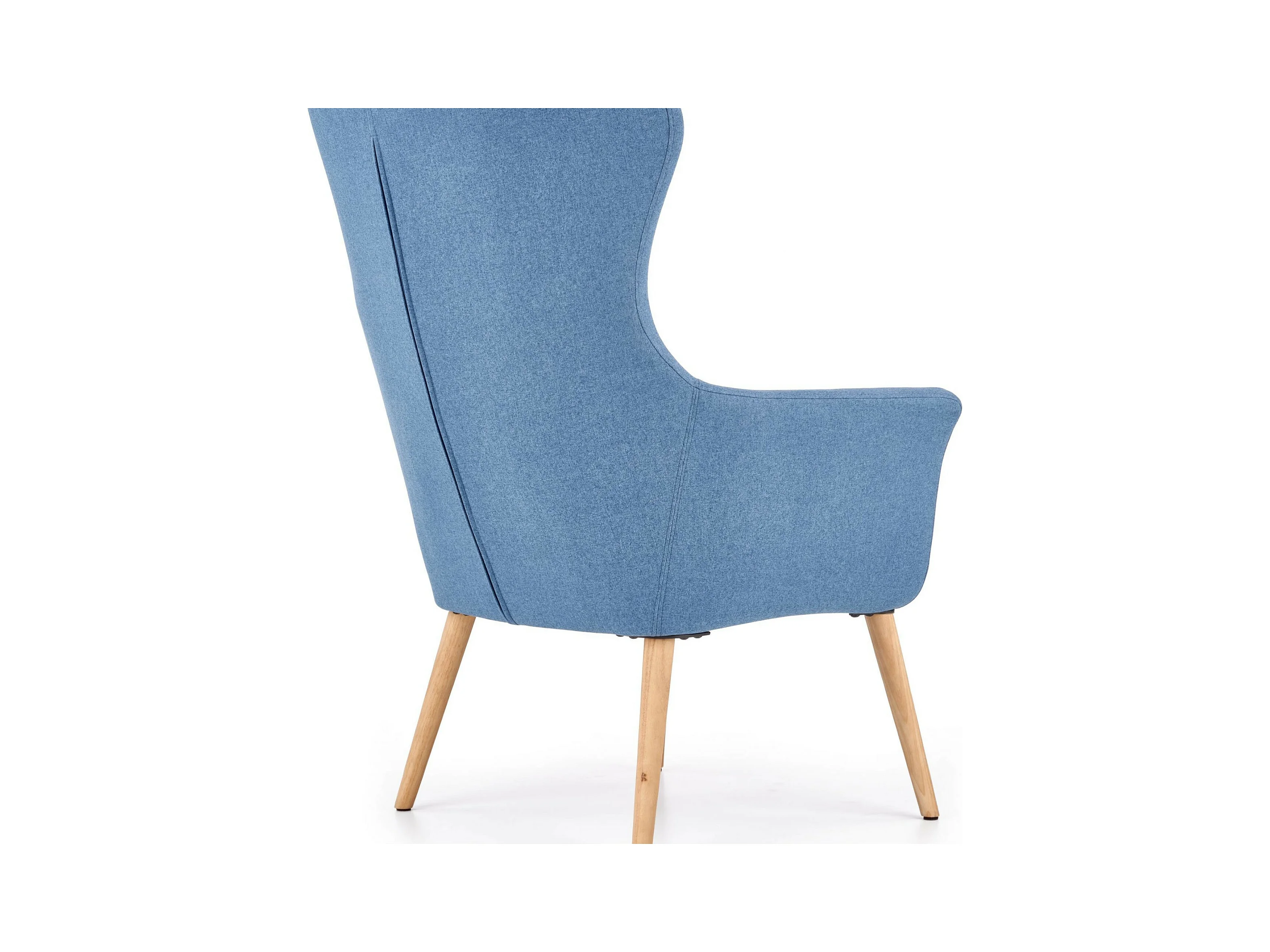 Sillón tapizado en tela azul con respaldo alto y patas de madera de caucho WISH