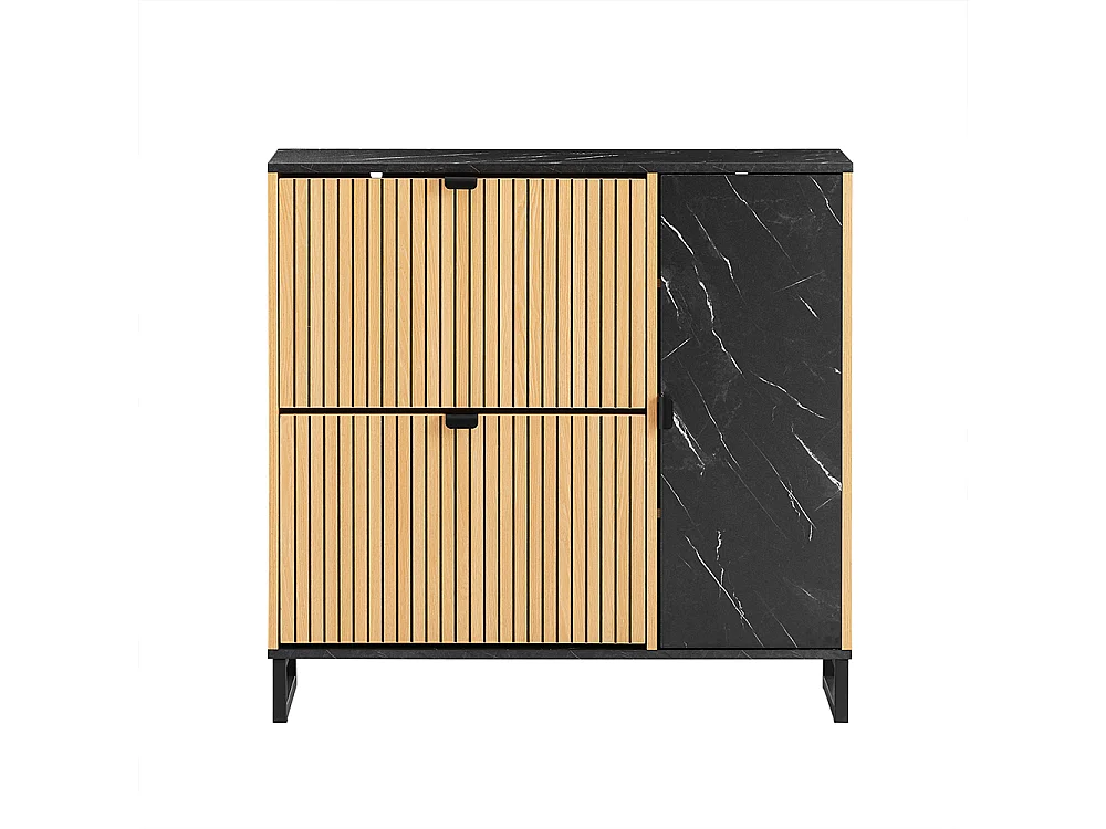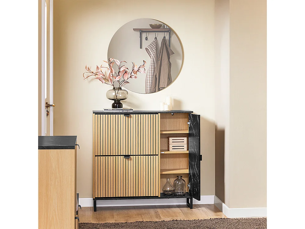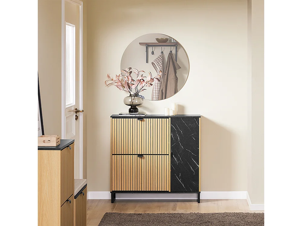 SoBuy Mueble zapatero con 2 puertas plegables para 8 pares de zapatos de entrada mármol negro y madera clara diseño moderno fijación antivuelco
