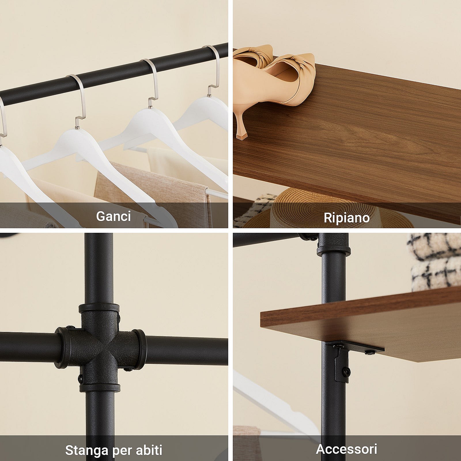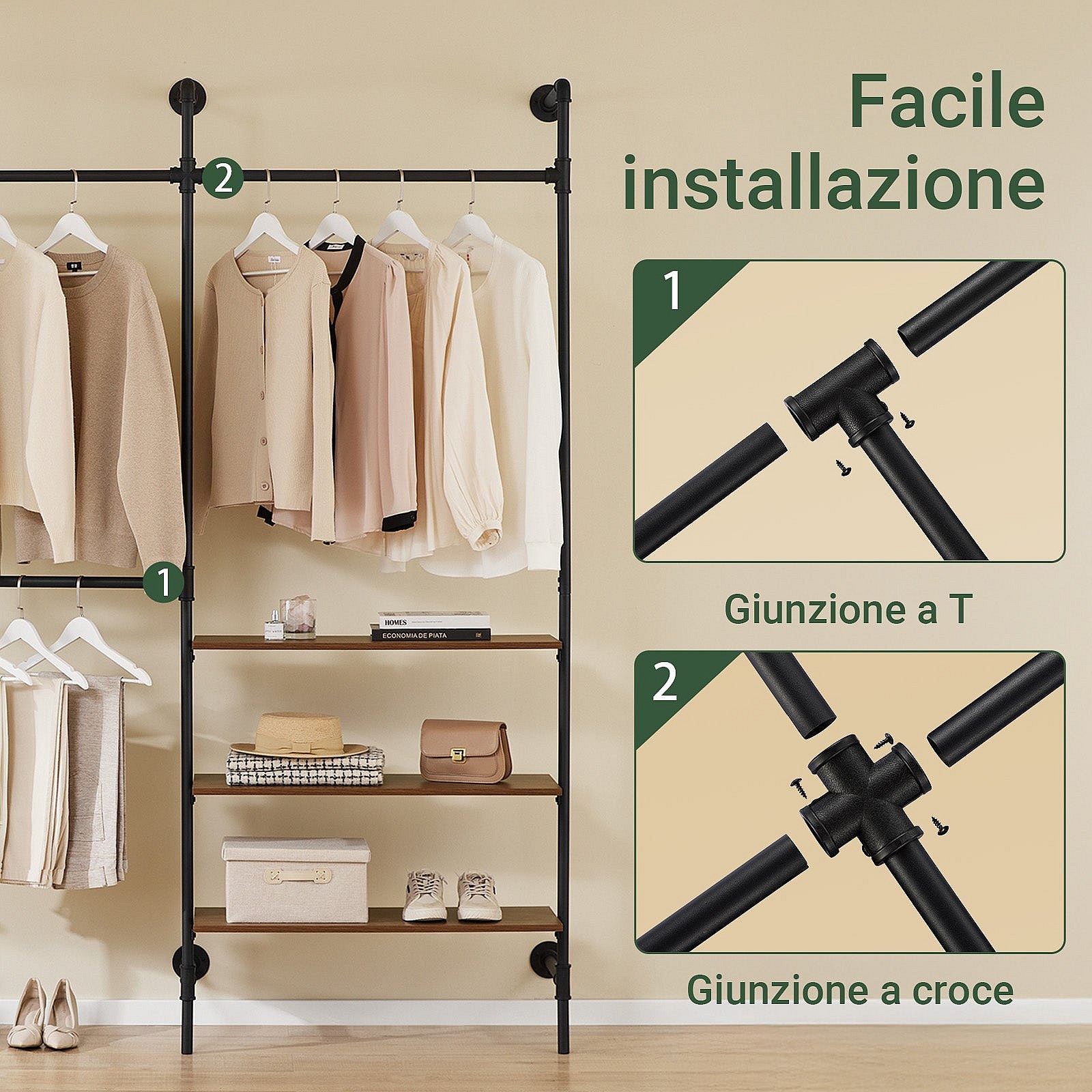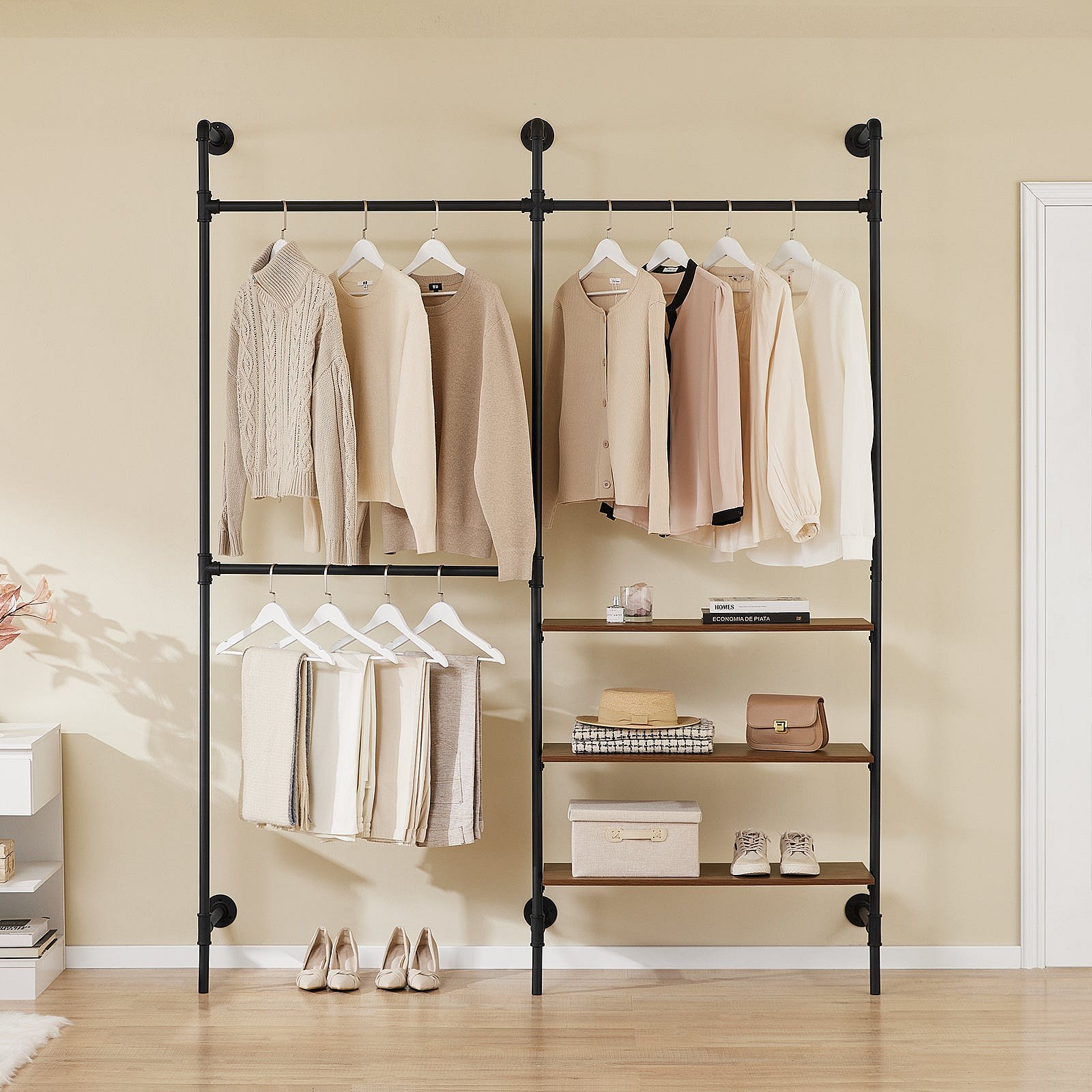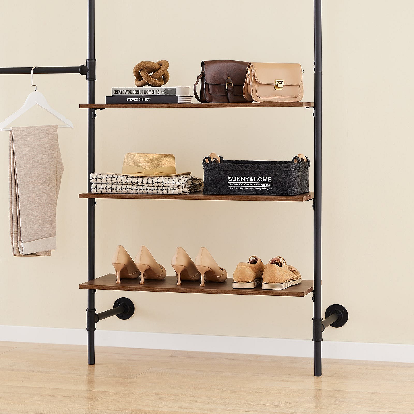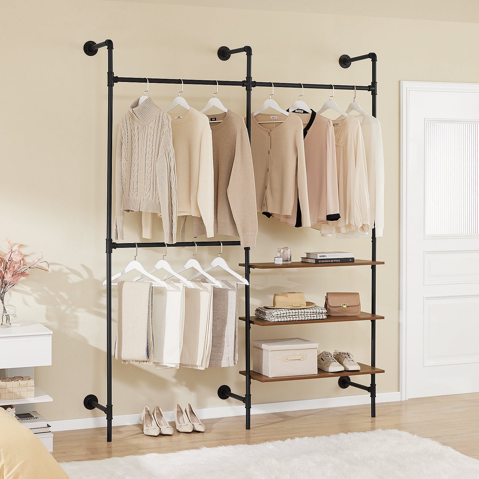 SoBuy perchero industrial de pared con 3 barras y estantes de MDF, armario abierto negro