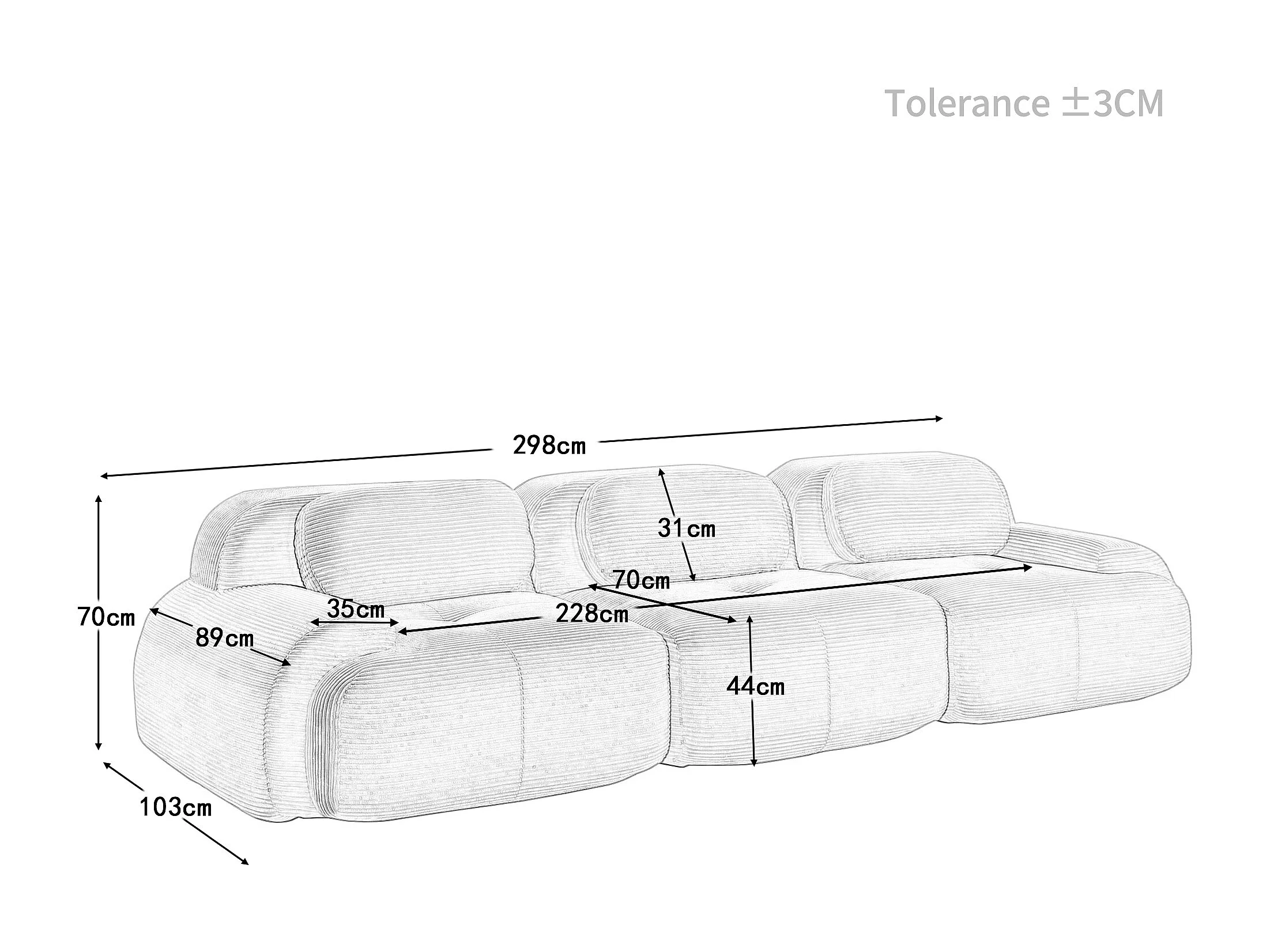 Sofá 3 plazas modular en Pana - con 3 cojines - 298x103x70cm - Marrón