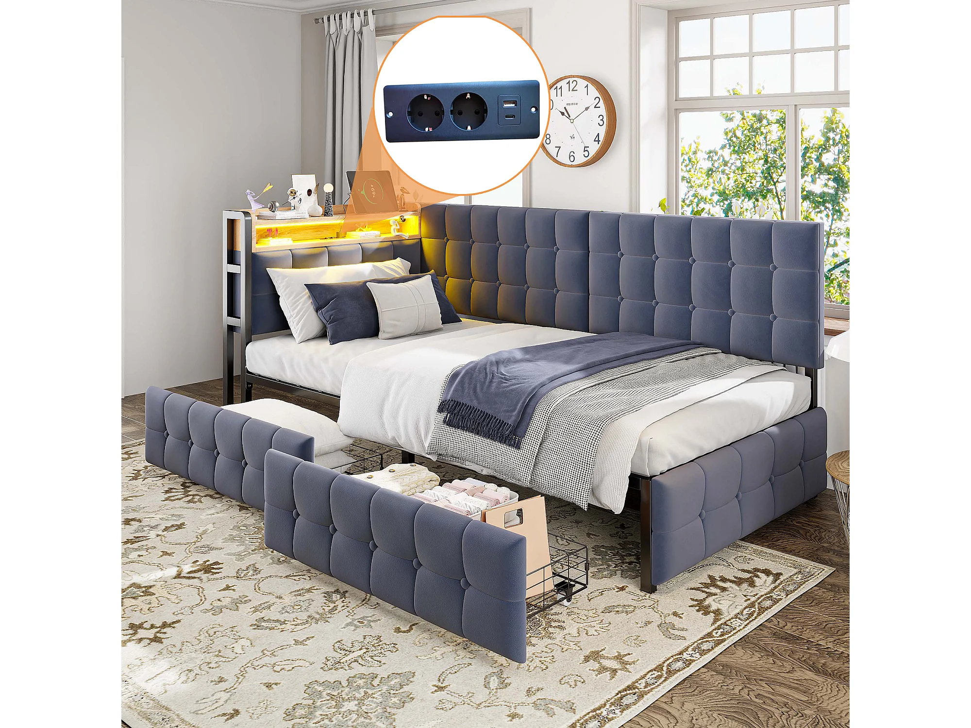 Sofá cama 90x200 cm, con 2 cajones, lámpara de noche LED, toma USB y Tipo C, multifuncional, gris (208,5x99x83,5 cm)
