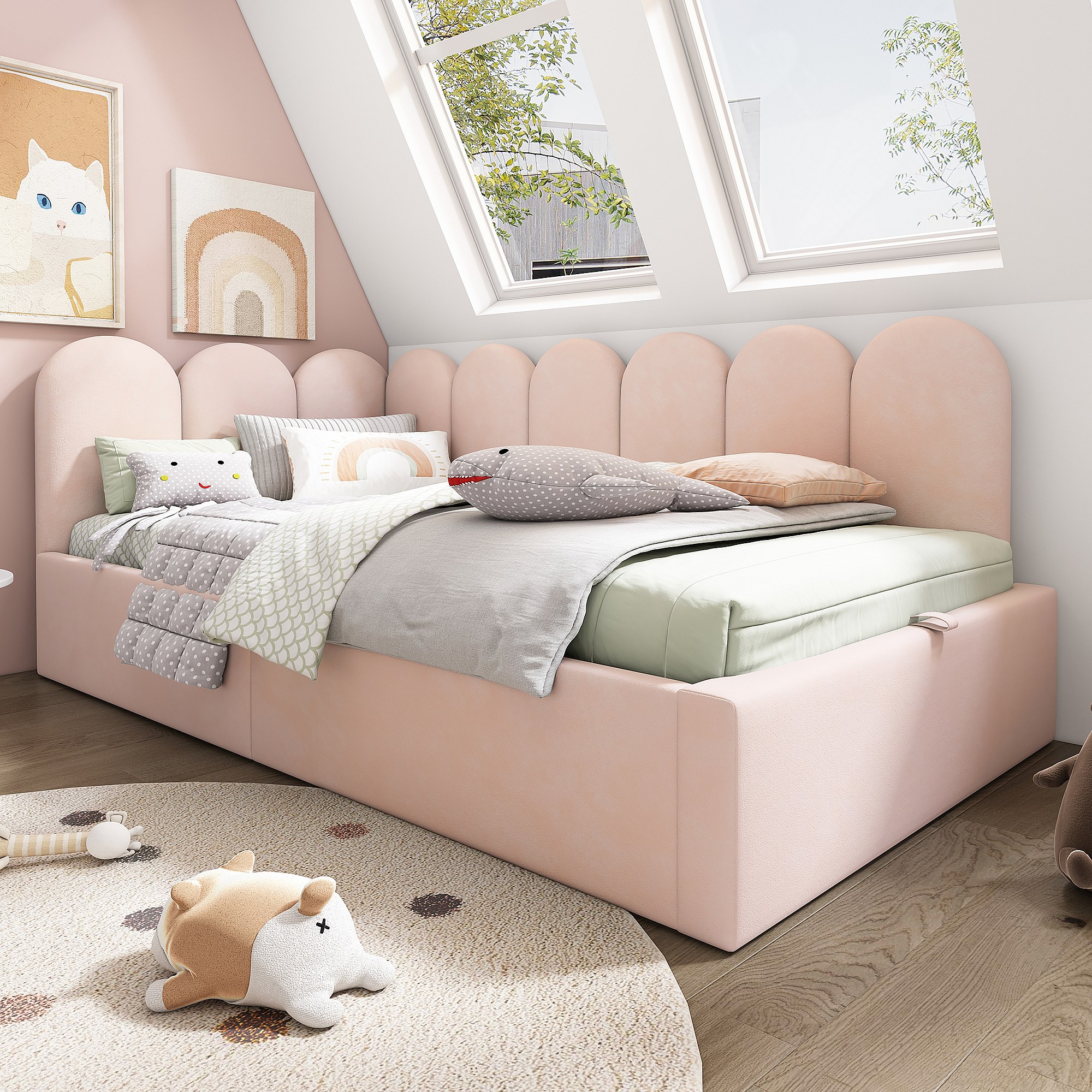 Cama nido 90x200cm+90x180cm, con pequeño escritorio, tres estantes en el lateral de la cama, rosa