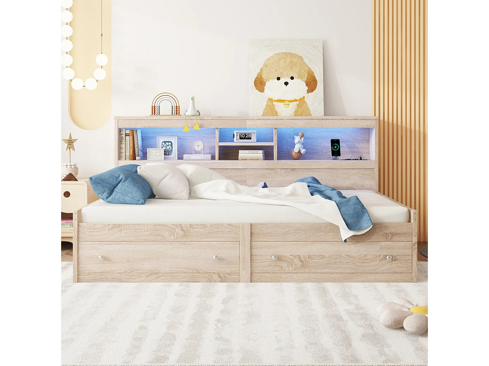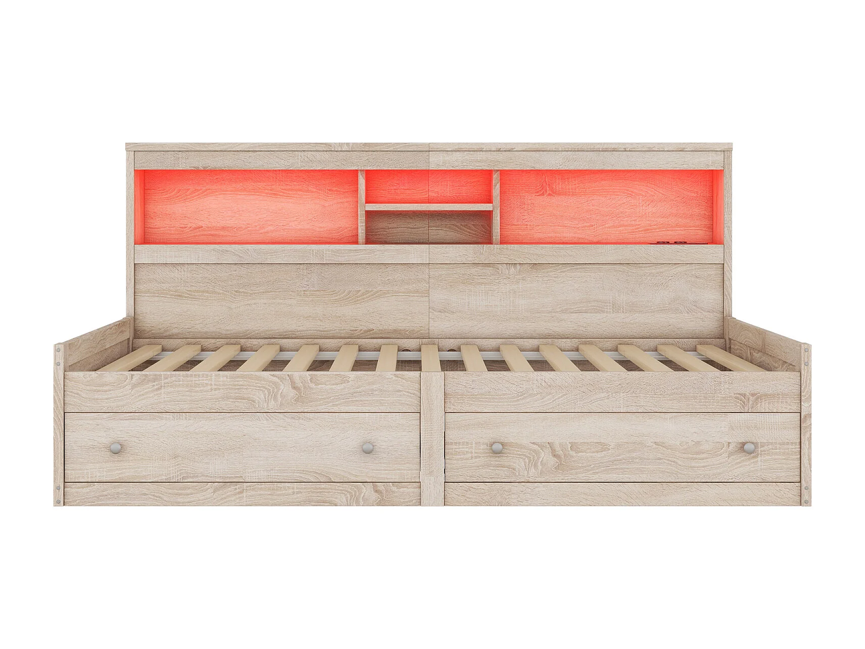 Sofá cama 90x200 cm con somier de láminas, 2 cajones, puertos USB e iluminación LED ambiental. Estructura en tablero efecto madera natural. Sin colchón