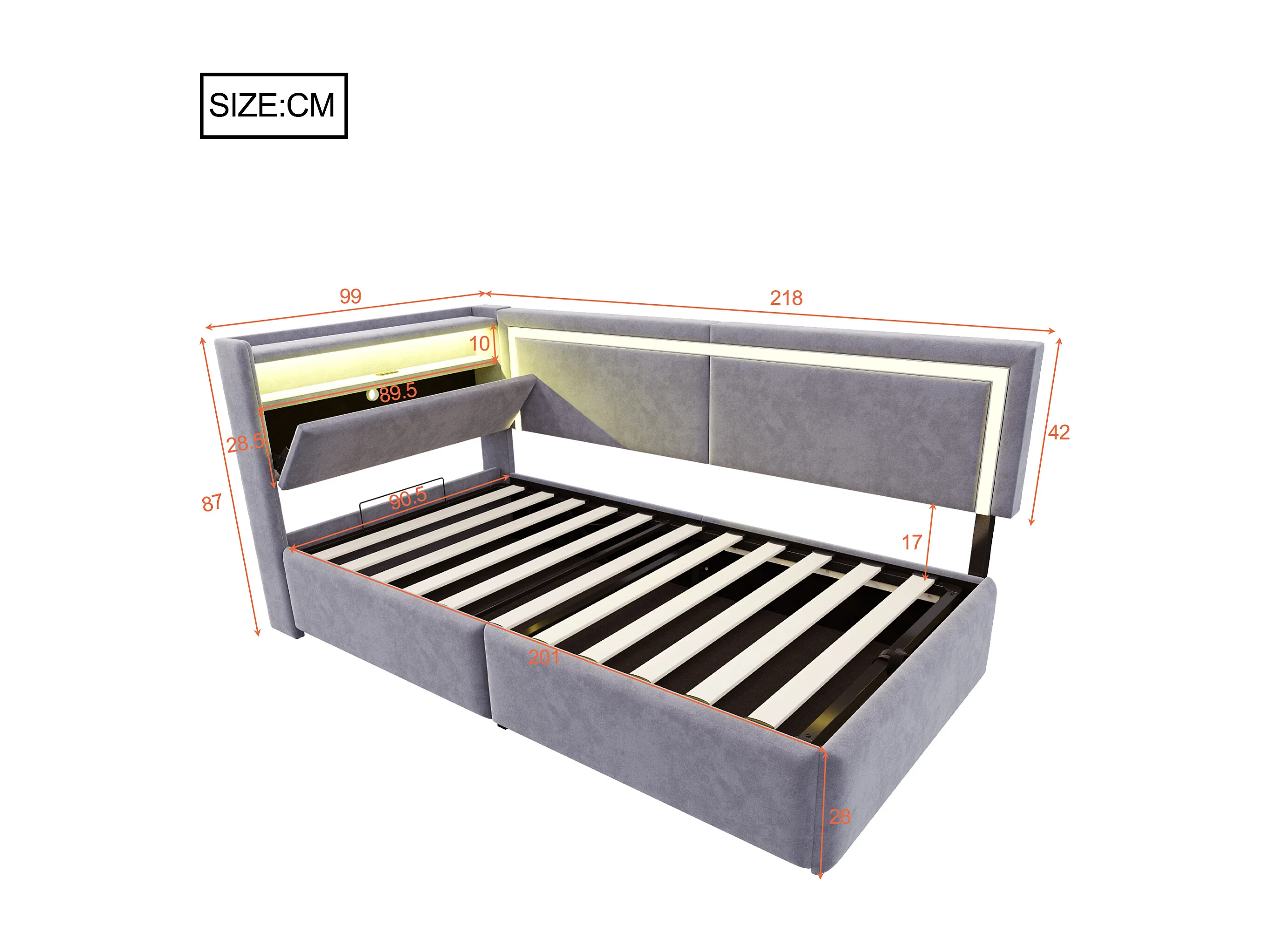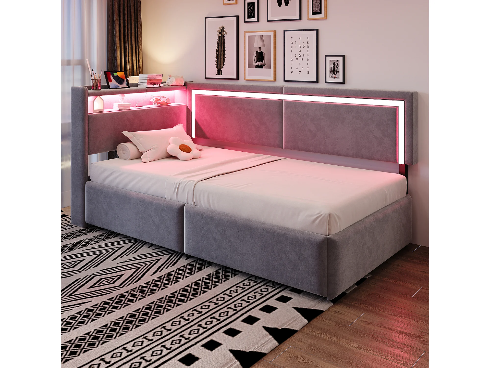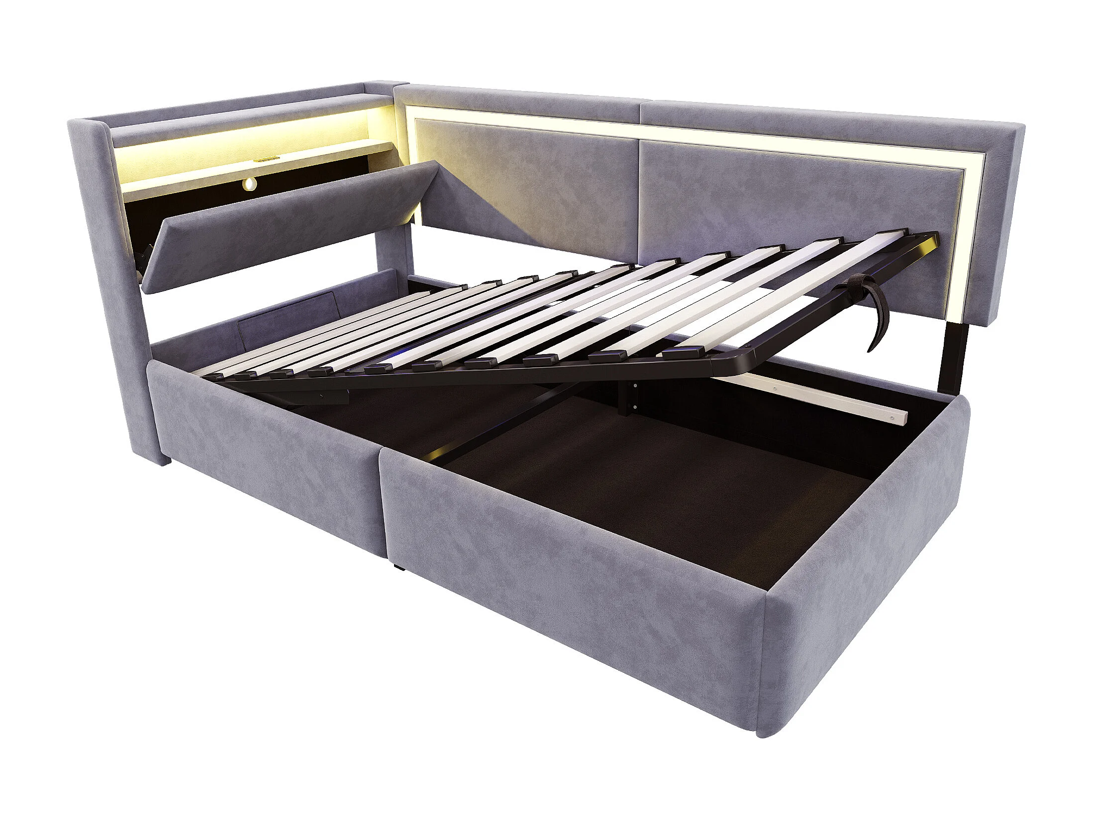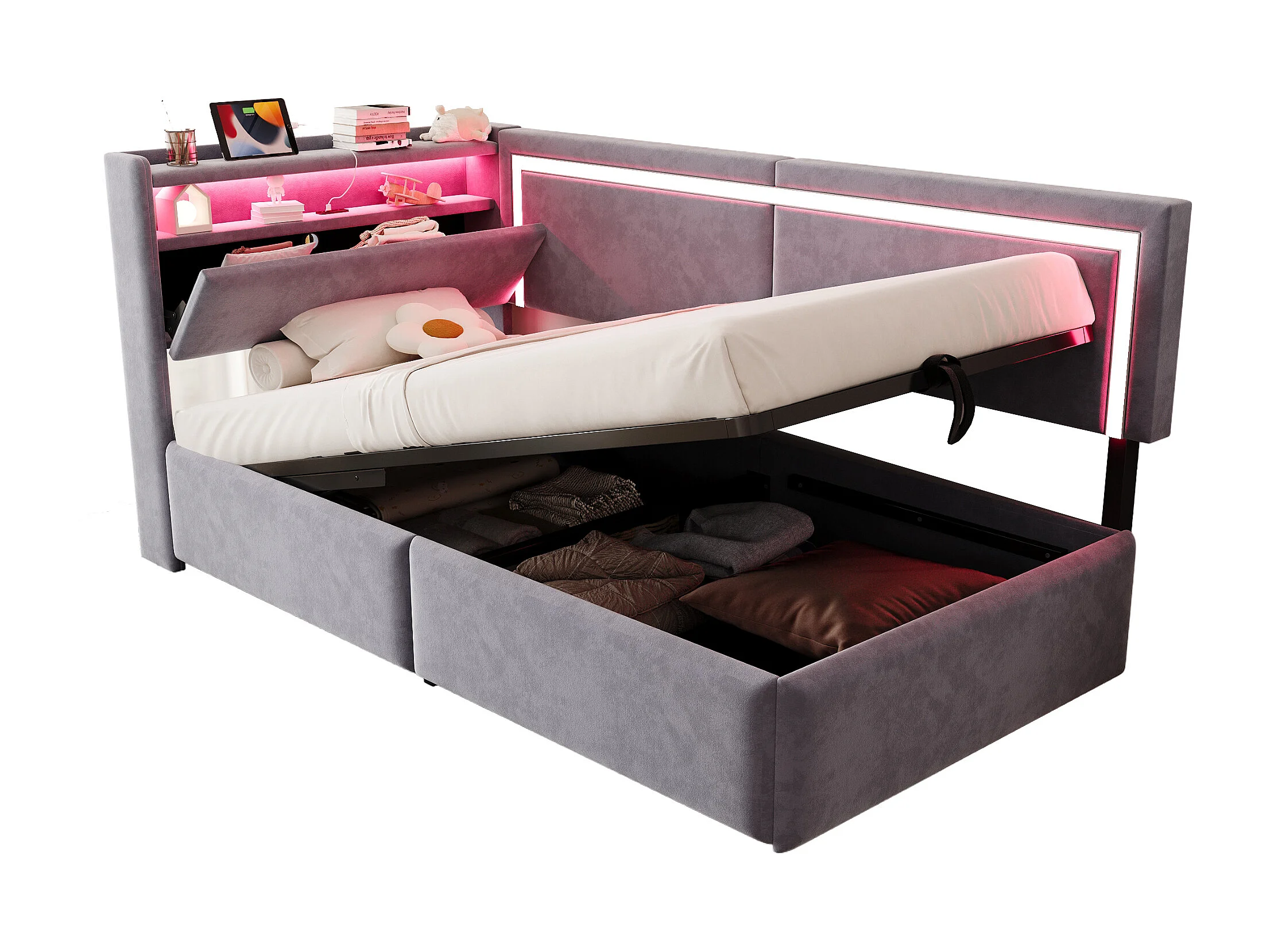 Sofá cama acolchado 90x200cm - con iluminación LED - con puertos USB - tejido de terciopelo - gris claro​ (colchón no incluido)
