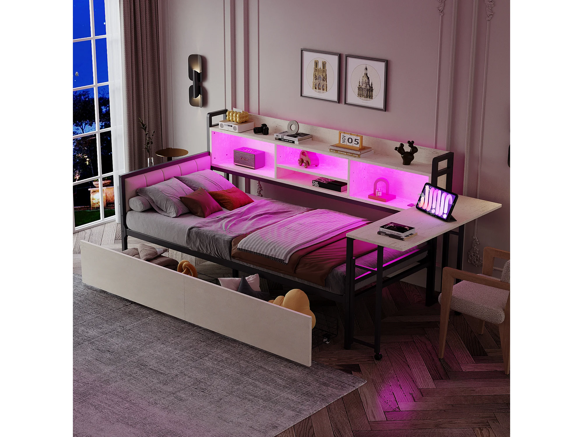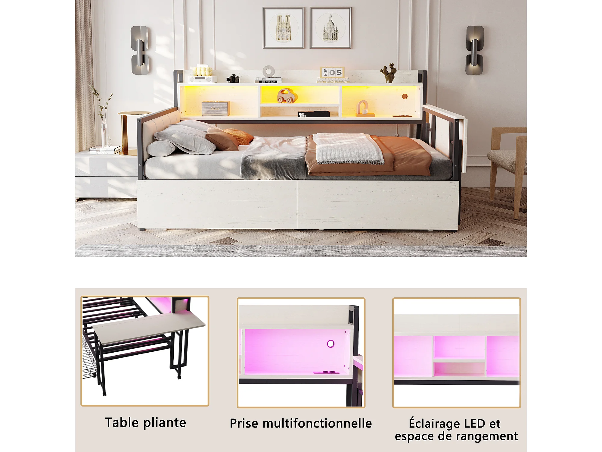Sofá cama blanco de 90x200 cm con iluminación LED, múltiples compartimentos de almacenaje, cajones, enchufes multifunción y escritorio plegable
