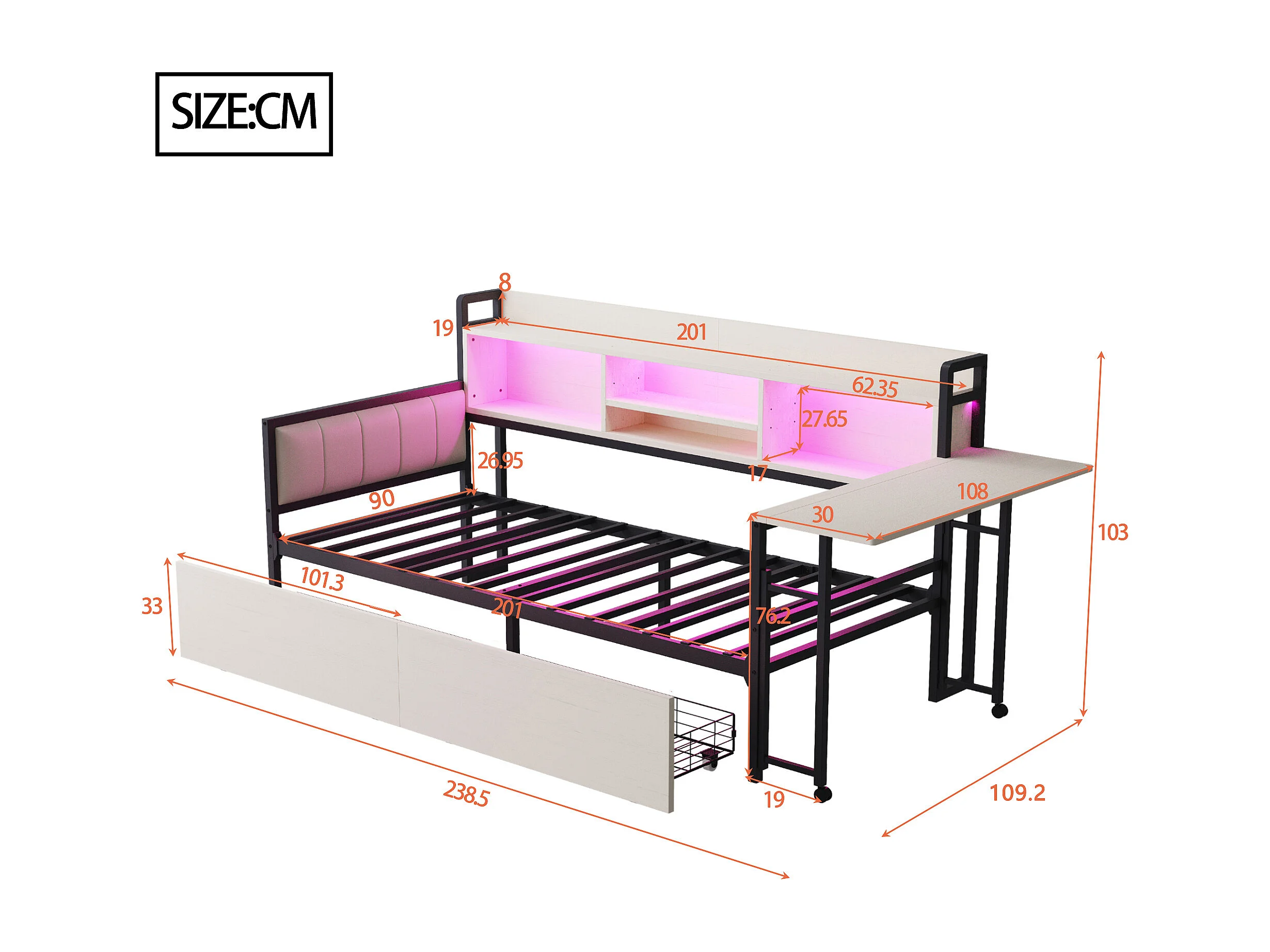 Sofá cama blanco de 90x200 cm con iluminación LED, almacenaje, enchufe multifunción, escritorio plegable y respaldo acolchado.
