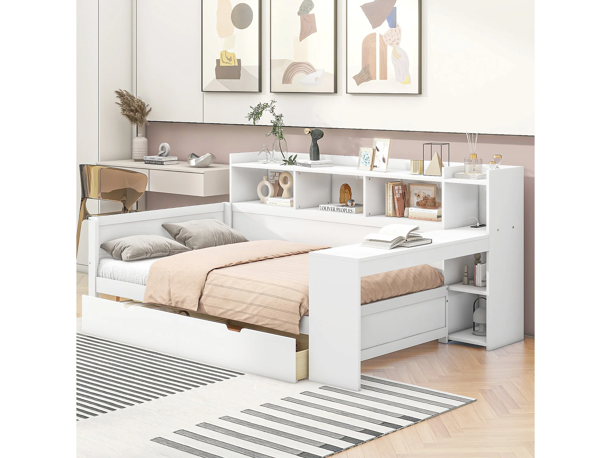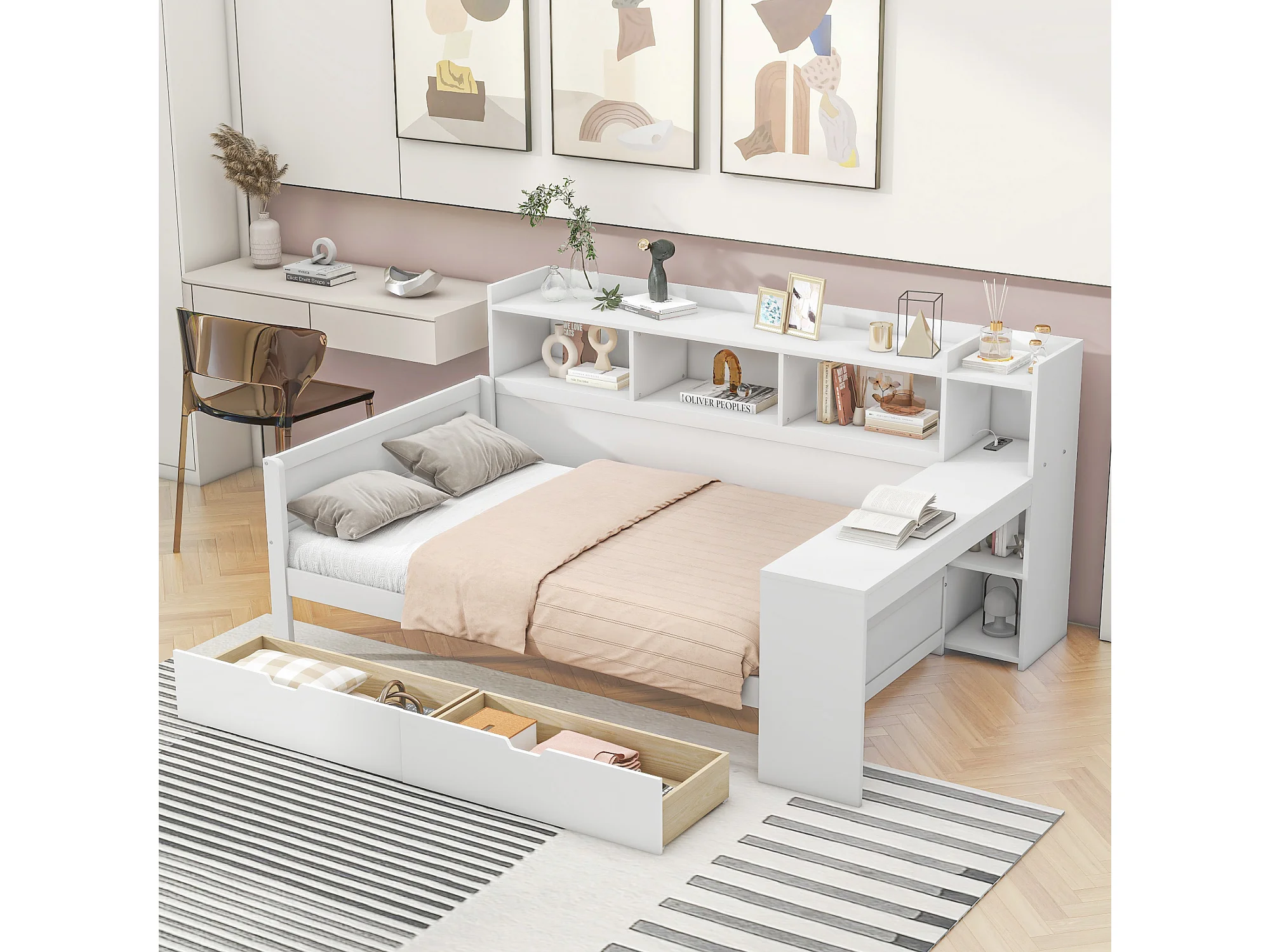 Sofá cama 2 en 1 de madera maciza blanca (200x90 cm) con escritorio modular, estante de almacenaje y cómodos cojines.
