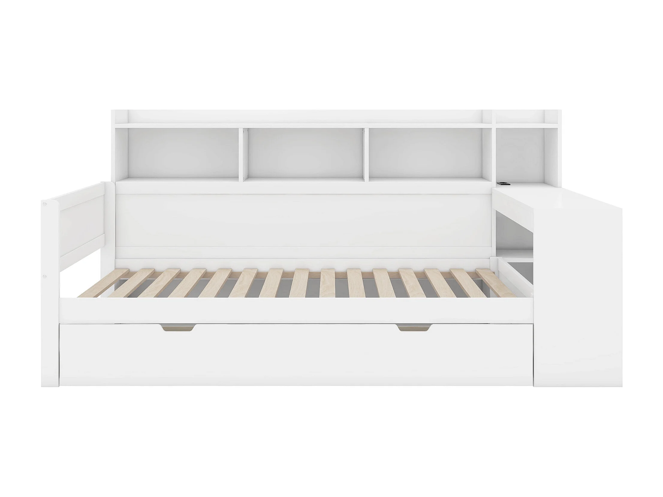 Cama multifuncional de madera maciza de 90x200 cm con escritorio, estantes, espacio de almacenamiento y toma de corriente, cama nido debajo, blanca