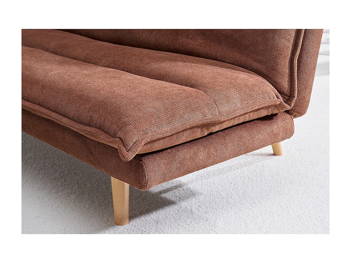 Sofá cama convertible de 3 plazas en tejido chenilla texturado tierra quemada y madera clara BINGO