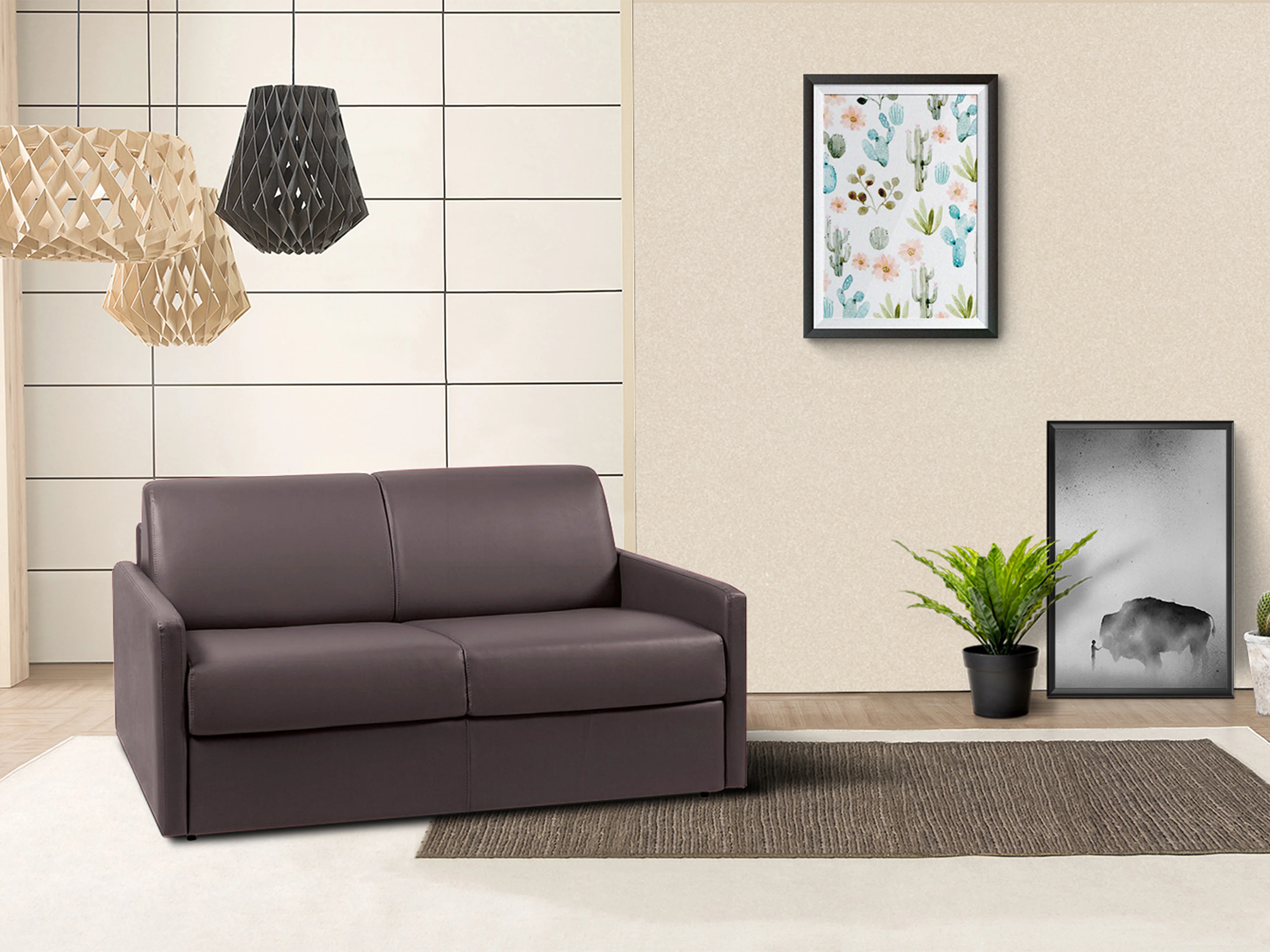 Sofá cama de 3 plazas tipo italiano de piel sintética CALIFE - Marrón - Somier de láminas de 140 cm - Colchón de 14 cm