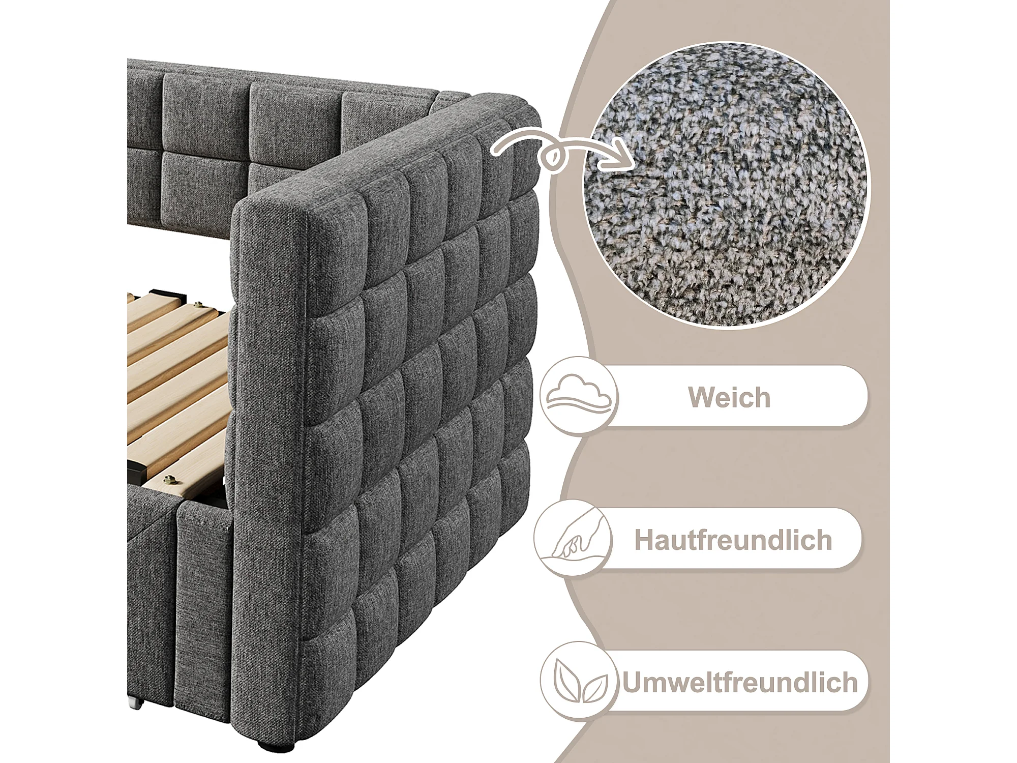 Sofá cama 90x200 cm con cajones, gran espacio de almacenaje y puerto USB, de madera, gris (192,3x110x100 cm)