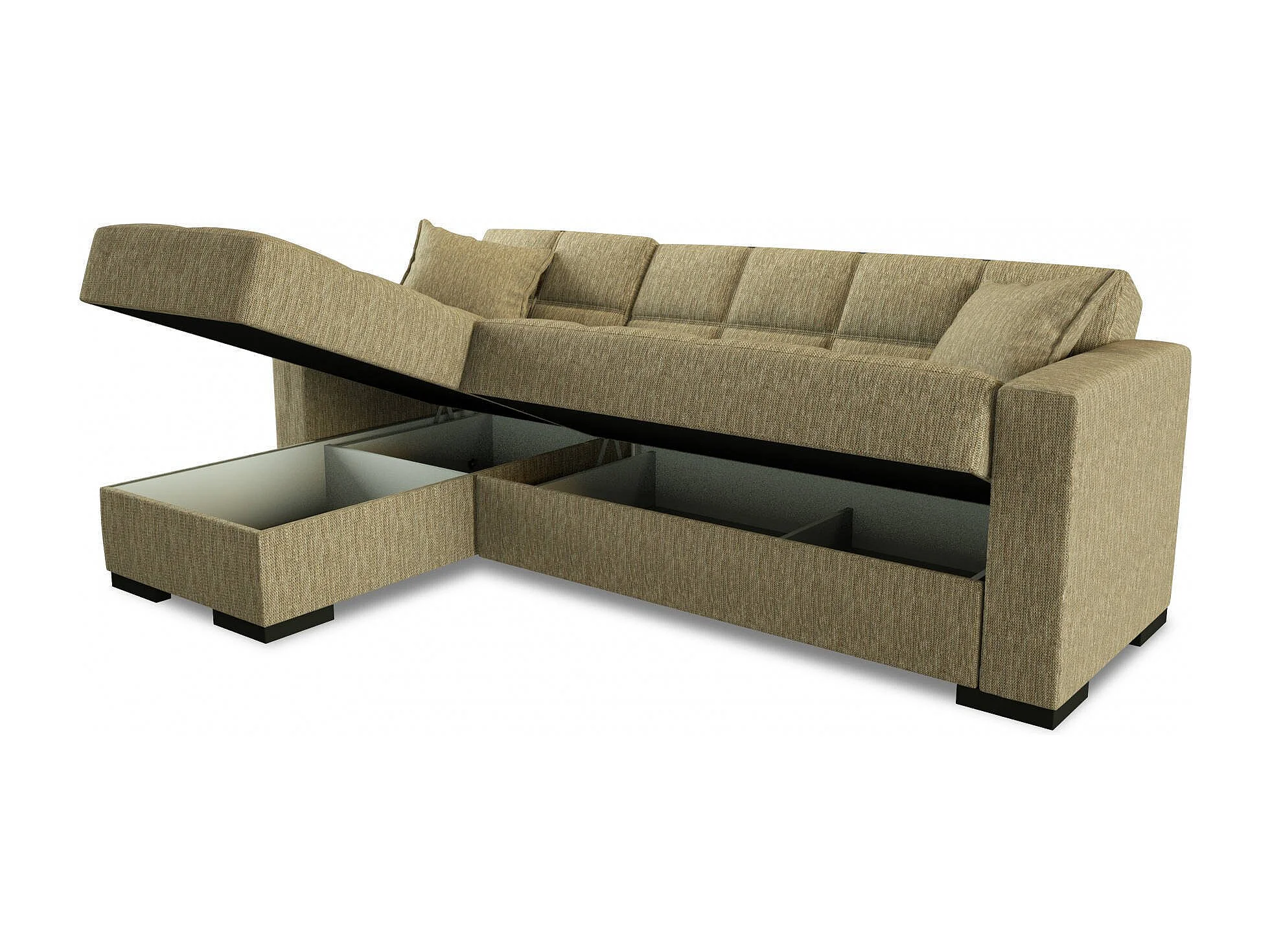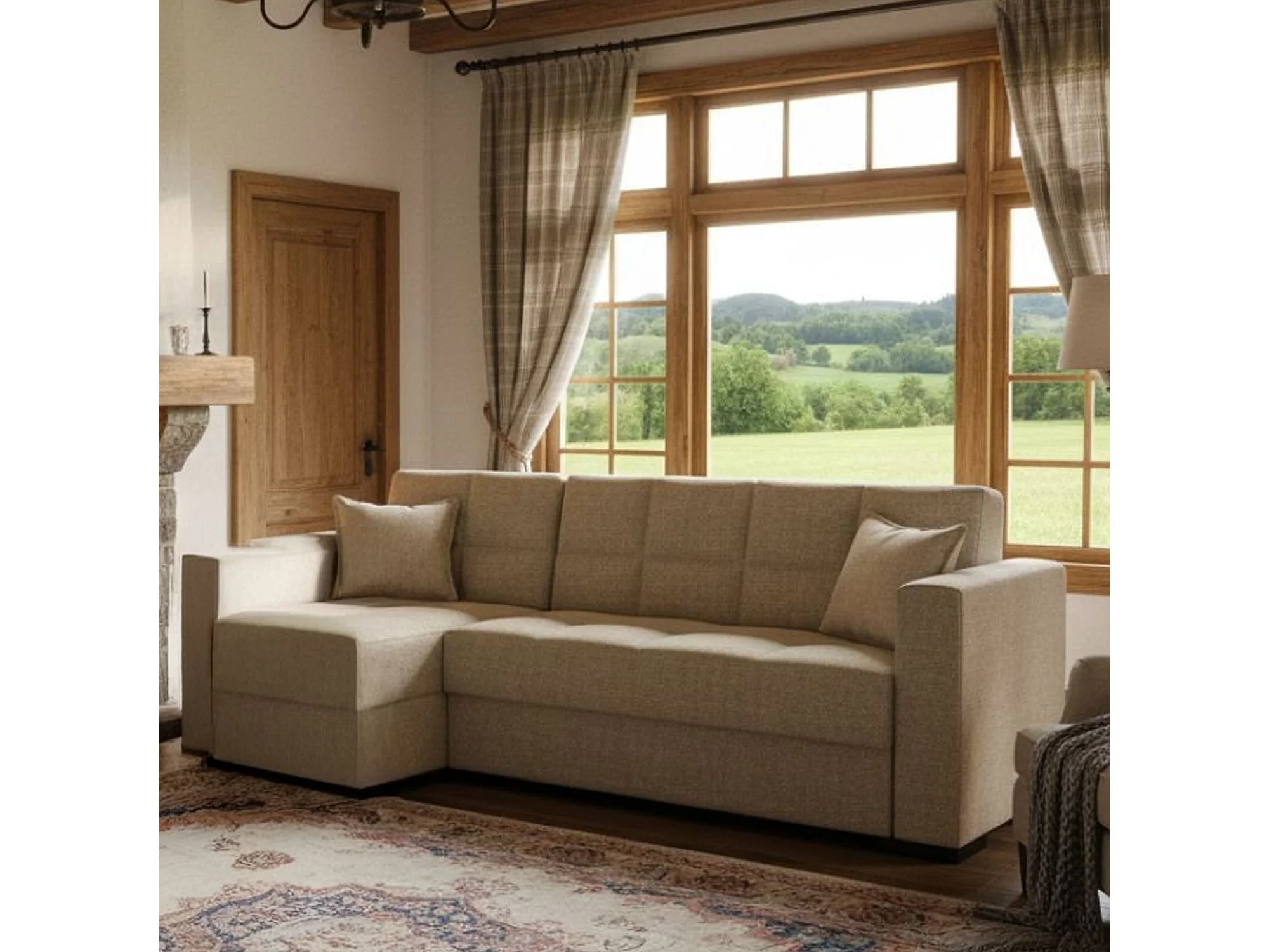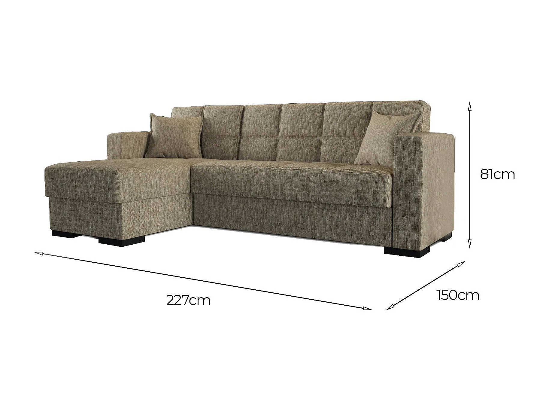 Sofá cama Fernando, Sofá cama rincón con península reversible, Sofá contenedor para salón con chaiselongue y 2 cojines, 230x150h81 cm, Beige