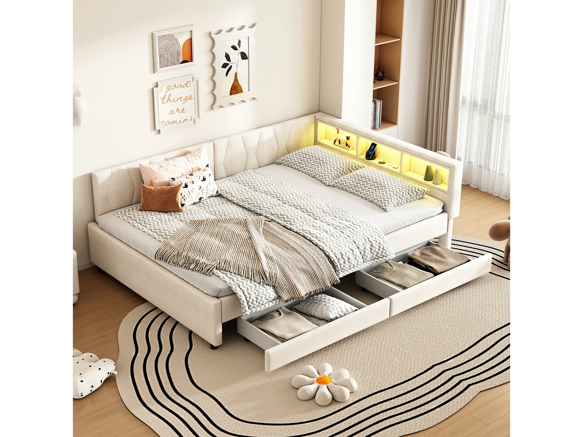 Sofá cama infantil - 140 x 200 cm - cabecero con almacenaje + LED - 2 cajones - lino - beige