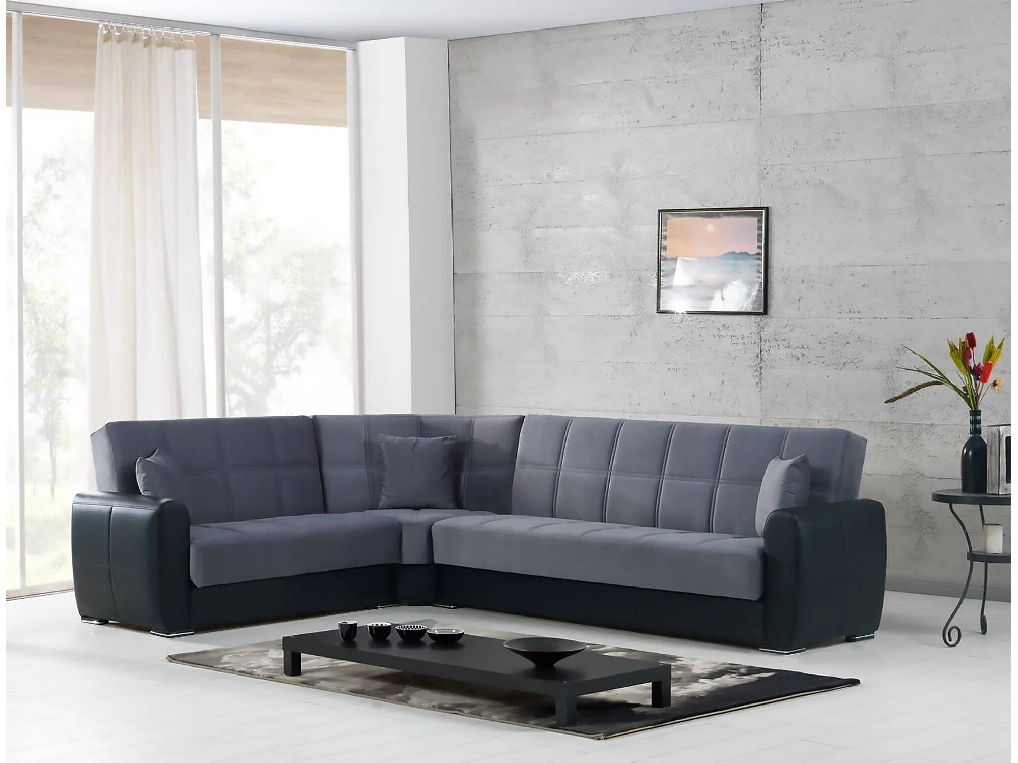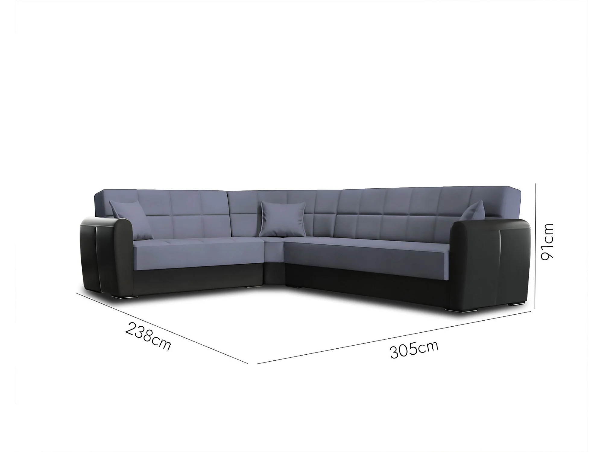 Sofá cama Matias, Sofá cama rinconera contenedor en ecopiel y tejido, Sofá de salón con apertura clic-clac y península reversible, 305x238h91 cm, Negro y Gris