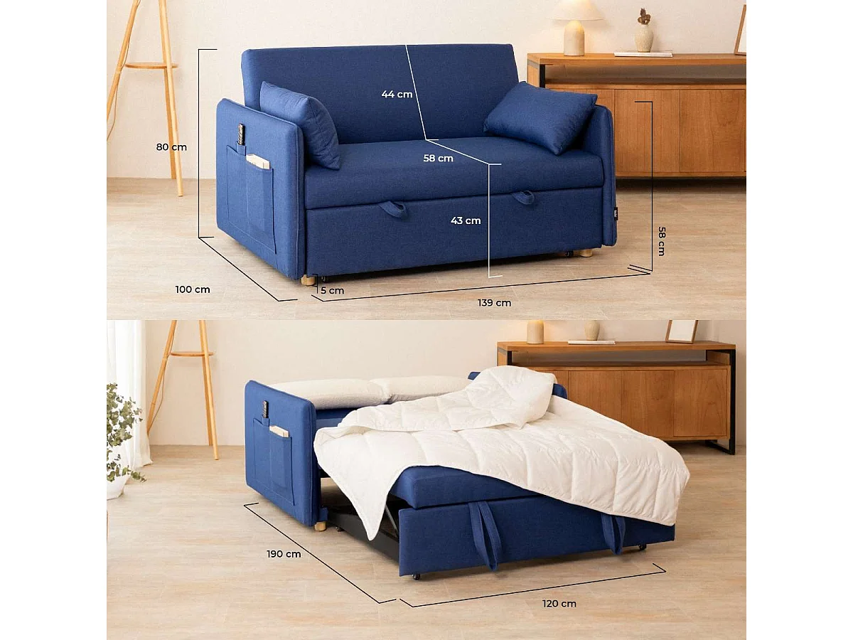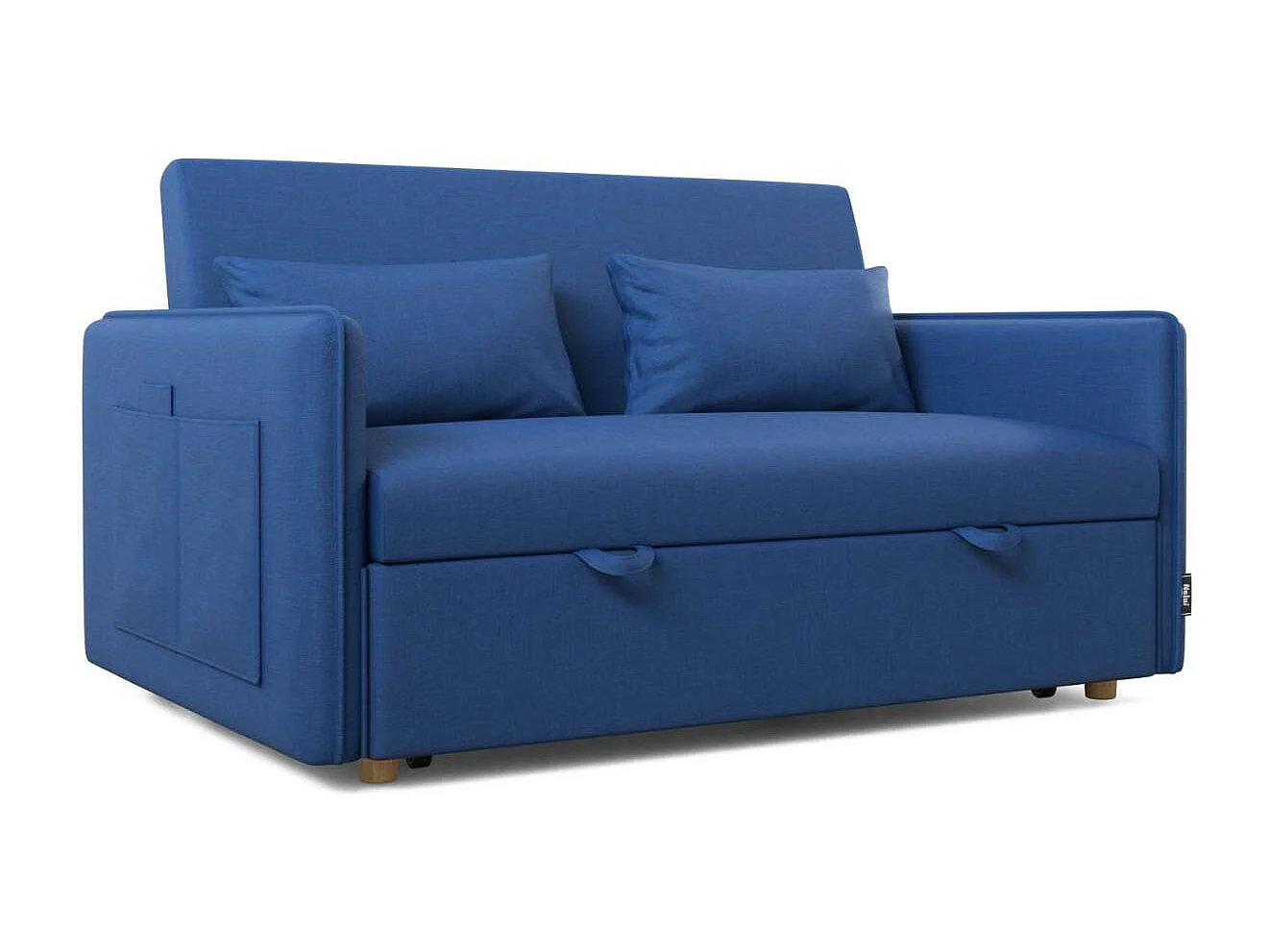Sofá cama de 2 plazas con dos almohadas tela azul