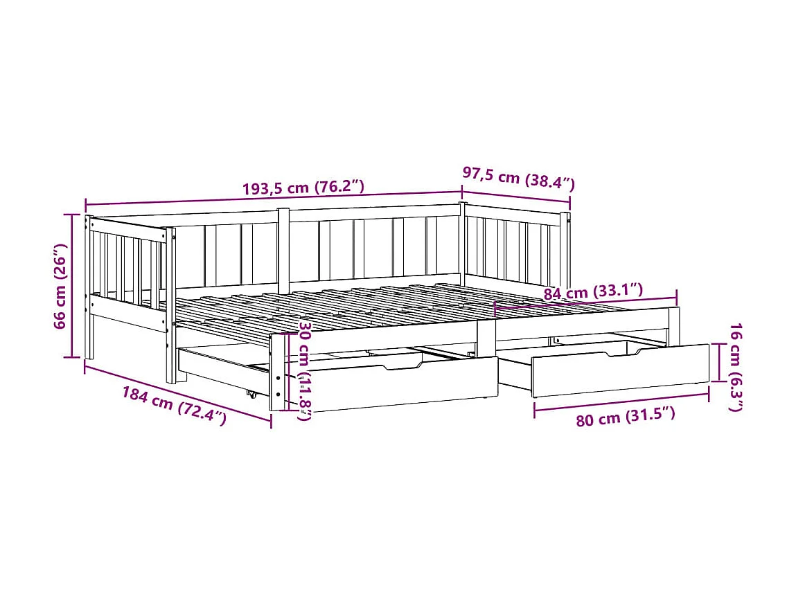 Sofá cama con cajones madera maciza de pino blanco 90x200 cm