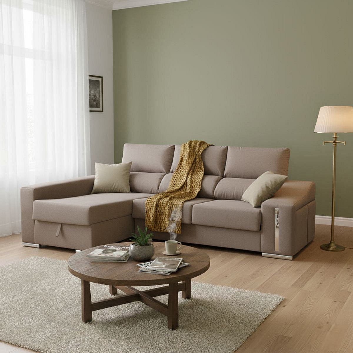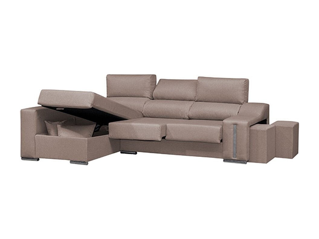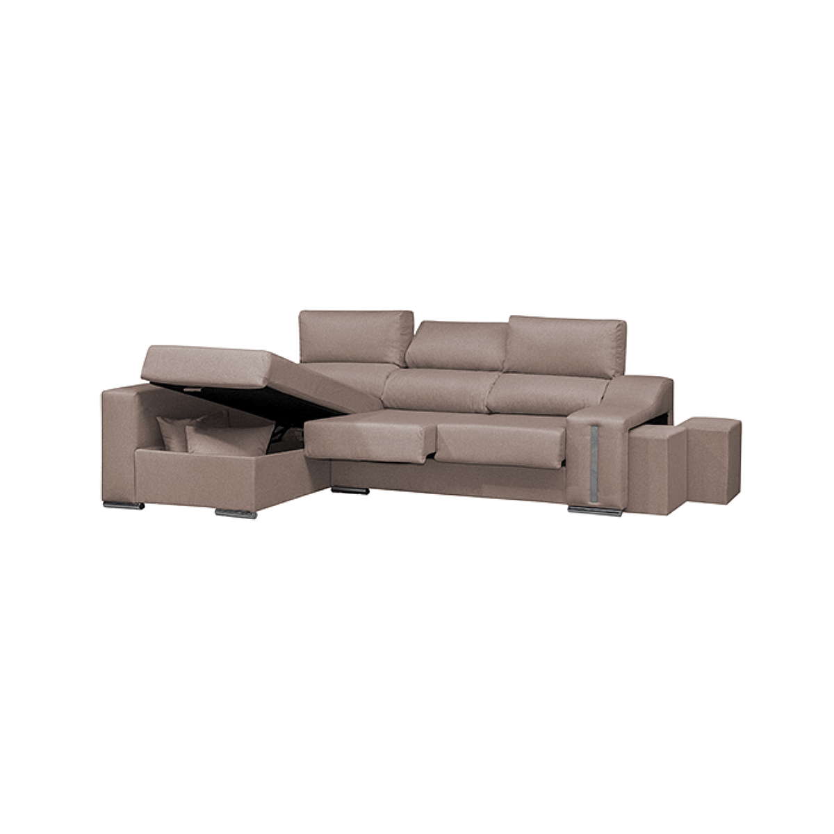 Sofá chaiselongue Ares 3 plazas con arcón y 2 taburetes tela nevada choco frente izquierda
