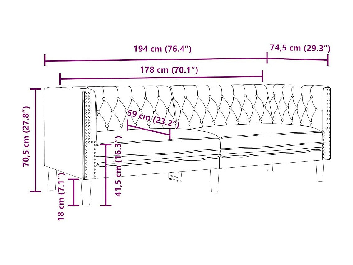 Sofá Chesterfield de 3 plazas con cojines en piel sintética de ante.