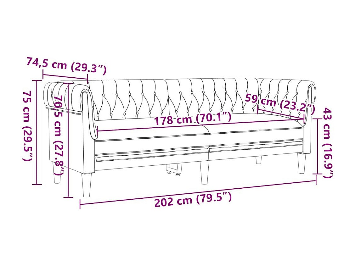 Sofá Chesterfield de 3 plazas con cojines en piel sintética de ante.