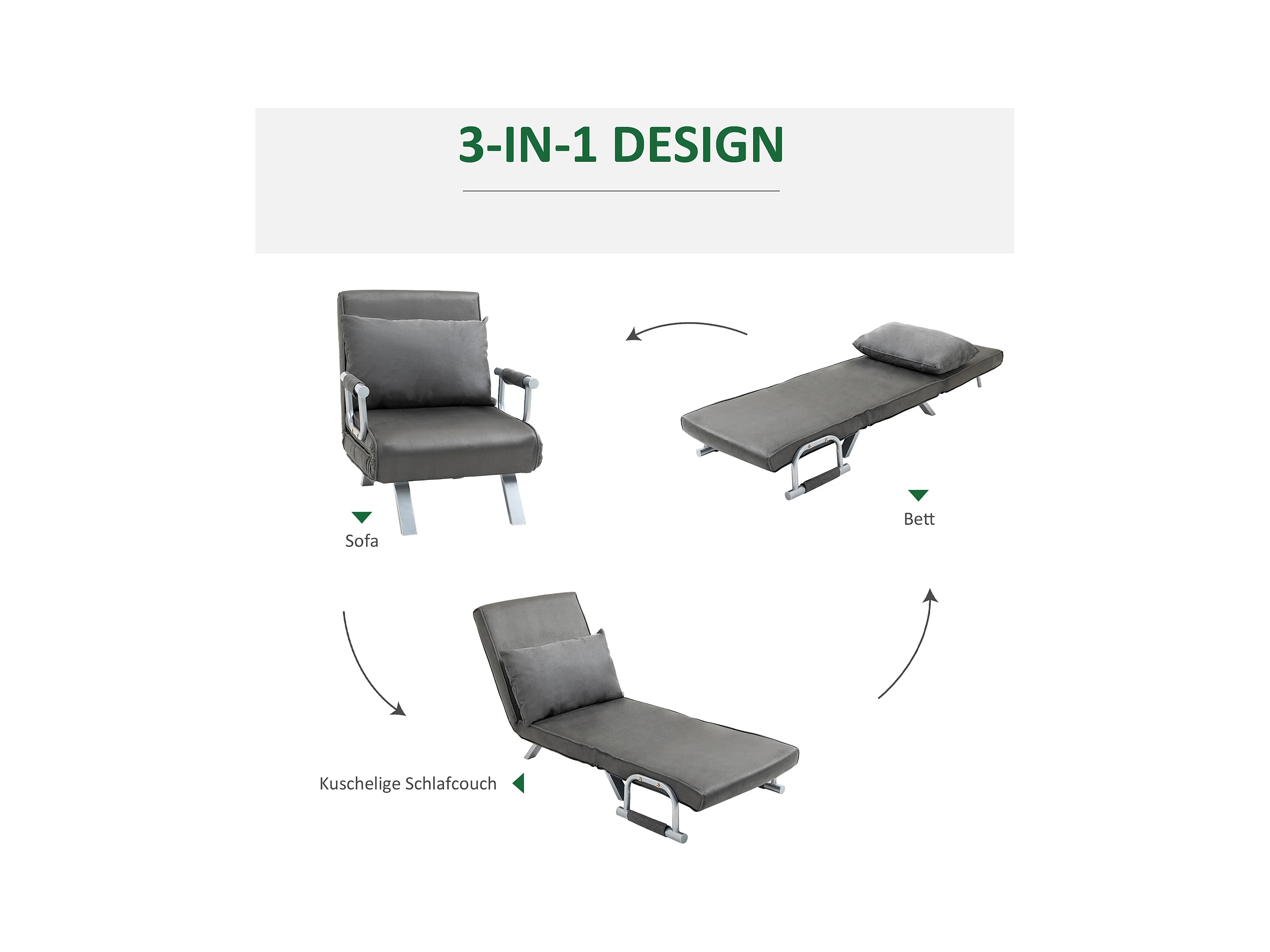Sillón convertible 3 en 1 con colchón y cojín, gris oscuro, para salón y dormitorio