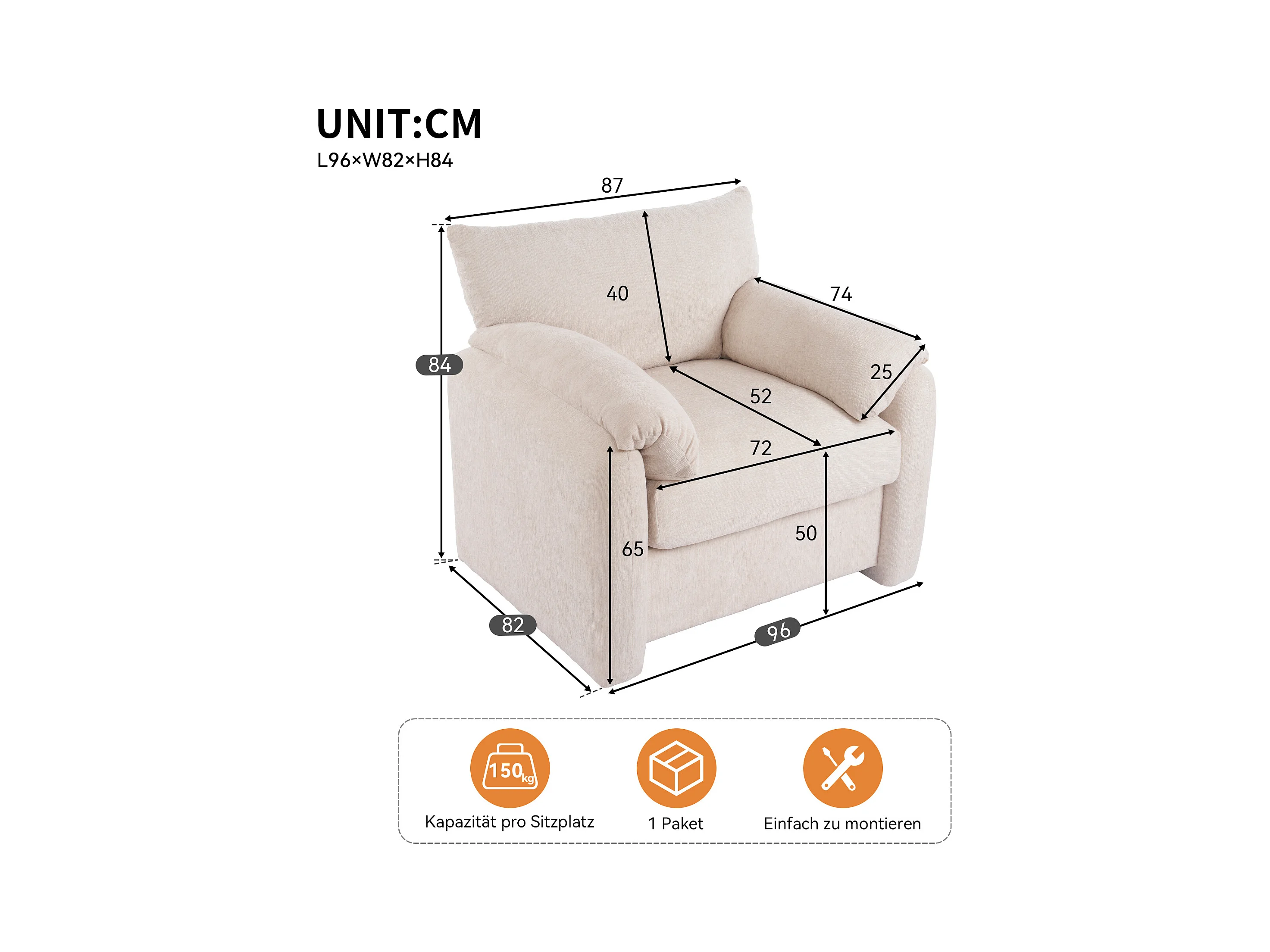Sofá de 1 plaza con reposabrazos suaves, tela de chenilla beige - para sala de estar, dormitorio o rincón de lectura