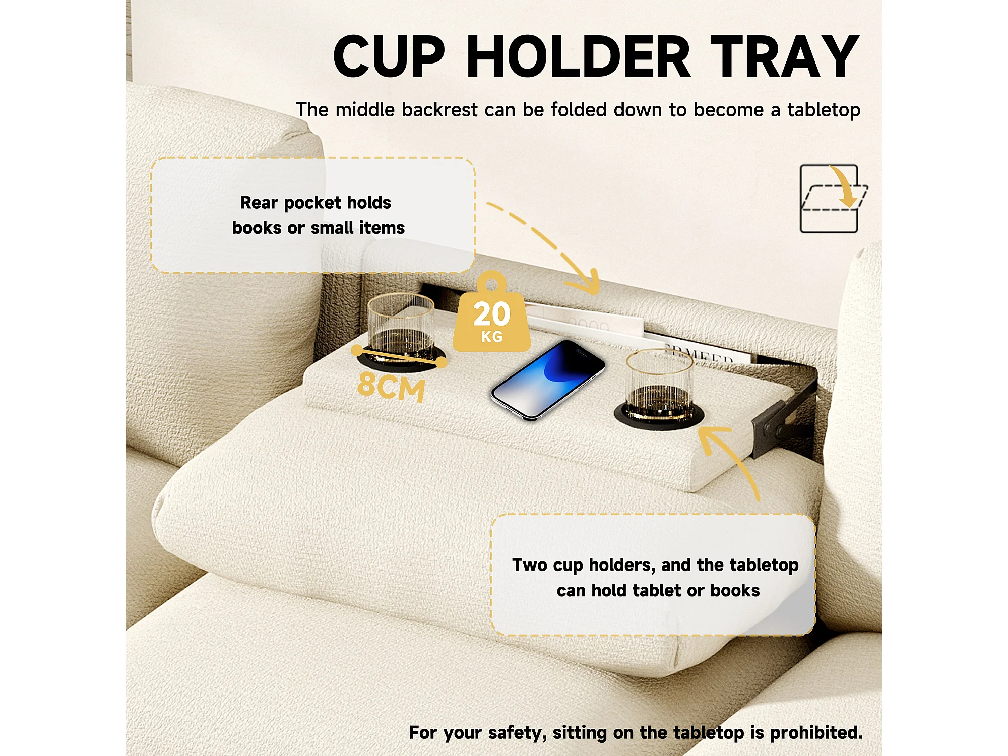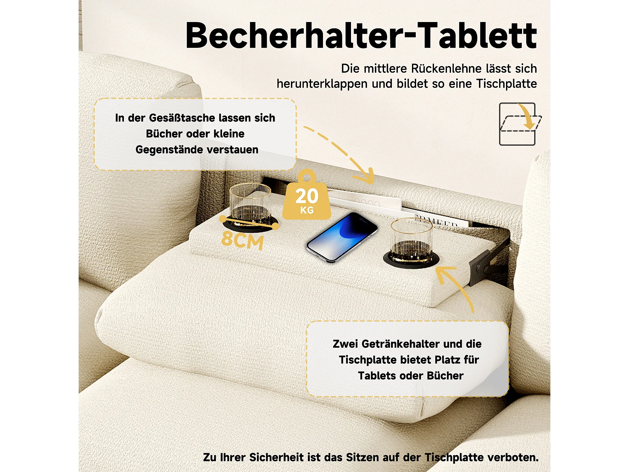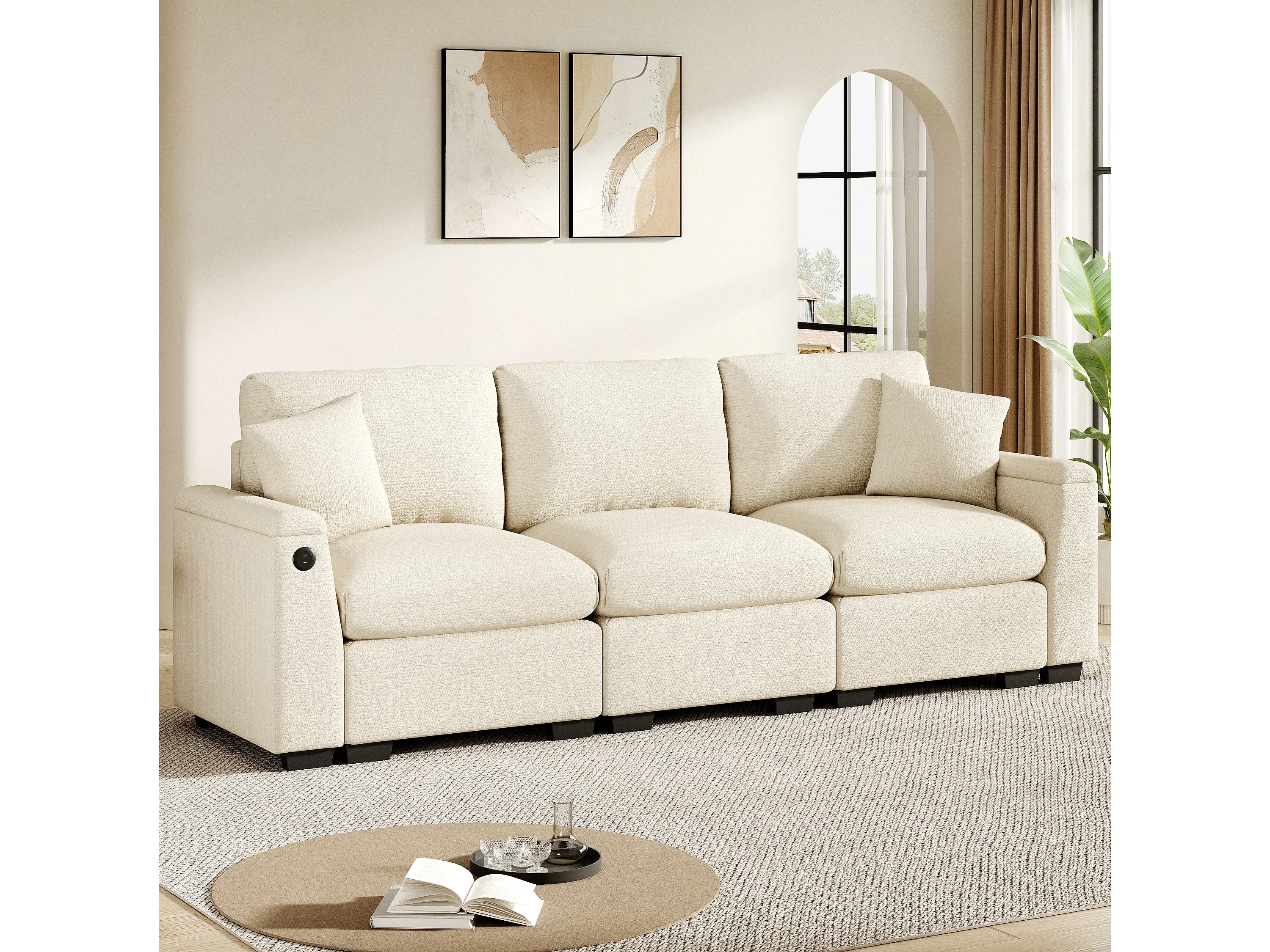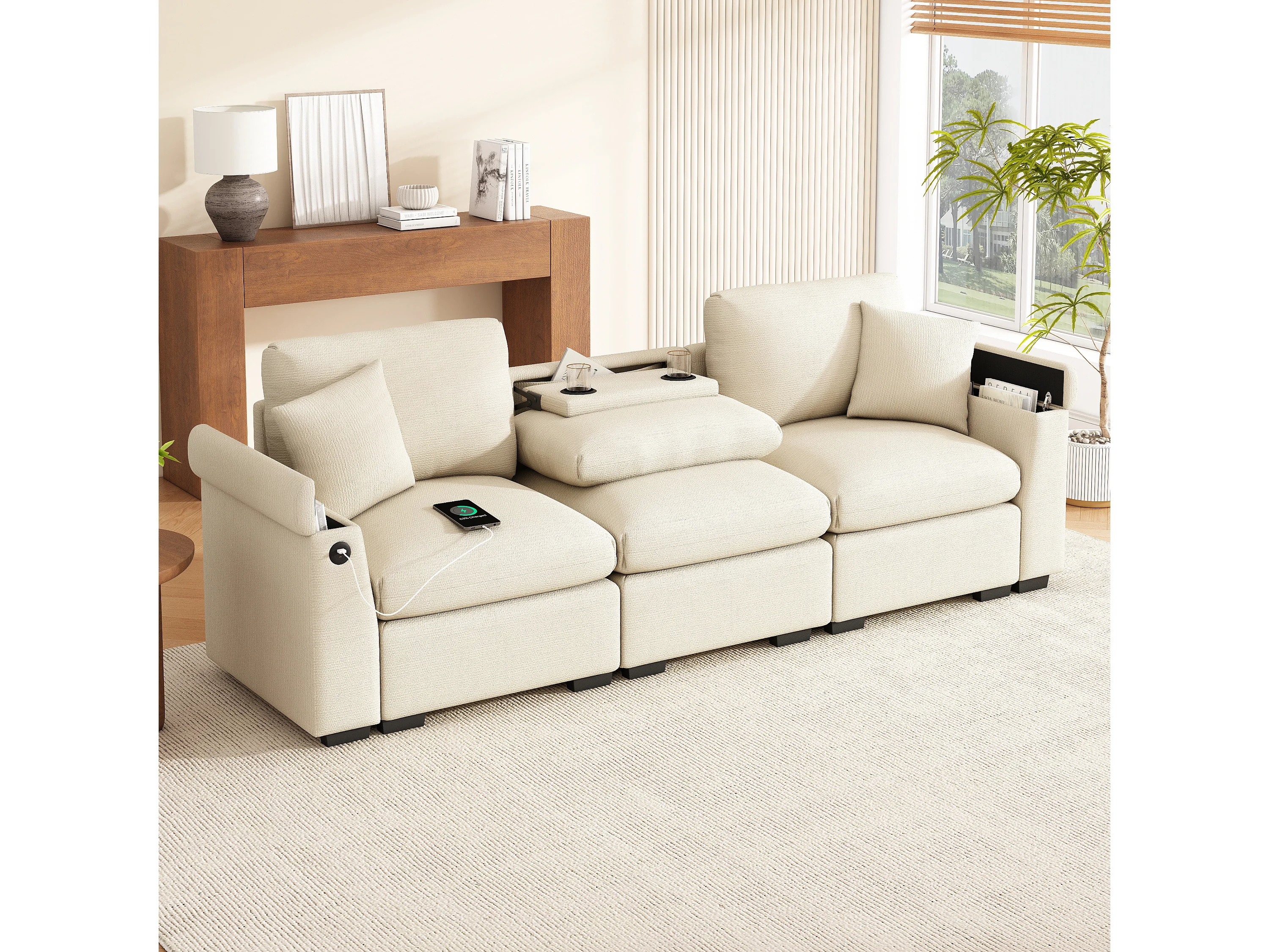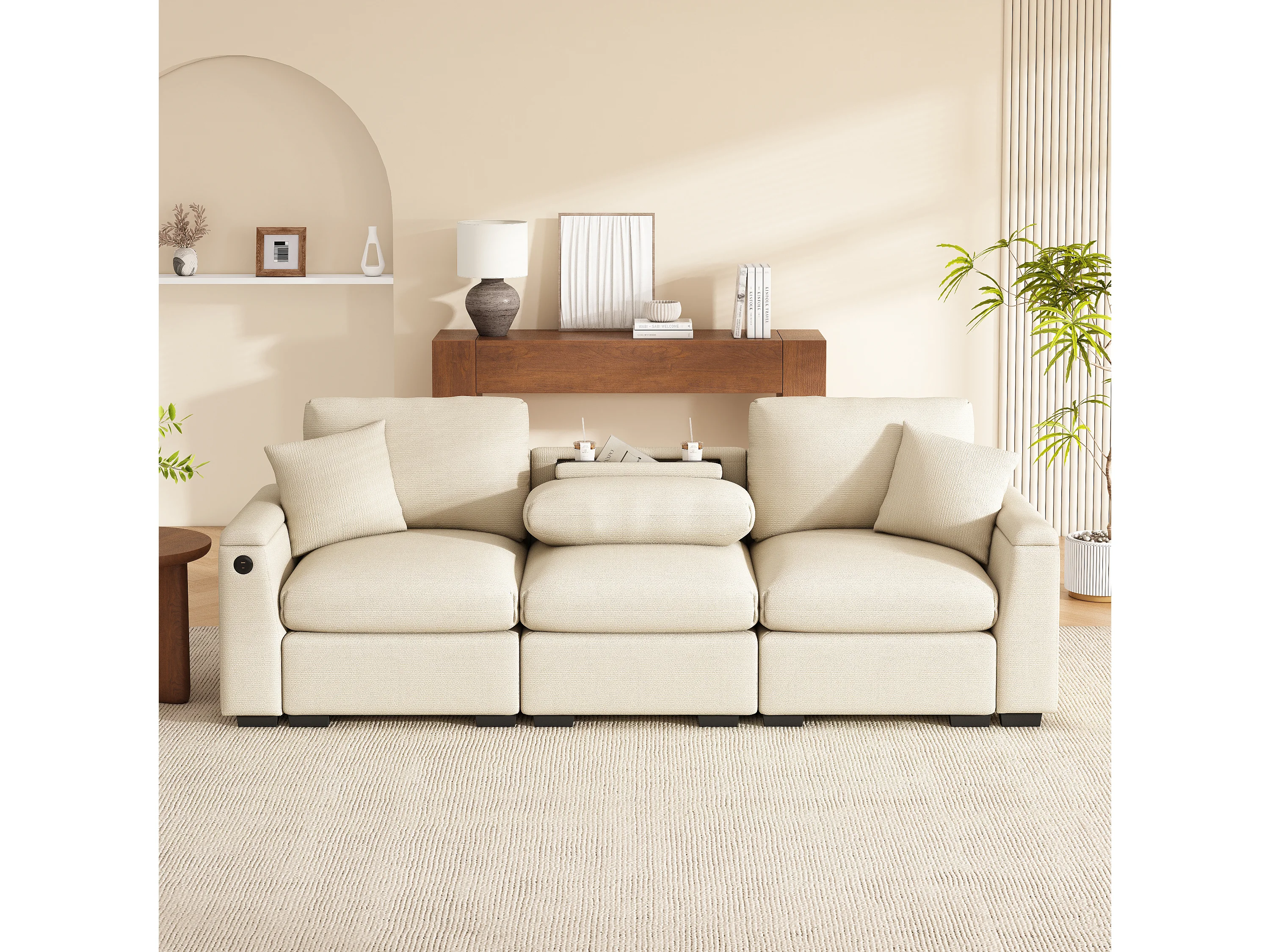 Sofá de 3 plazas - 242 x 88 x 80 cm - con mesa plegable + puerto USB + almacenaje oculto - terciopelo - beige