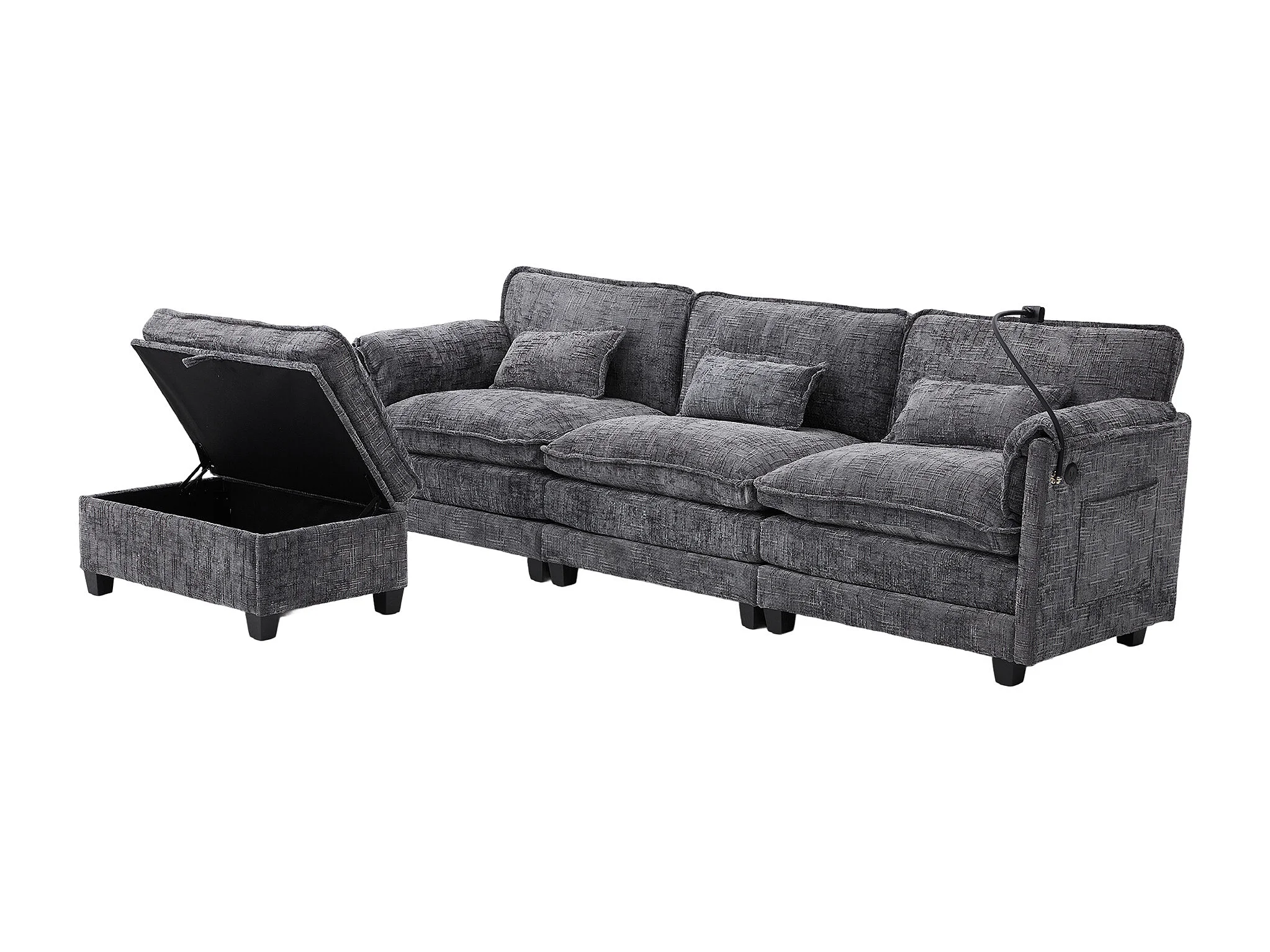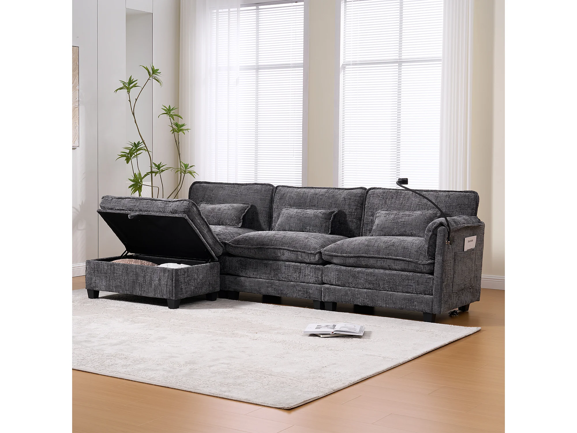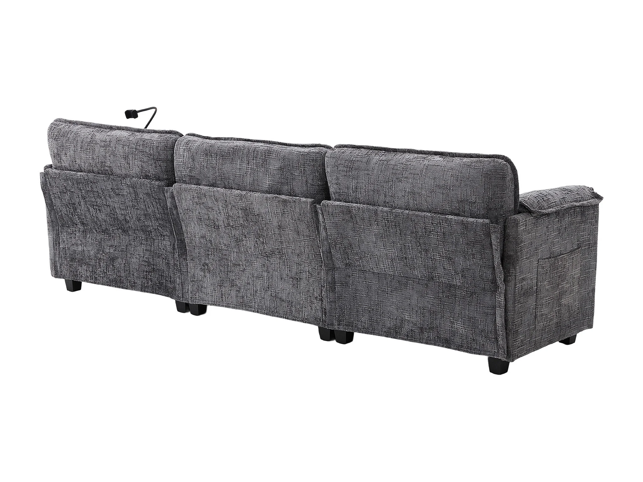 Sofá de 3 plazas con otomana - Sofá esquinero con soporte para teléfono y bolsillos laterales - chenilla gris