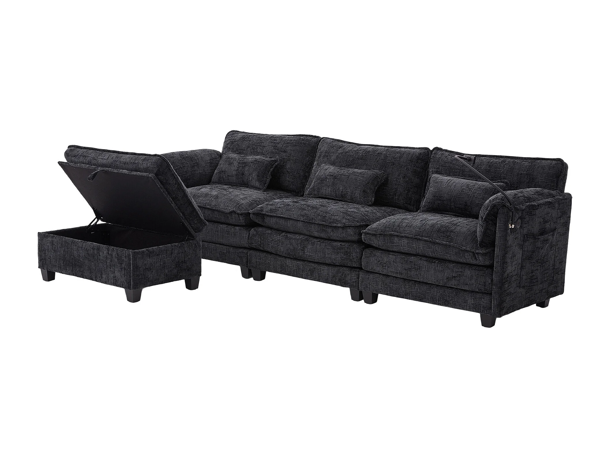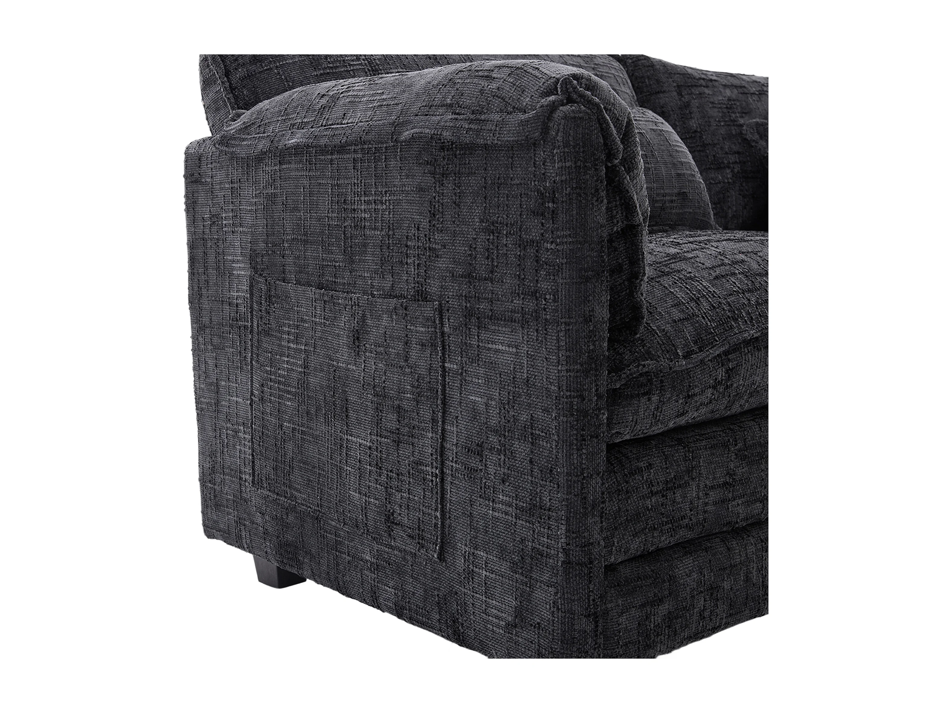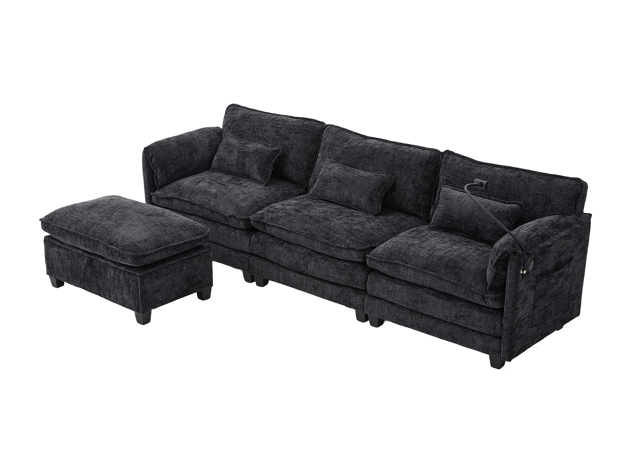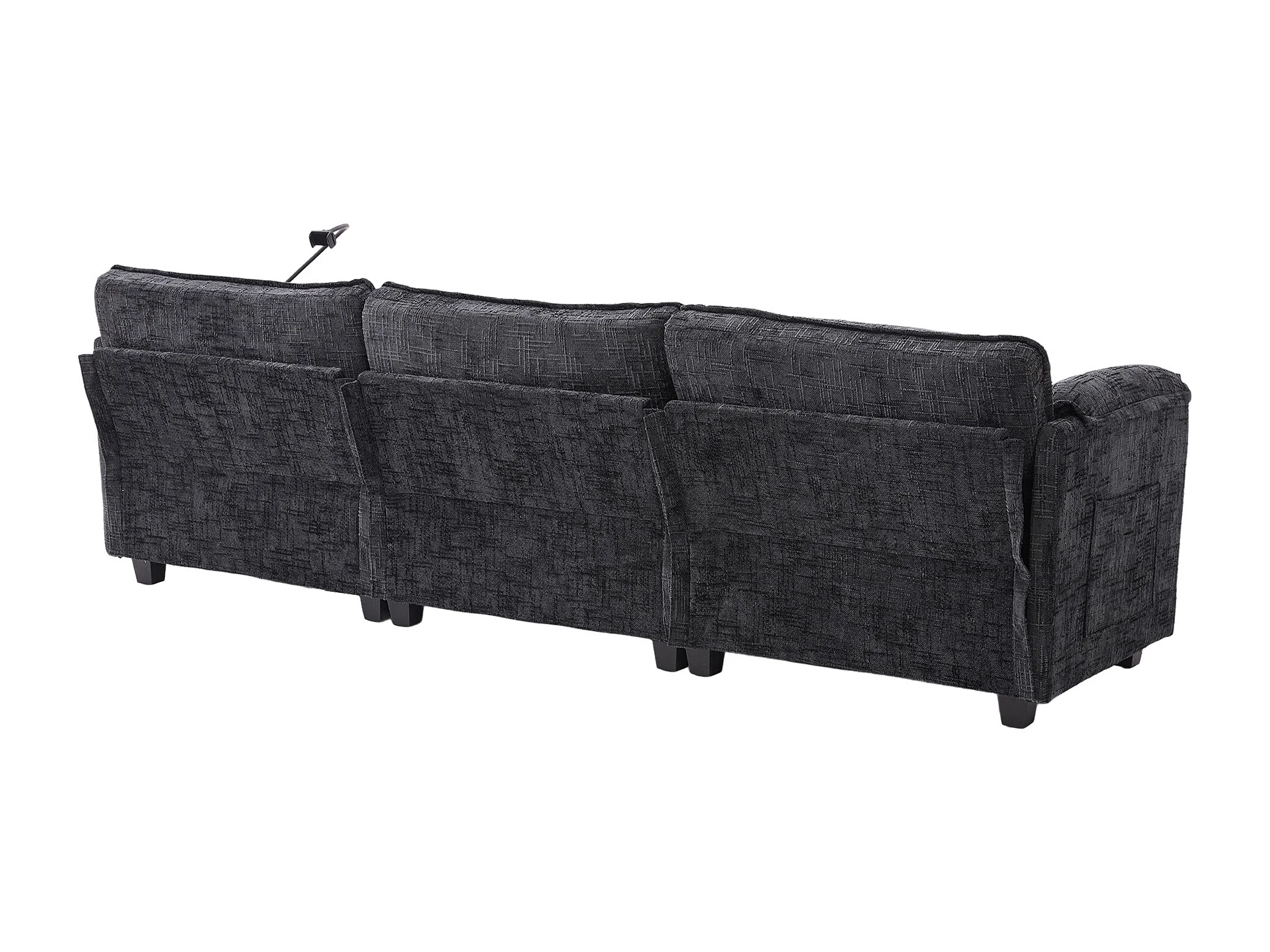 Sofá de 3 plazas con otomana - Sofá esquinero con soporte para teléfono y bolsillos laterales - chenilla negra