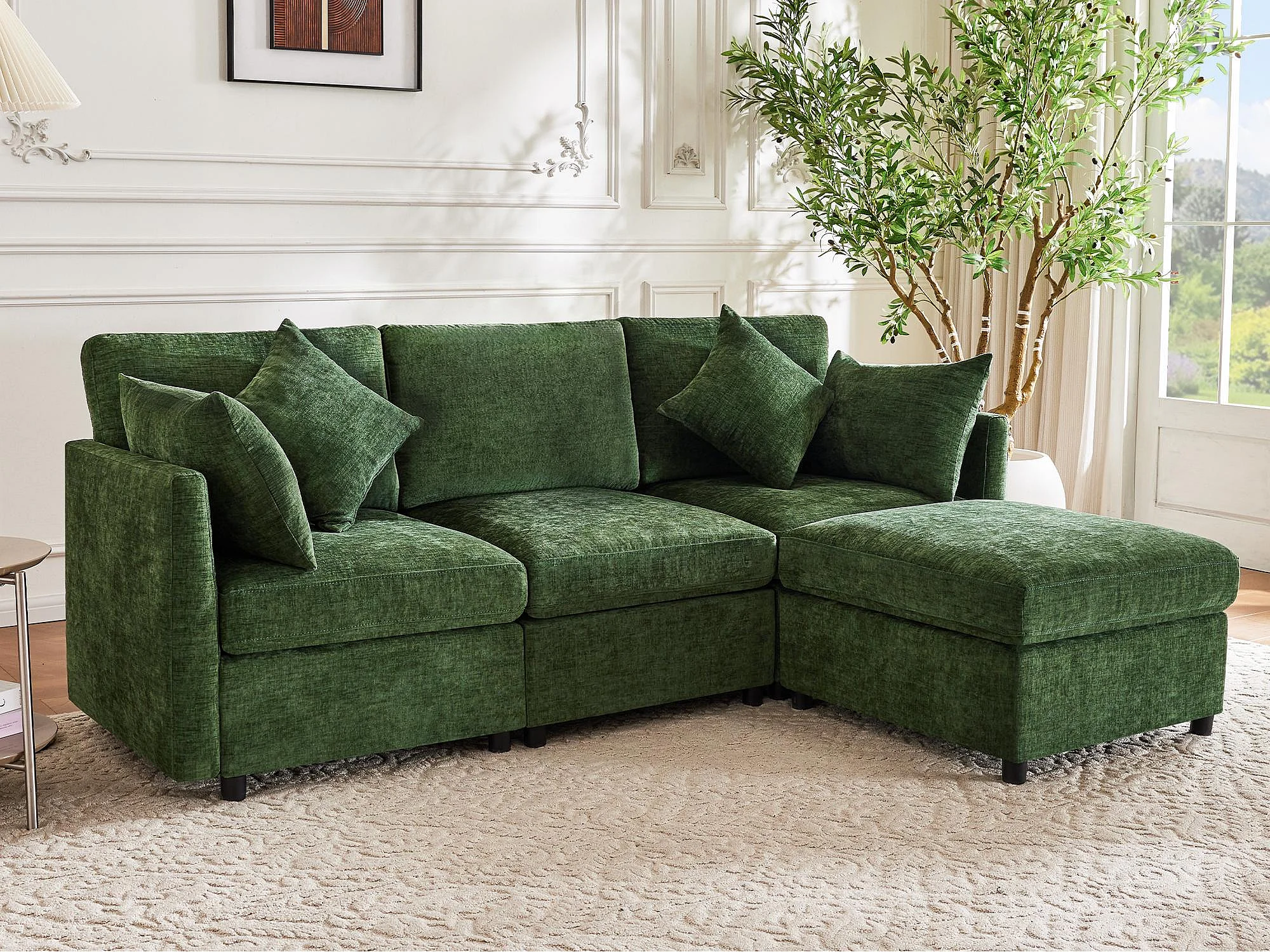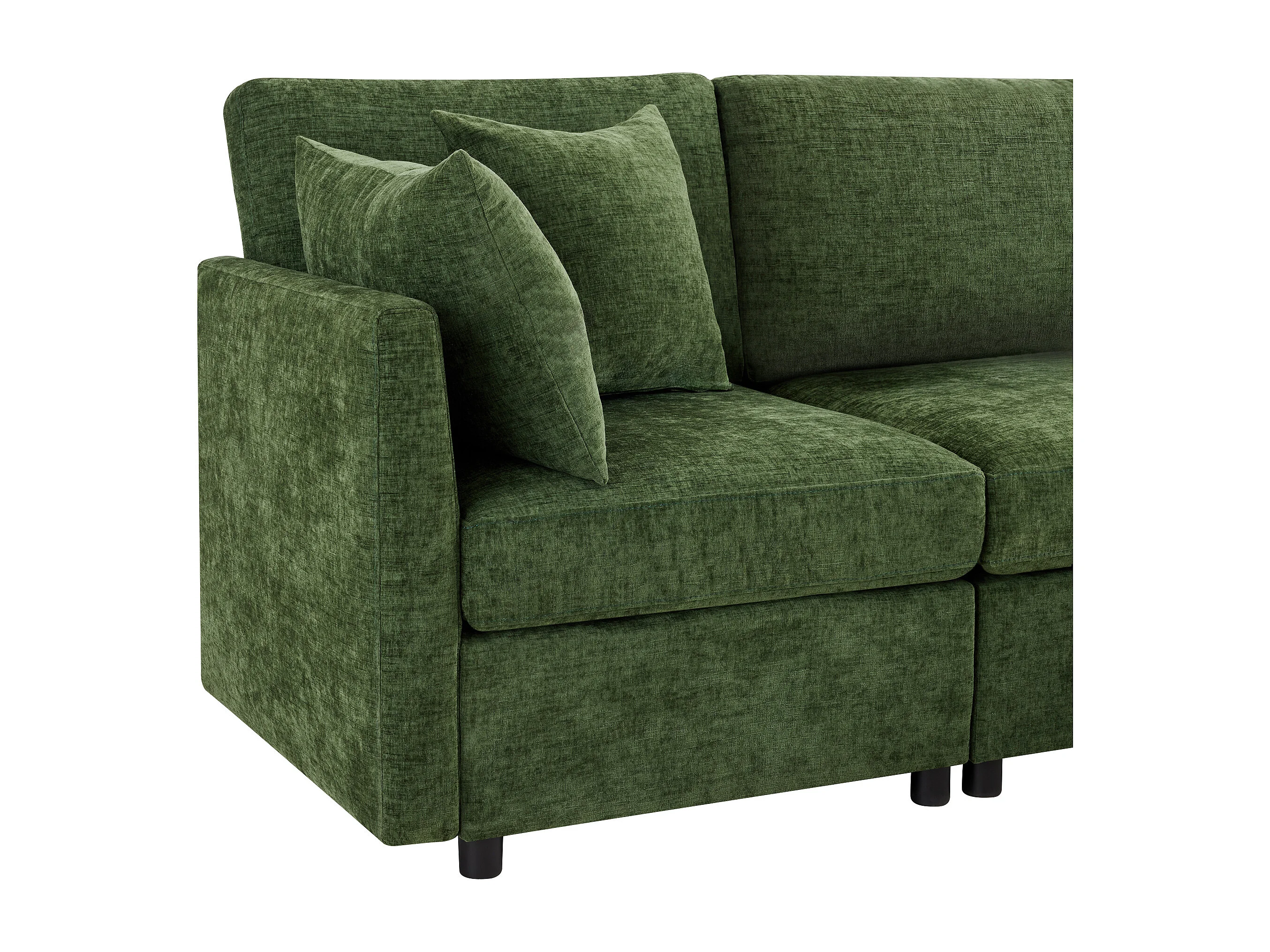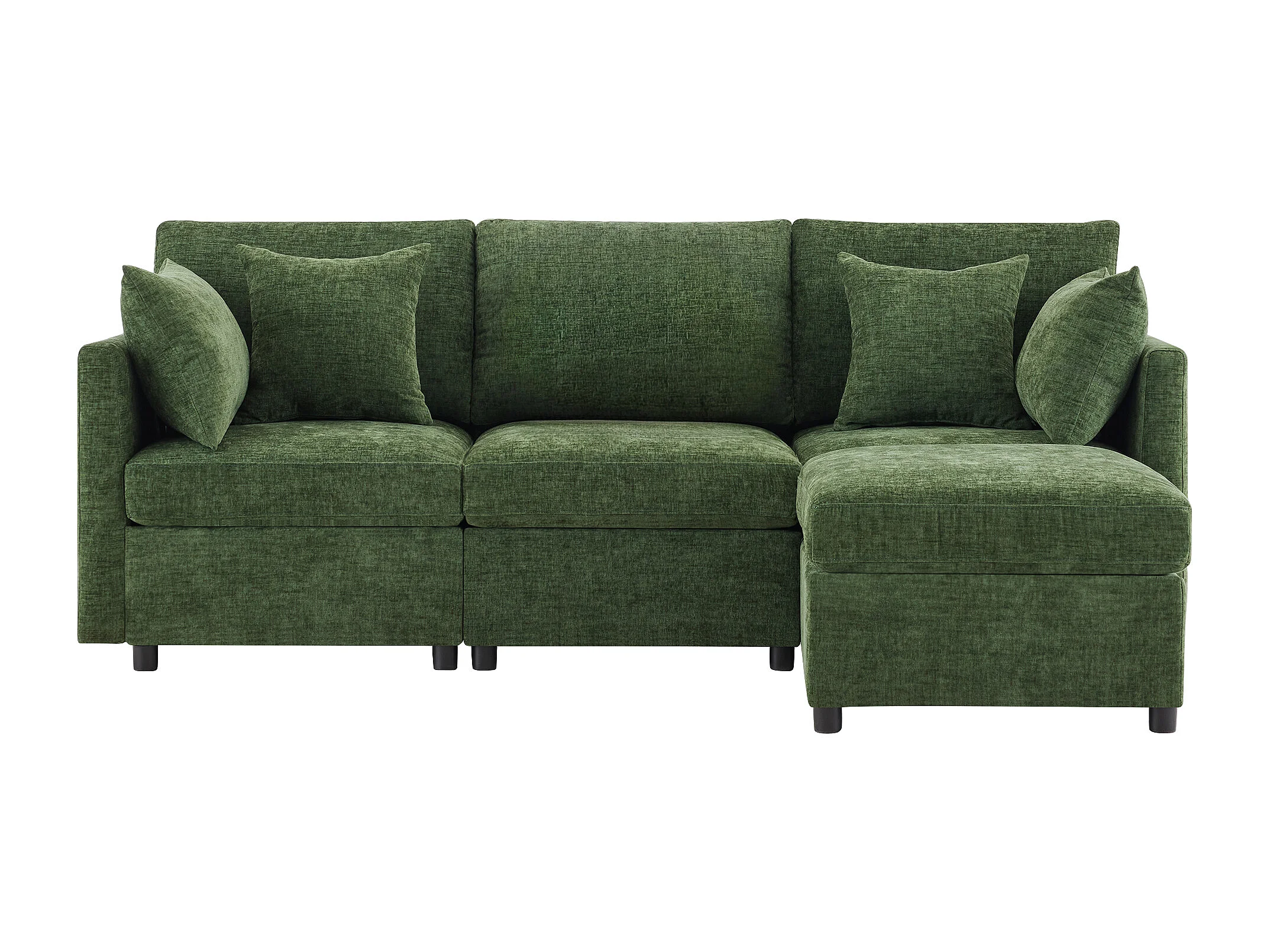 Sofá de esquina en L - tres plazas - con puf extraíble - con 4 cojines - tela de chenilla - verde