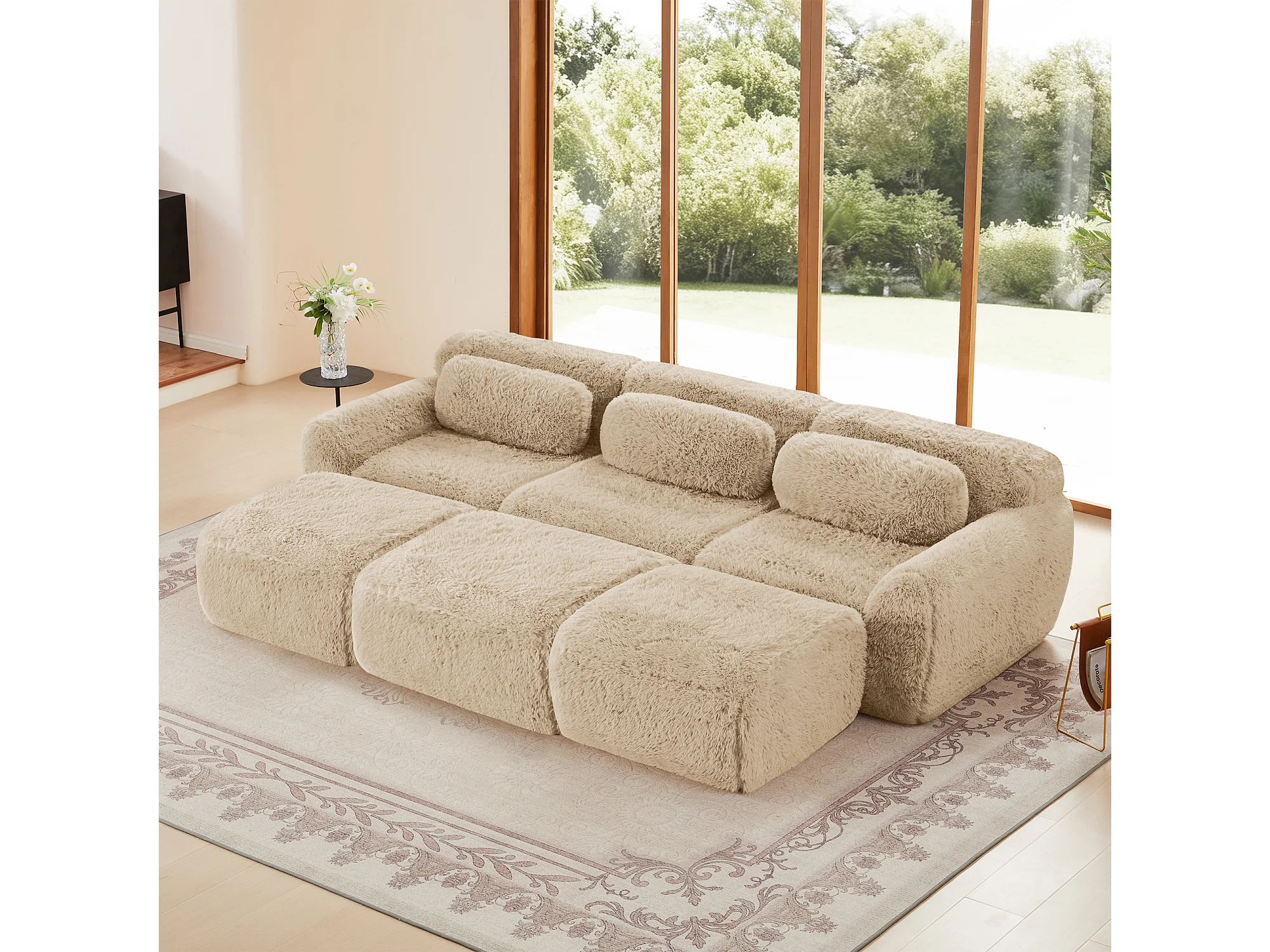 Sofá de Esquina Modular en tela peluche, con 3 poufs y 3 cojines, 291x179x73cm, Caqui