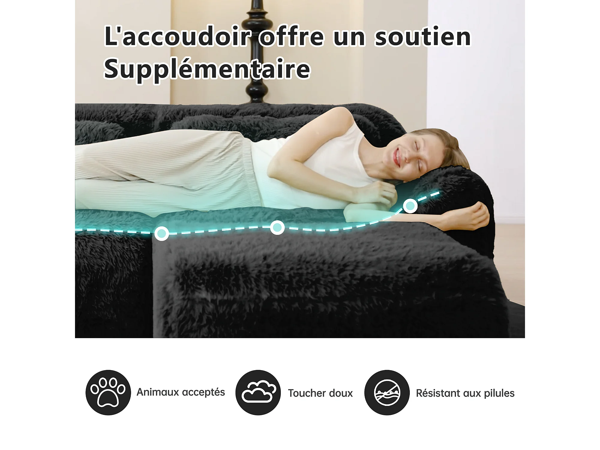 Sofá de Esquina Modular en tela peluche, con pouf y 4 cojines, sin estructura, 378x179x73cm, Negro