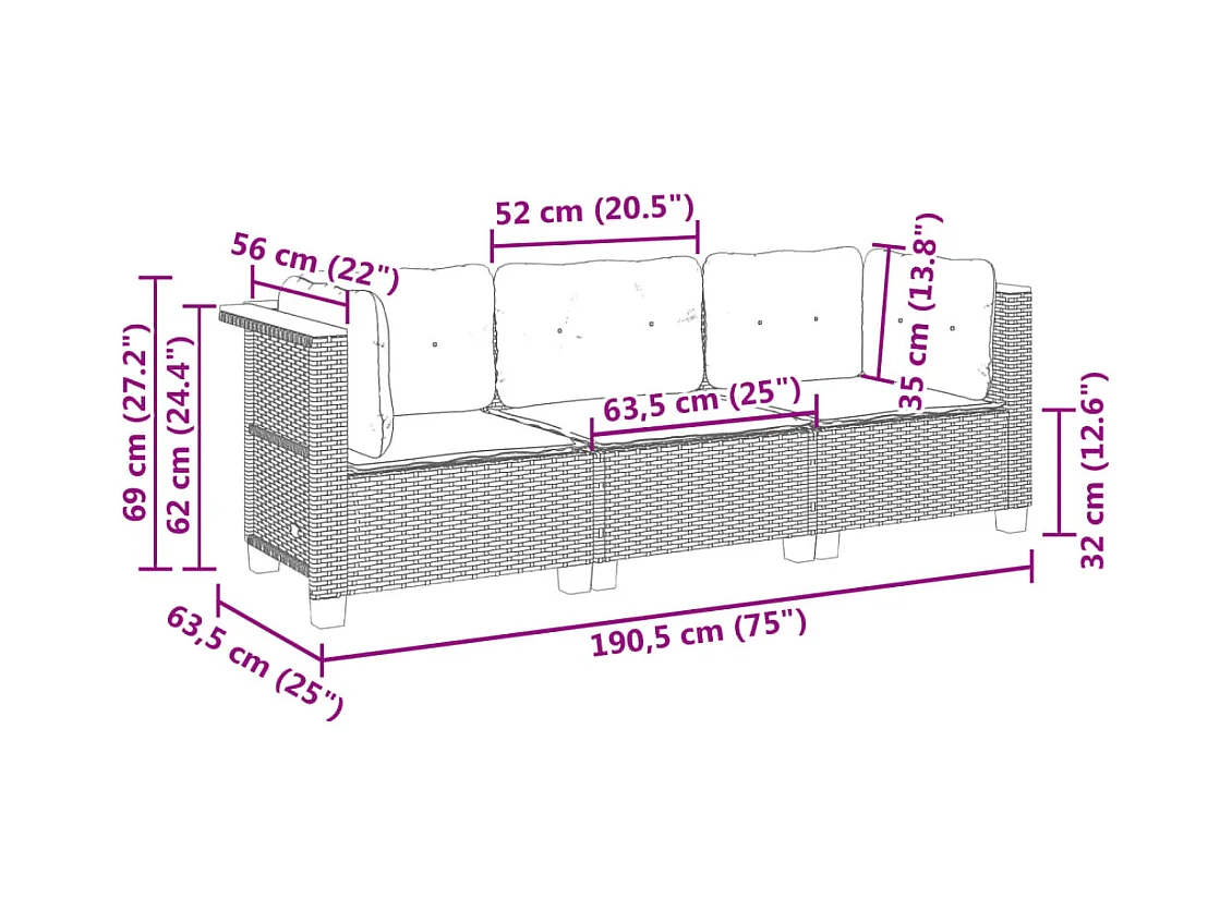 Sofá de jardín con cojines de resina trenzada de 3 plazas en gris