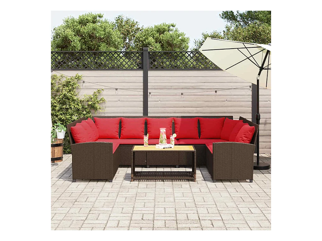 Sofá de jardín en forma de L con mesa y cojines ratán PE marrón