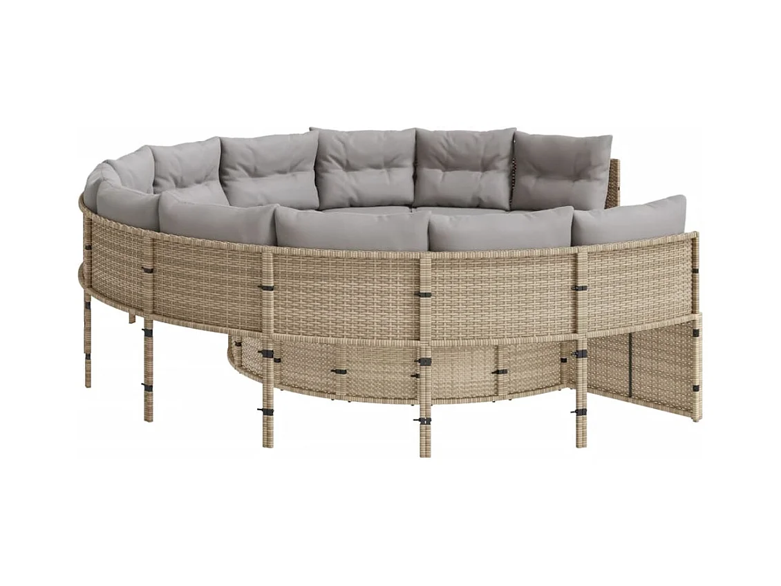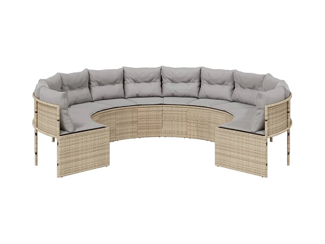 Sofá de jardín con cojines semicirculares de resina tejida en color beige.