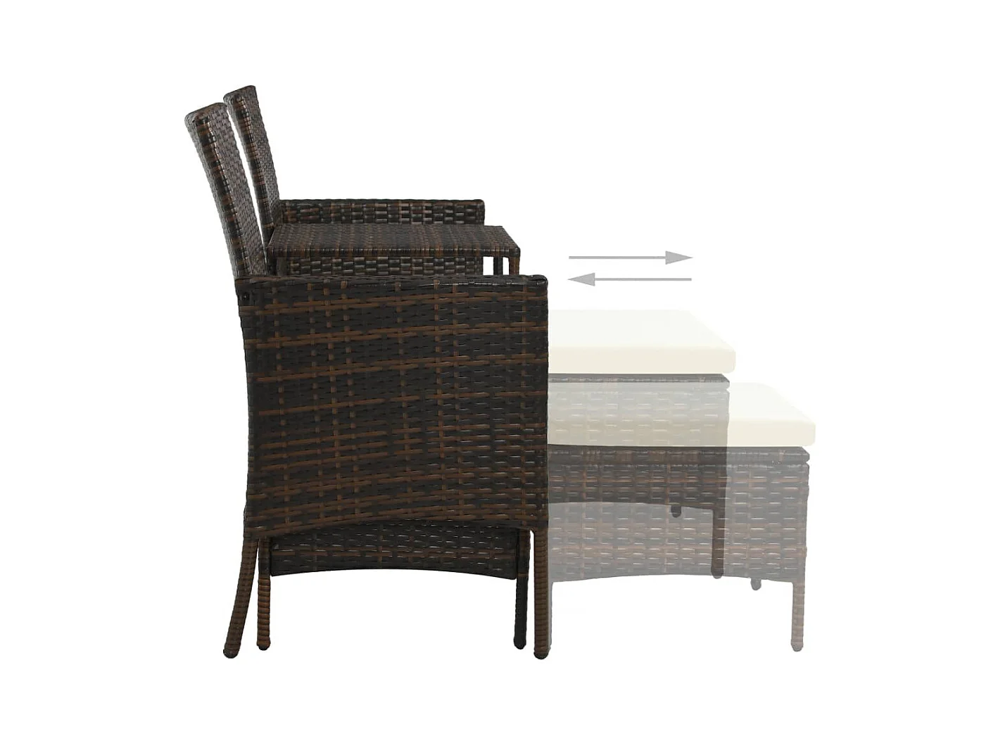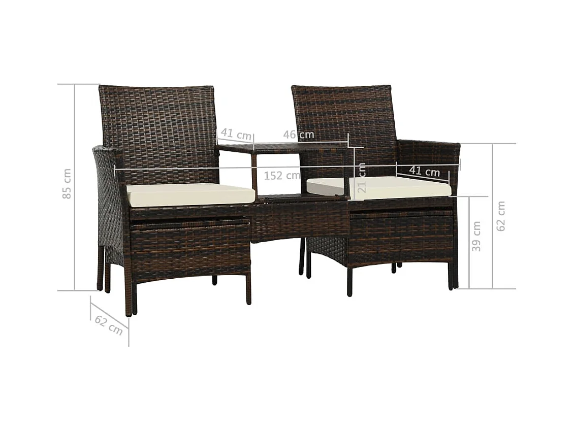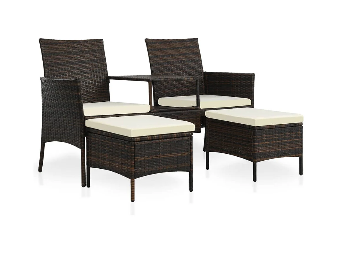 Sofá de jardín, mesa de té y taburetes de resina tejida marrón.