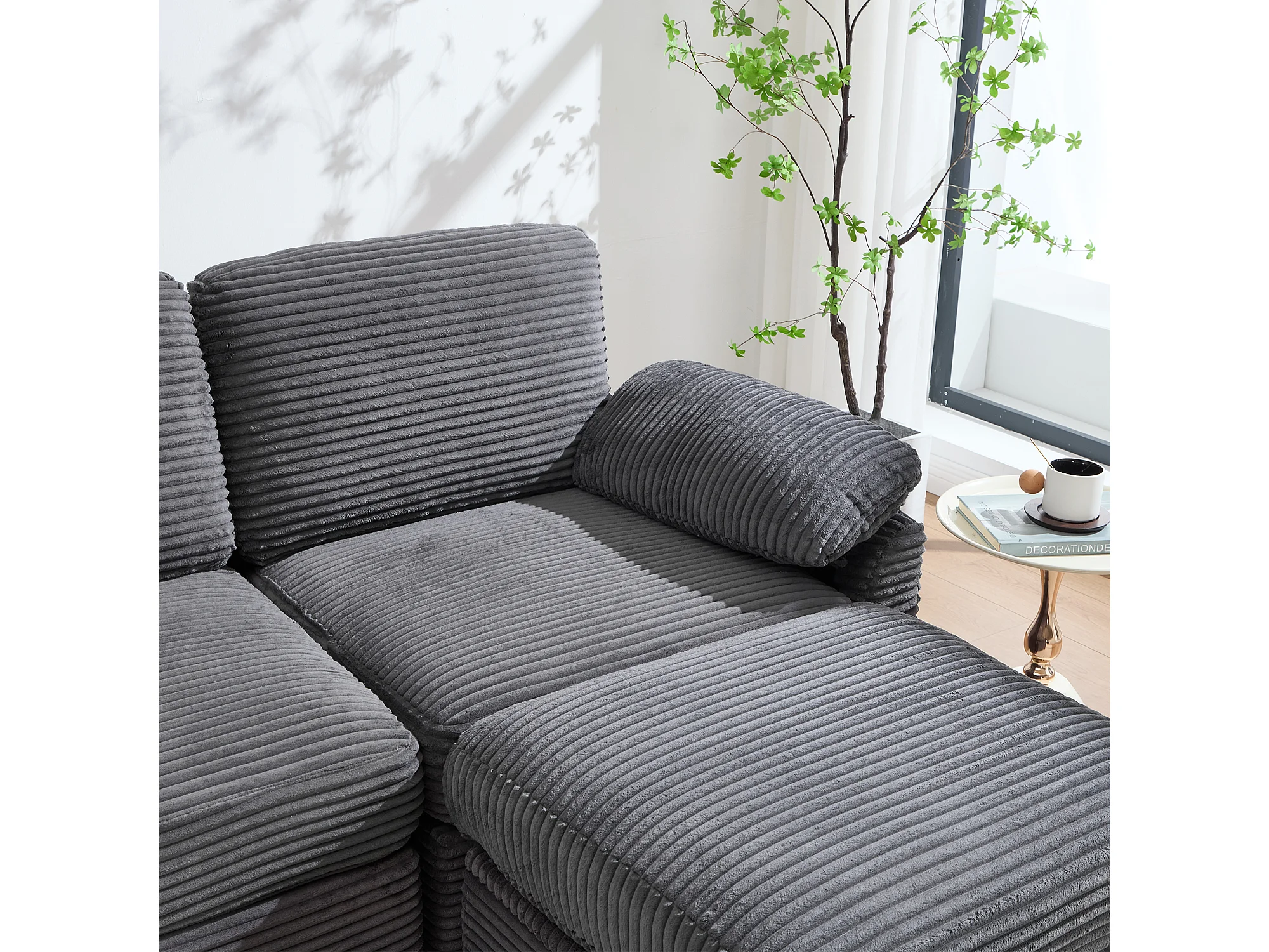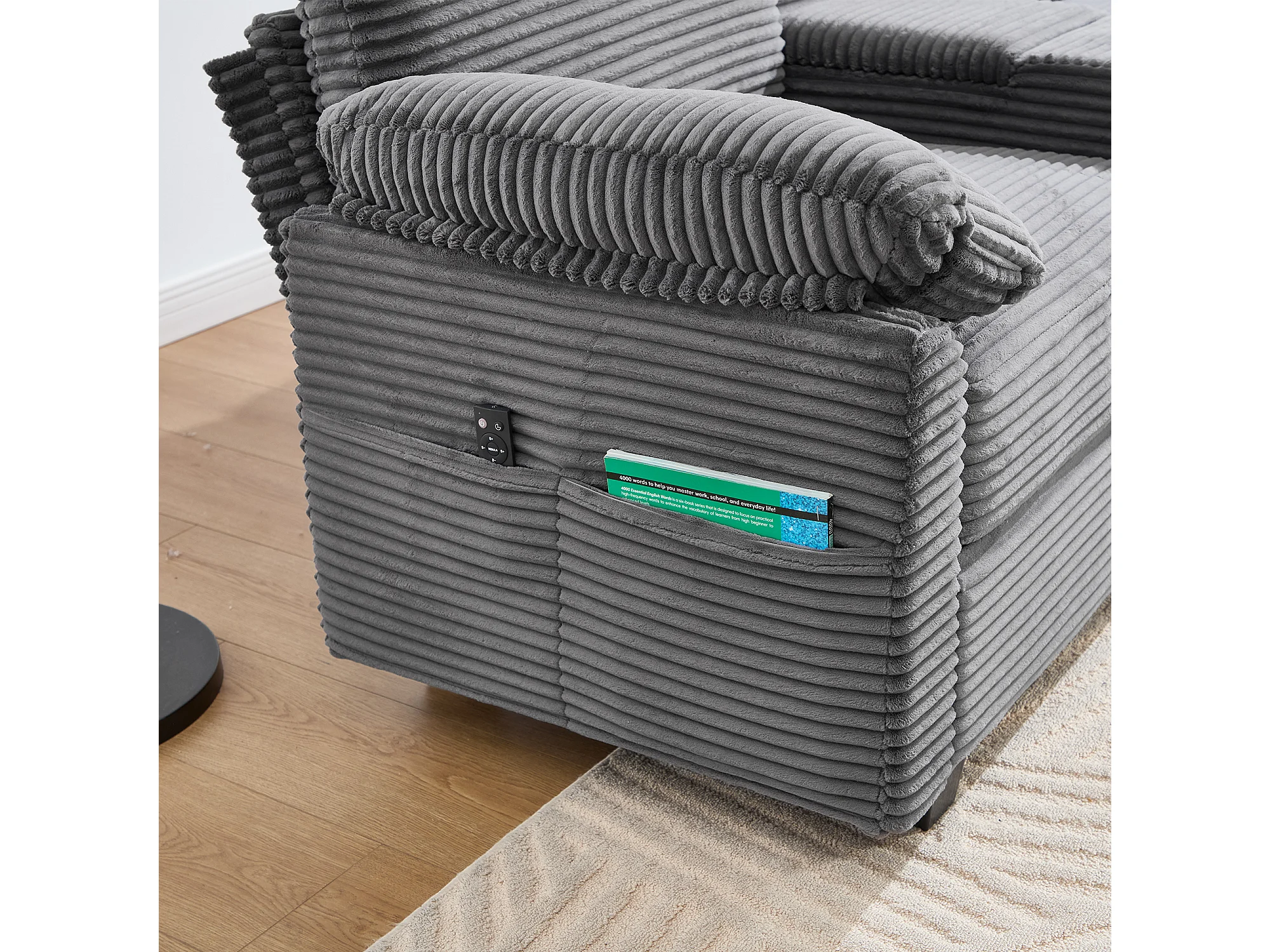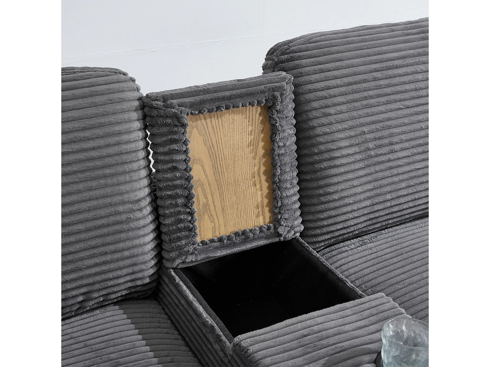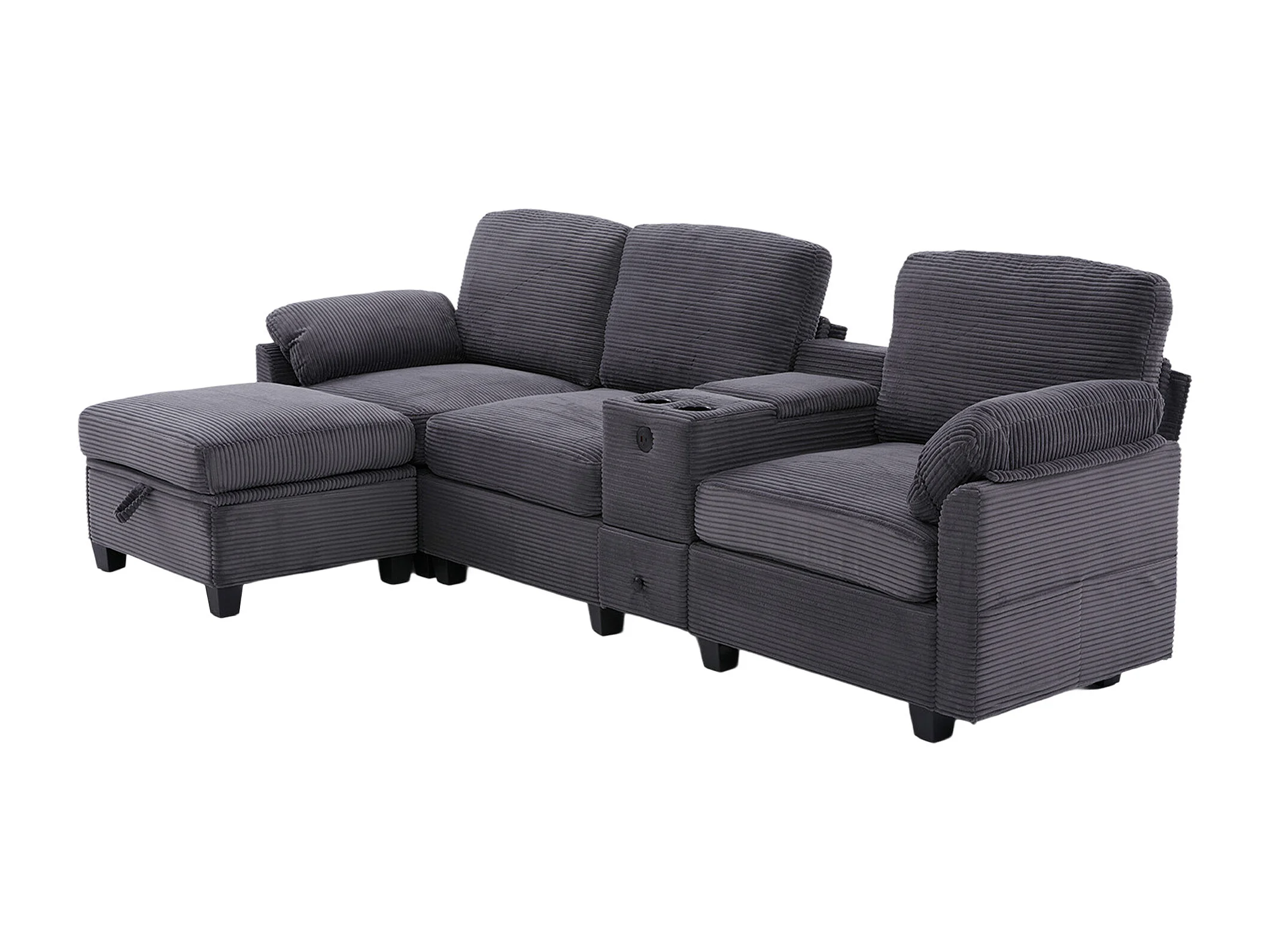 Sofá 266x136x82 cm, espuma viscoelástica, consola central deslizante con portavasos, USB C, pana gris oscuro