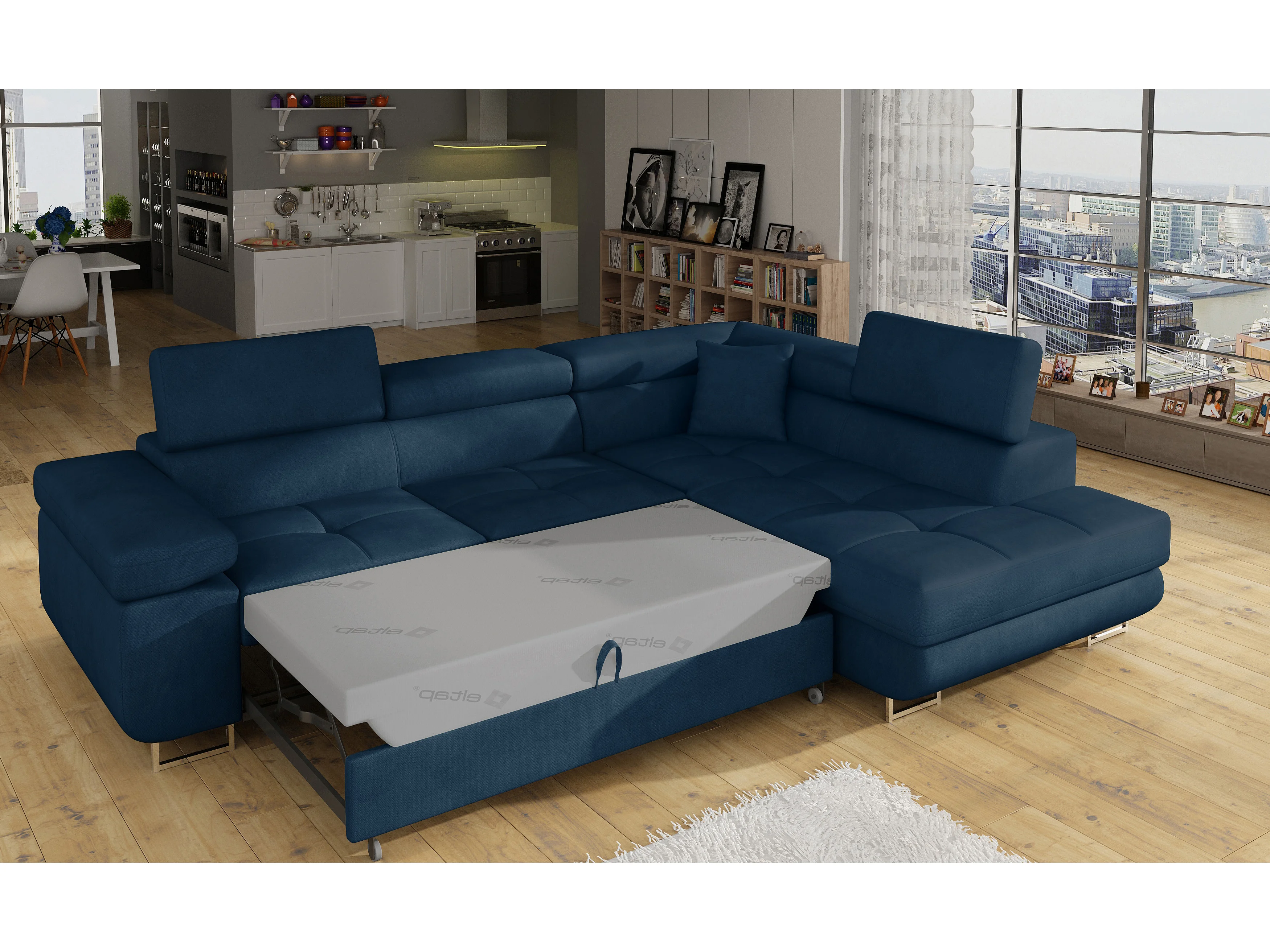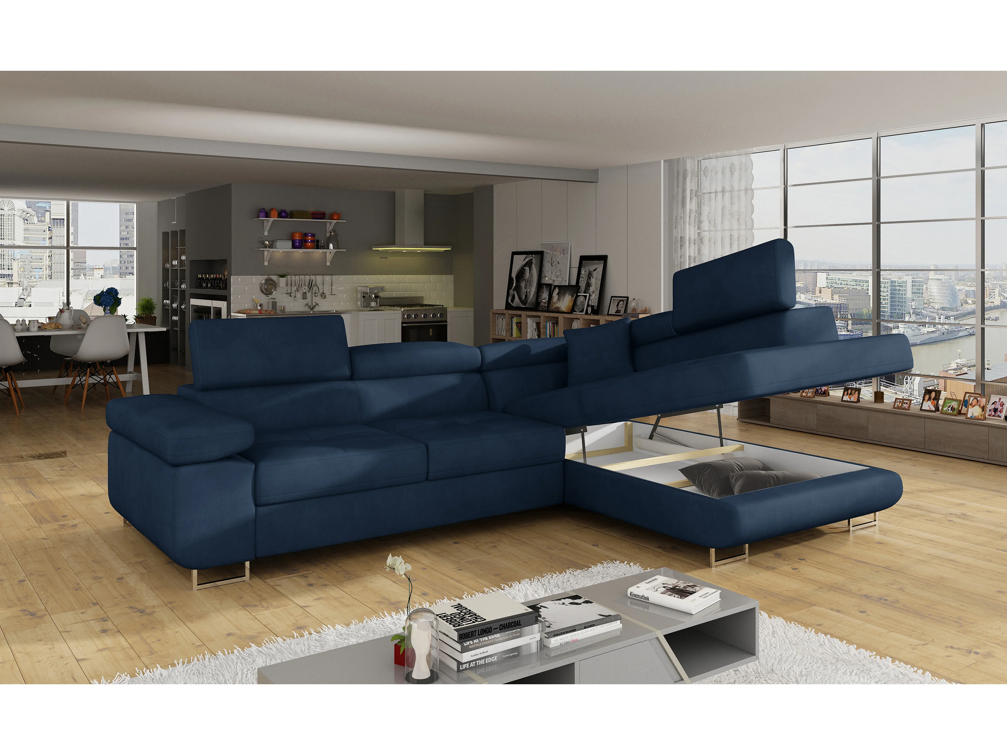 Sofá esquinero convertible en terciopelo con reposacabezas elevables - Colección Marka-Azul oscuro-Ángulos rectos